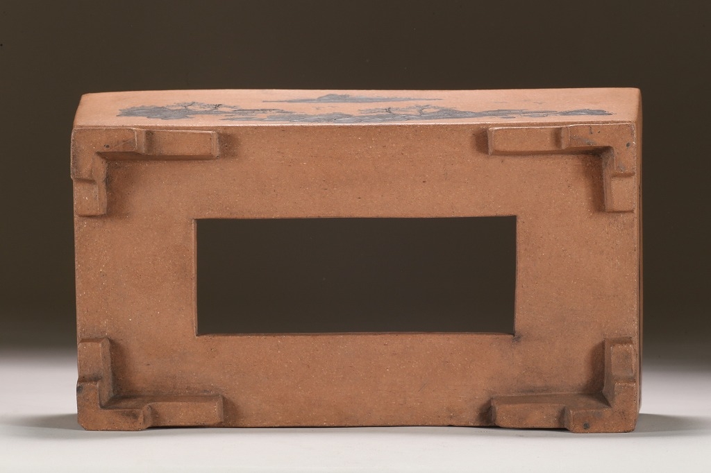 吟味された紫砂胎土、数少ない“黒絵“の山水図。もし古渡物でこの鉢が現存するなら、50~100万は必至の価値あるもの。たとえ“後作“とは言え、中品盆栽用の実用名器として廉価なご紹介です。僅かな窯線と足ホツは上々の保存状態と言えます。