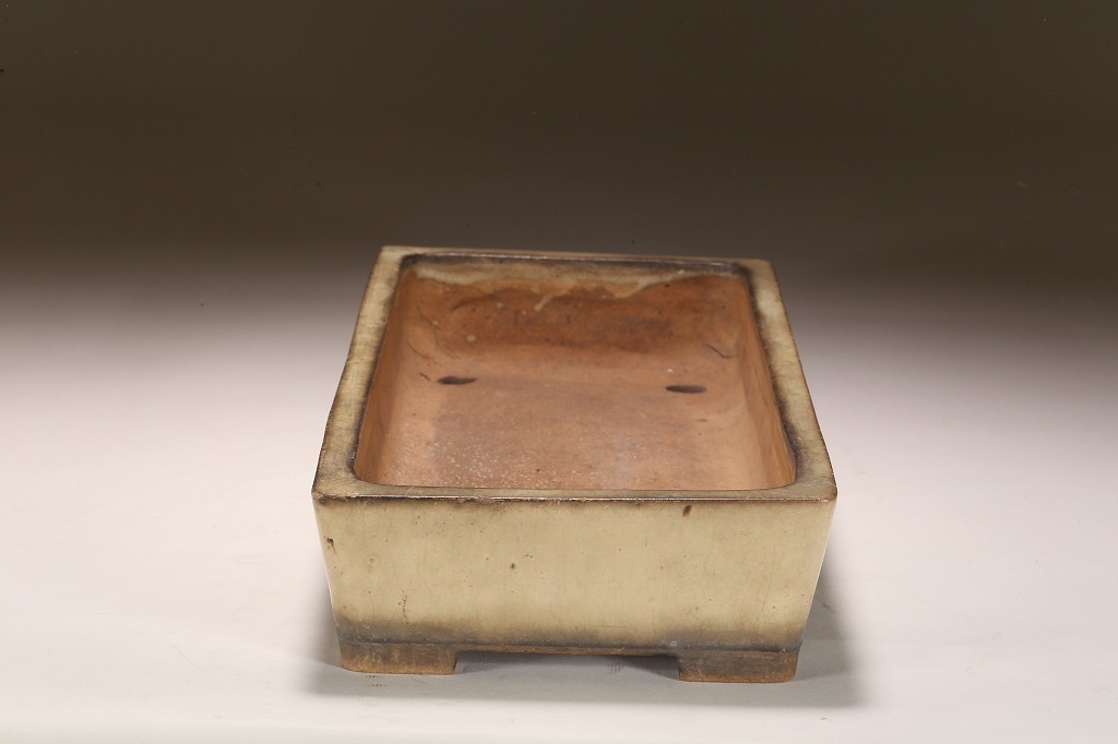 装飾性の殆どを省き、シンプルな中に辿り着いた器形の美。そのような言葉が似合う、名印「留佩」の白交趾鉢です。絞り込んだ奥行きが、古典的な味のある盆栽にはうってつけです。縁周りなどに、僅かな隙や見えぬ程のホツがありますが、“実用の美“の価値は普遍です。