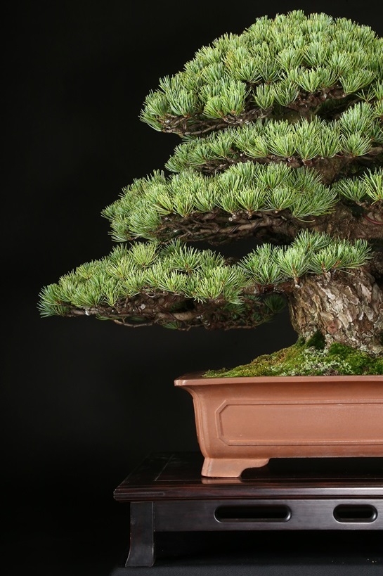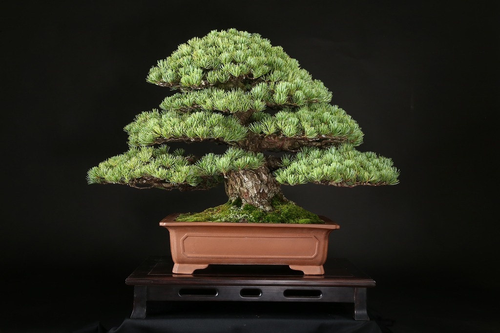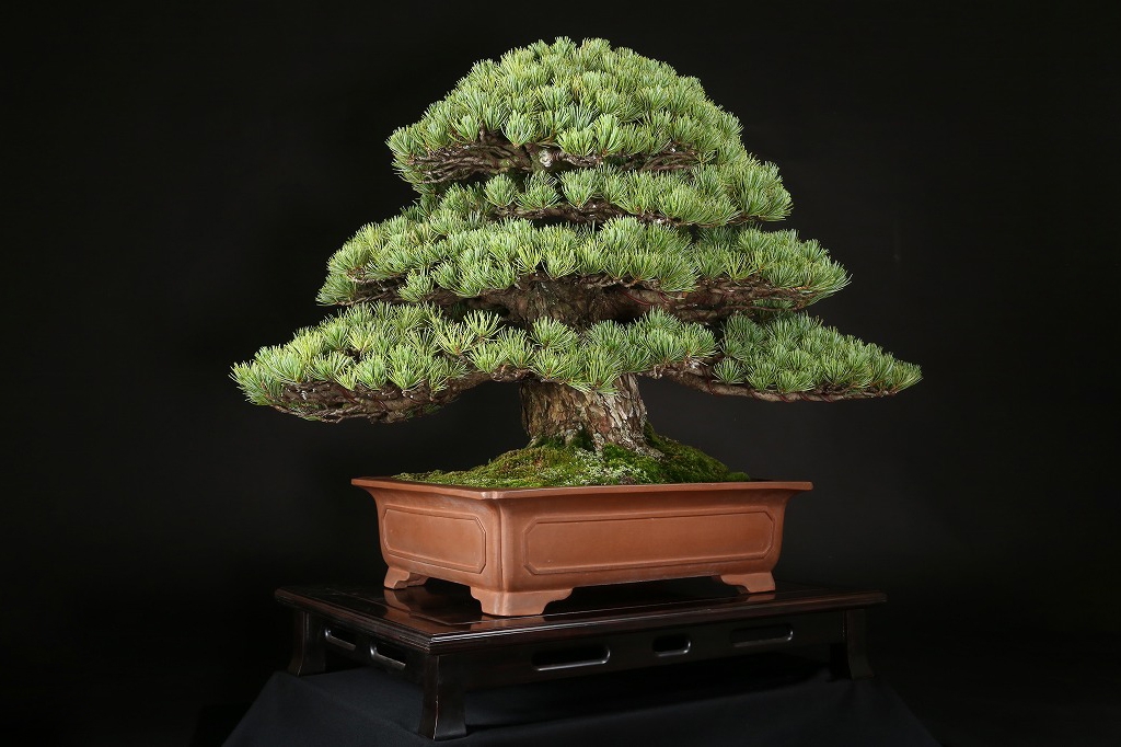 圧巻の立ち上がりの姿、鳳のように広がる枝姿、まさに能舞台の“鏡松“を彷彿させる“大樹の相“を見事に具現した作品と言えます。畑作りの樹では表せない風格が、長年の鉢づくりによって現れています。丈夫で葉の伸びも起きない誰もが持ち易い必見の一樹です。