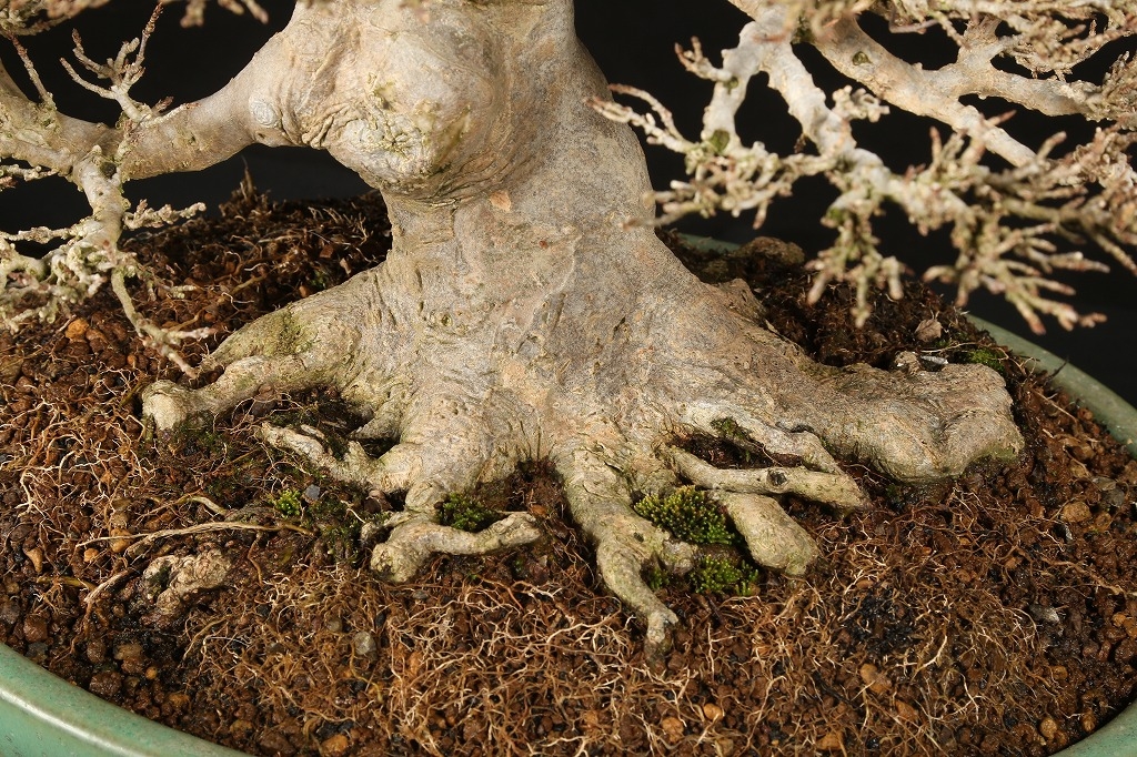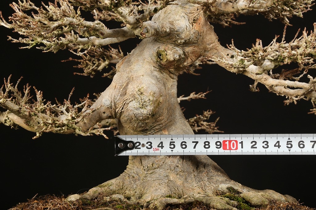 国風展中品部門への可能性を秘めた逸材楓です。八方に広がる美しい根張り、僅かな寸尺の中で、大樹のそれと同じ丸幹の模様、何よりも樹冠まで丹精の限りを尽くした細やかな枝作り。すべての条件を満たした将来の中品名木をご覧下さい。