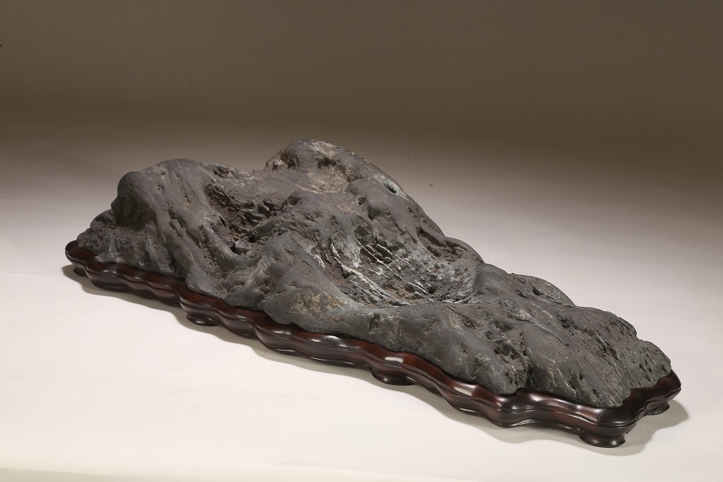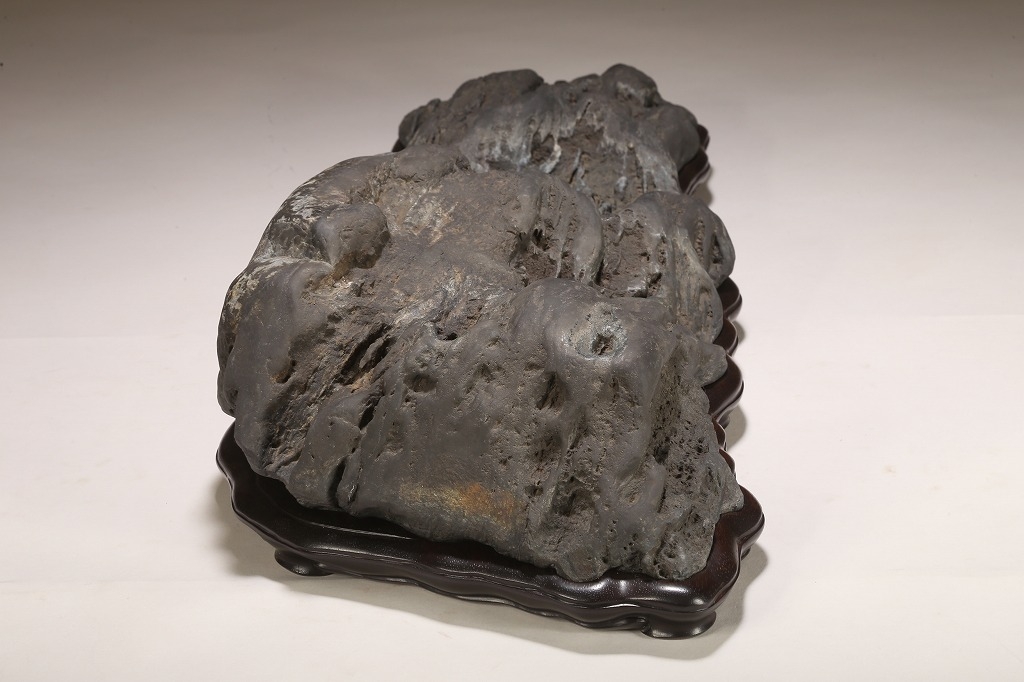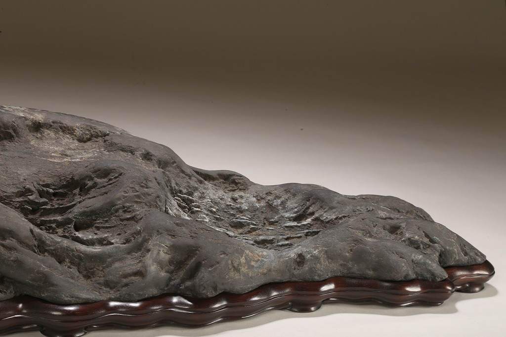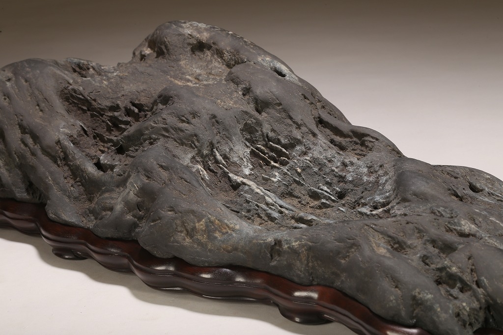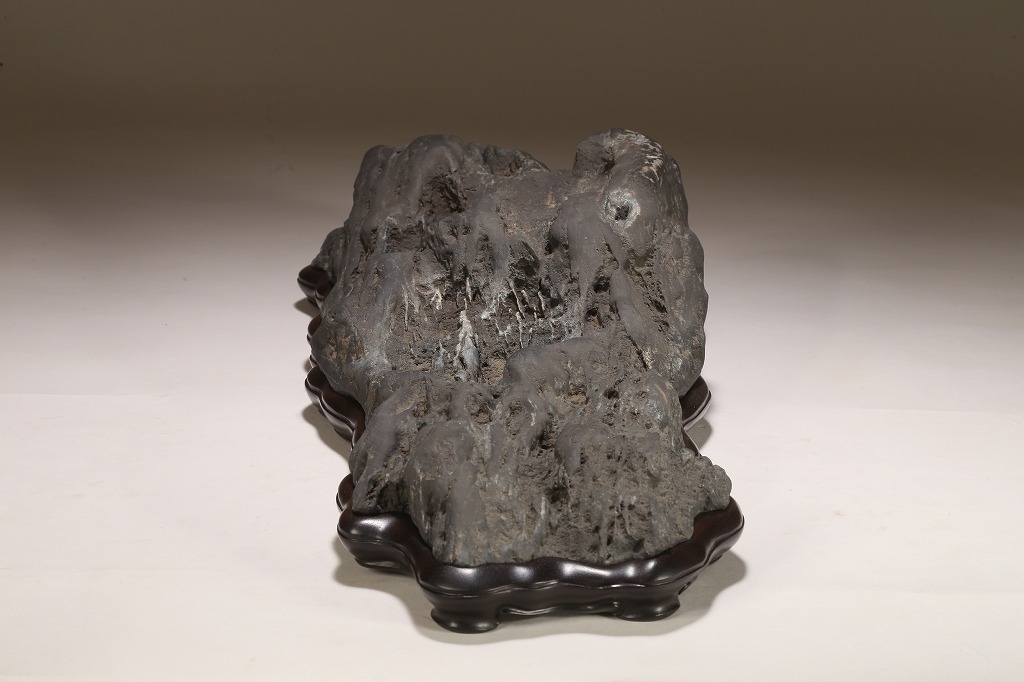 雄大な山容を示す大型古石。石肌の古感は絶品と言える味わいです。石相の良さ・古さ、何よりも底部以外、これだけの大型遠山石にして、台上には一切の加工がありません。若き金子台座師の渾身の作台によって、本石は次代の賓石としての道を歩み始めるでしょう。逸品。