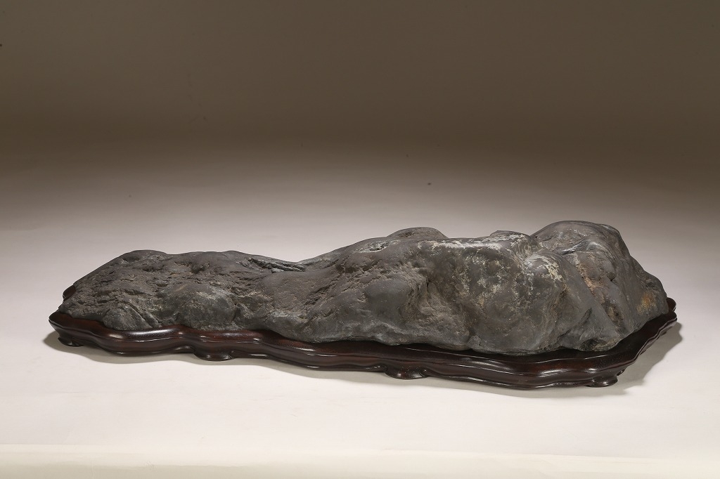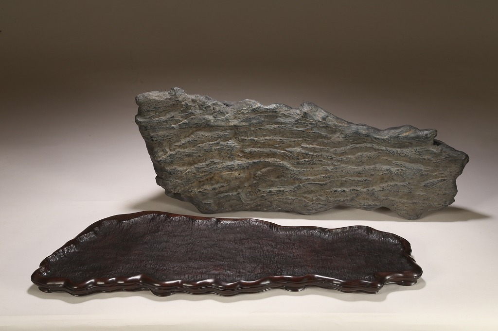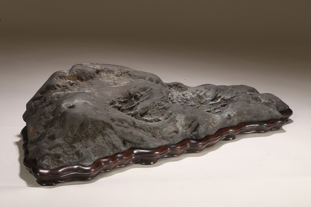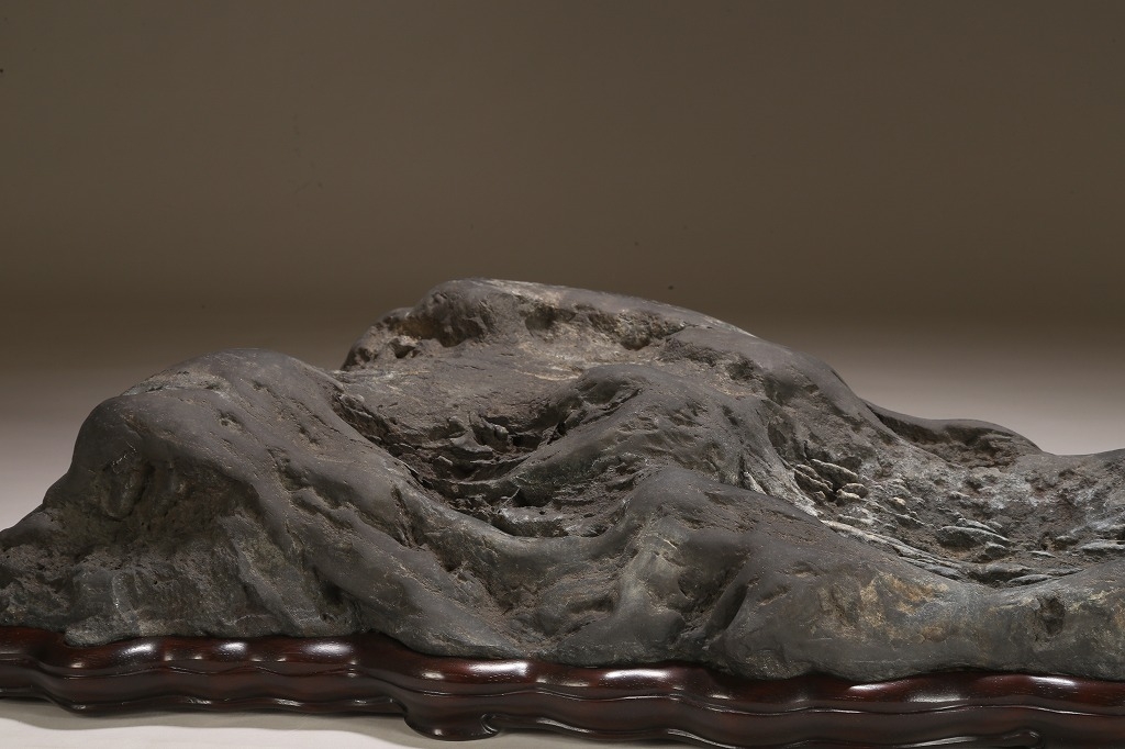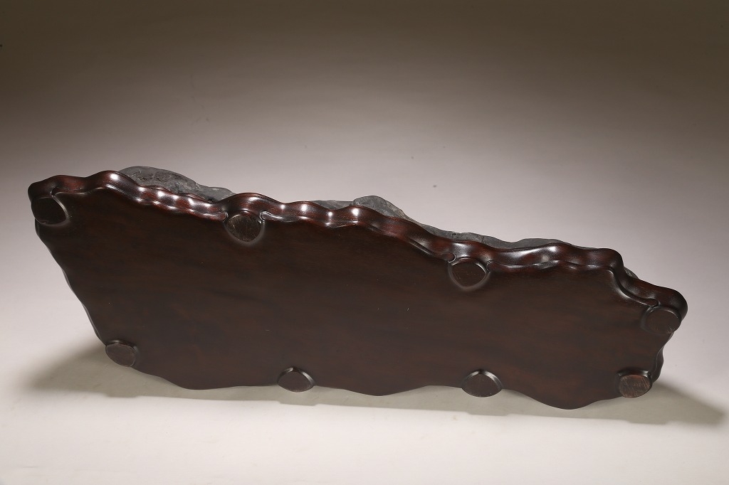 雄大な山容を示す大型古石。石肌の古感は絶品と言える味わいです。石相の良さ・古さ、何よりも底部以外、これだけの大型遠山石にして、台上には一切の加工がありません。若き金子台座師の渾身の作台によって、本石は次代の賓石としての道を歩み始めるでしょう。逸品。