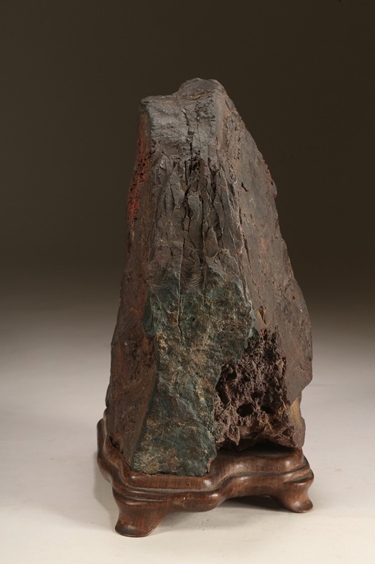 天部に一輪の満開の菊花、象徴的な花姿を持つこの石は、長く日本水石界を代表する、大家の所蔵石でした。台座縁部分が経年劣化で欠損している所がありますが、裏面故に展示には遜色ありません。