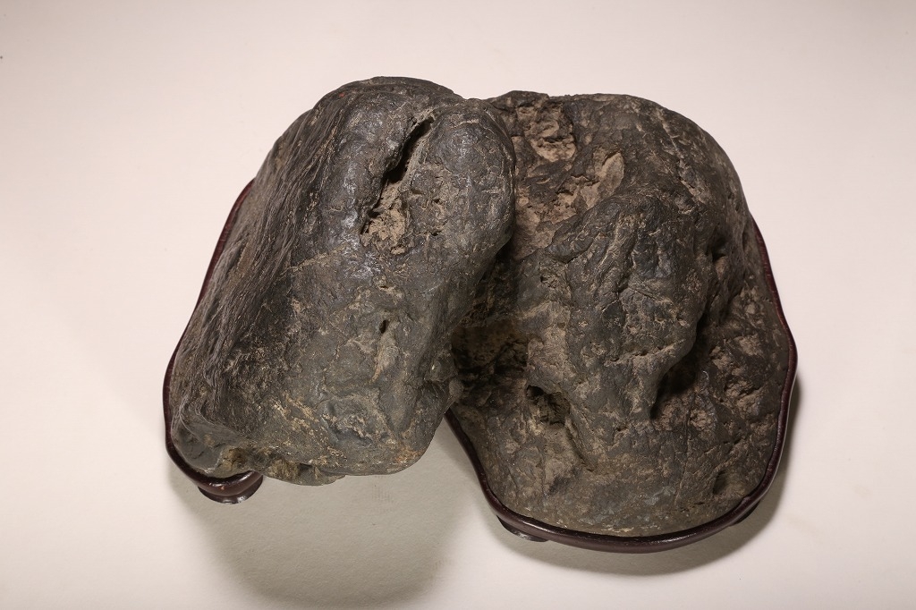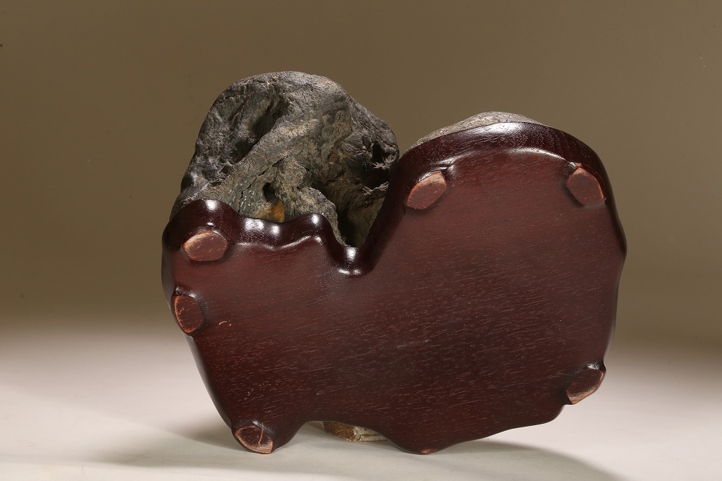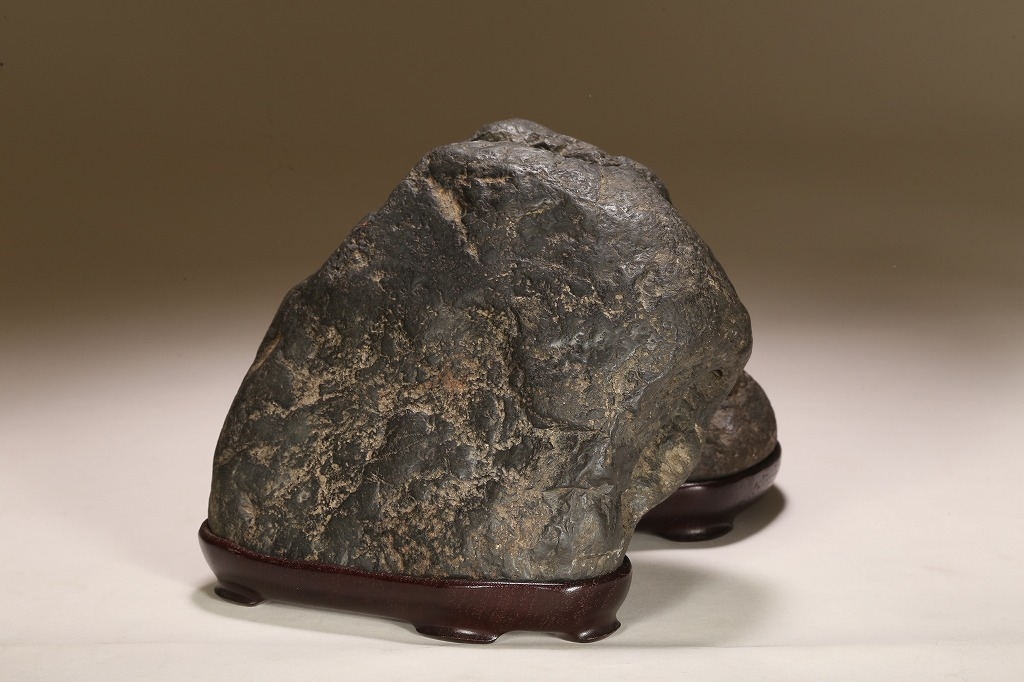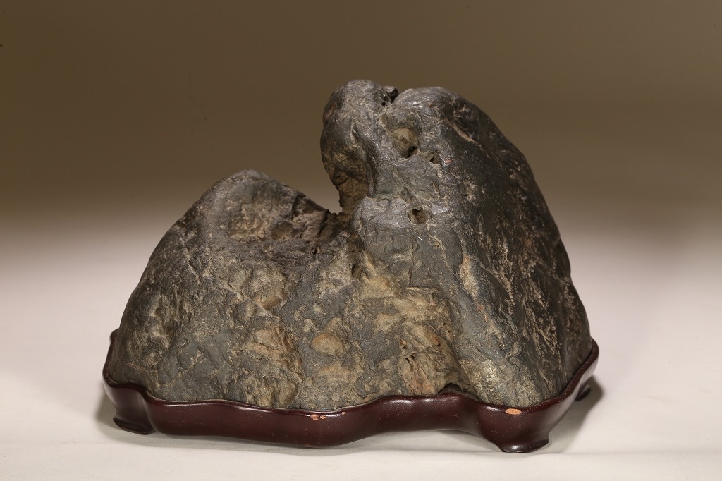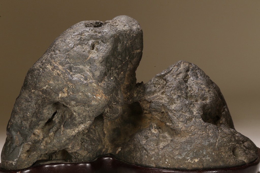 自然界の“色“を凝縮したような黒色を示す古石。険しい山岳型の中に深い渓谷と龍の咆哮を想わせる風穴。底面の擦り加工はありますが、台上の景趣は天然のものです。台座石としても水盤石としても“構えの良い“秀石です。