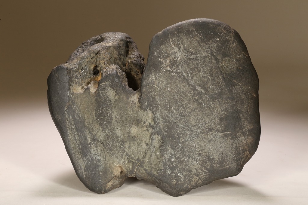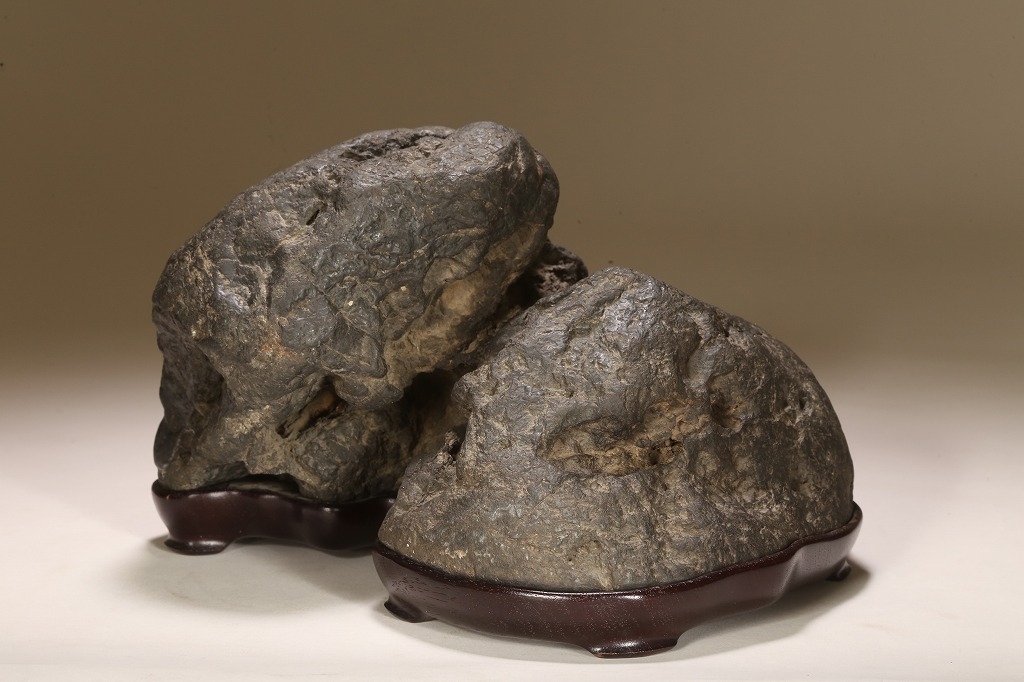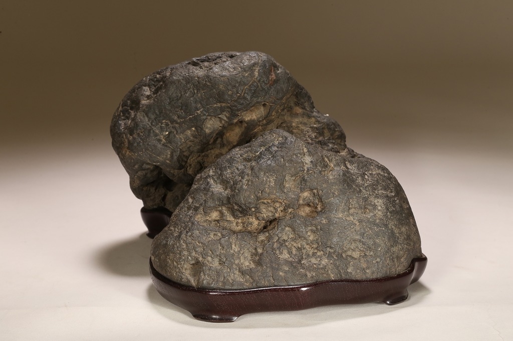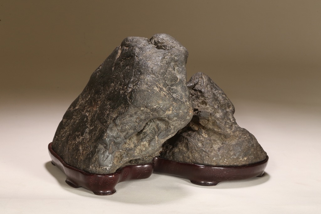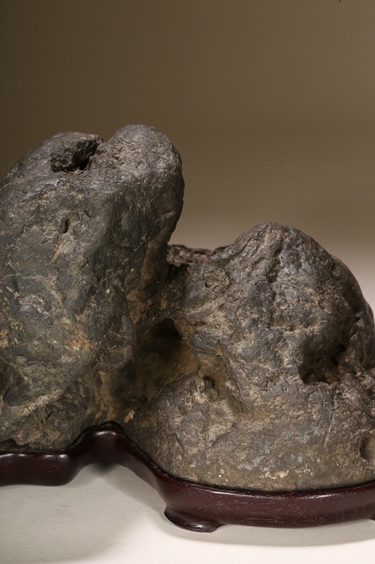 自然界の“色“を凝縮したような黒色を示す古石。険しい山岳型の中に深い渓谷と龍の咆哮を想わせる風穴。底面の擦り加工はありますが、台上の景趣は天然のものです。台座石としても水盤石としても“構えの良い“秀石です。