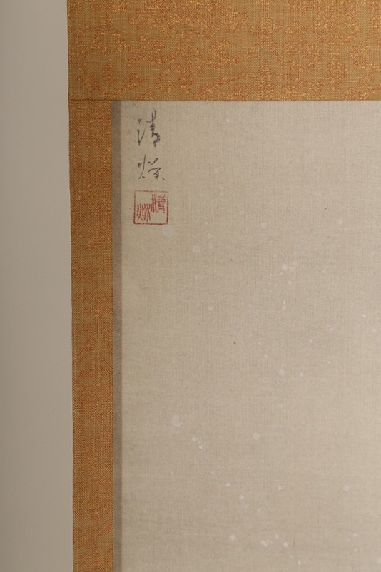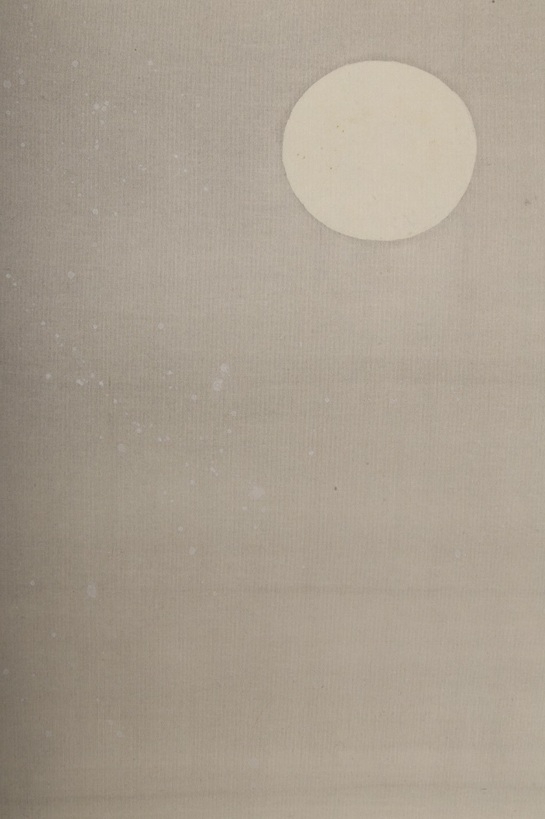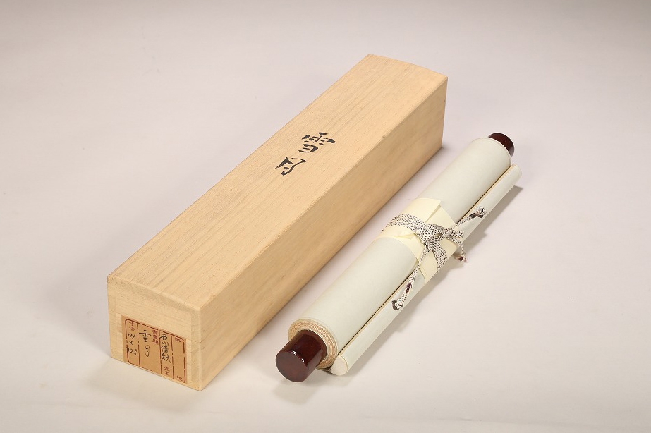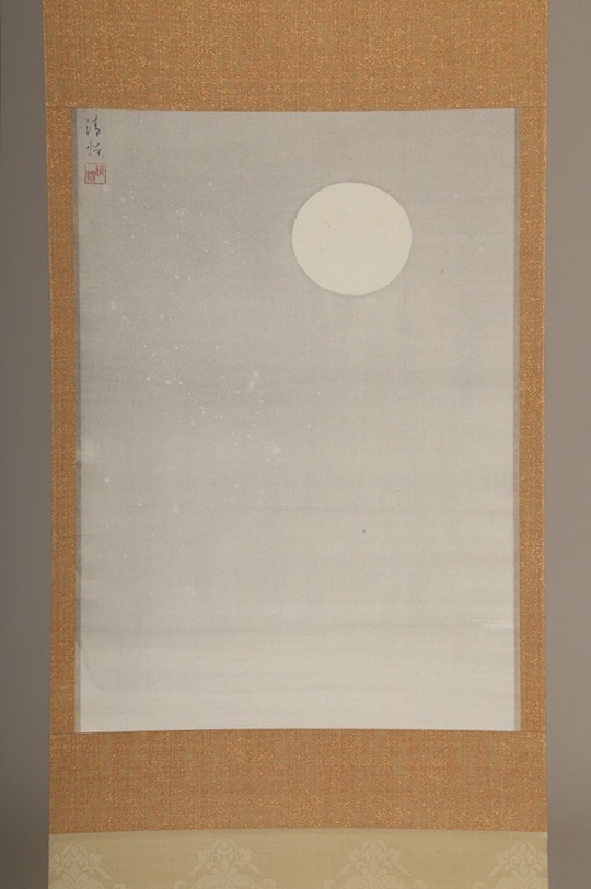 盆栽水石の飾り道具としての修練を10年続けた石川清秋氏の静謐な掛物です。雪降る薄暗い画面、そこに煌々と光る中天の月。寸法を含めて、樹や石を引き立たせる事に注力を注いだ労作です。表具も使い勝手に合わせて、名門古心堂による茶掛風としました。