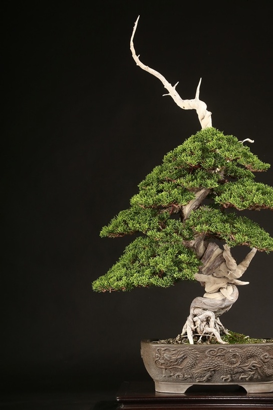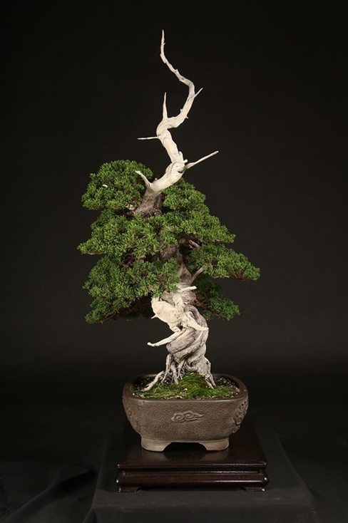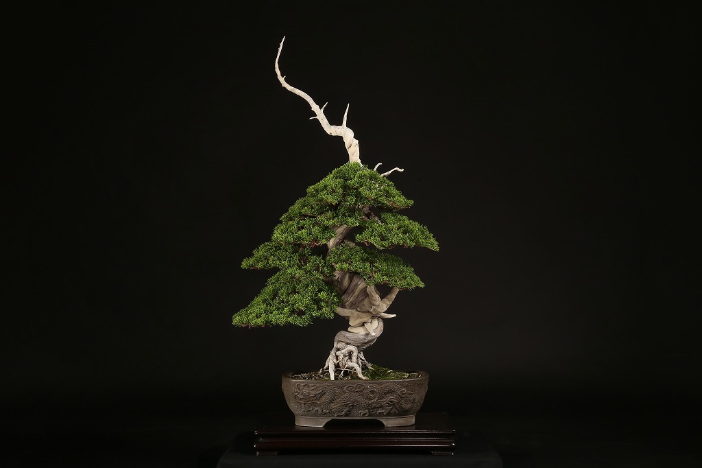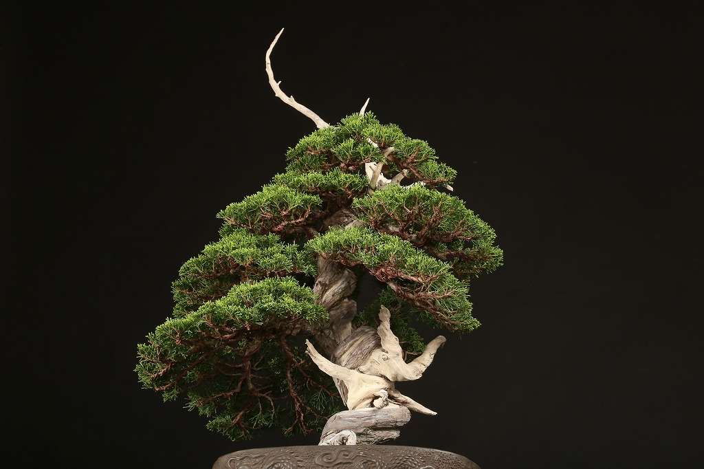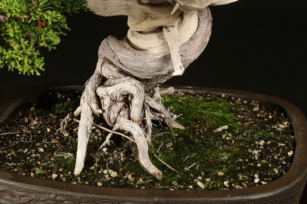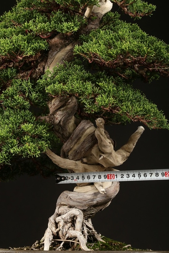 捻転芸見事な水吸いと舎利の姿、素材の頃に天部を舎利に仕上げ、中型作品とした逸品です。大型真柏と見紛う程の樹相、ここからの鉢合わせで、その価値は更に高みに行く必見の一樹です。