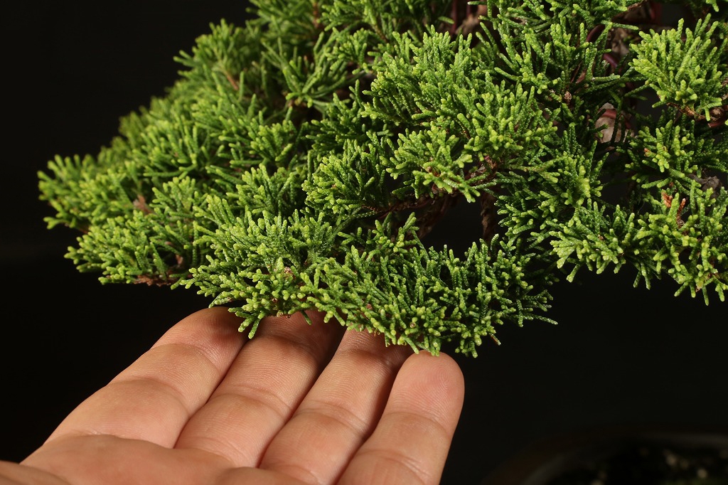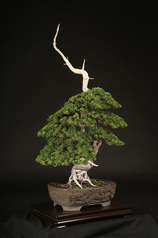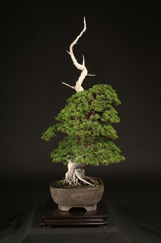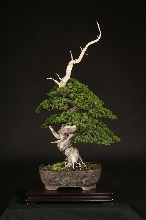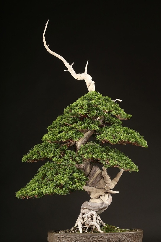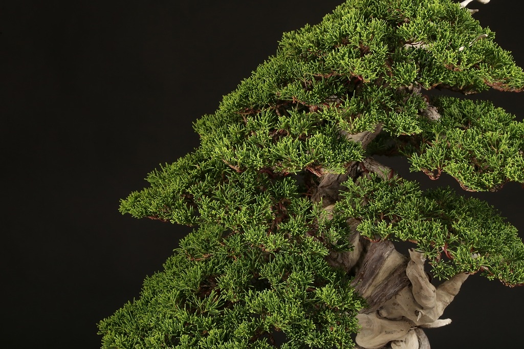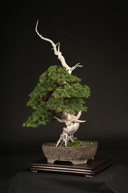 捻転芸見事な水吸いと舎利の姿、素材の頃に天部を舎利に仕上げ、中型作品とした逸品です。大型真柏と見紛う程の樹相、ここからの鉢合わせで、その価値は更に高みに行く必見の一樹です。