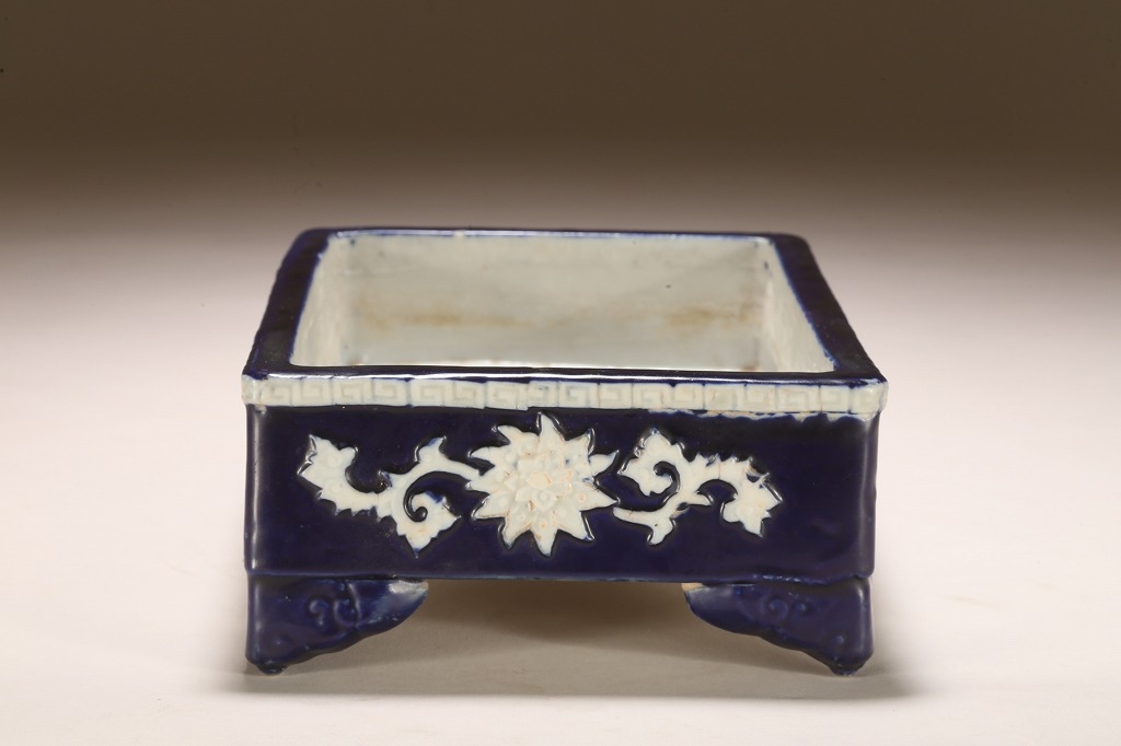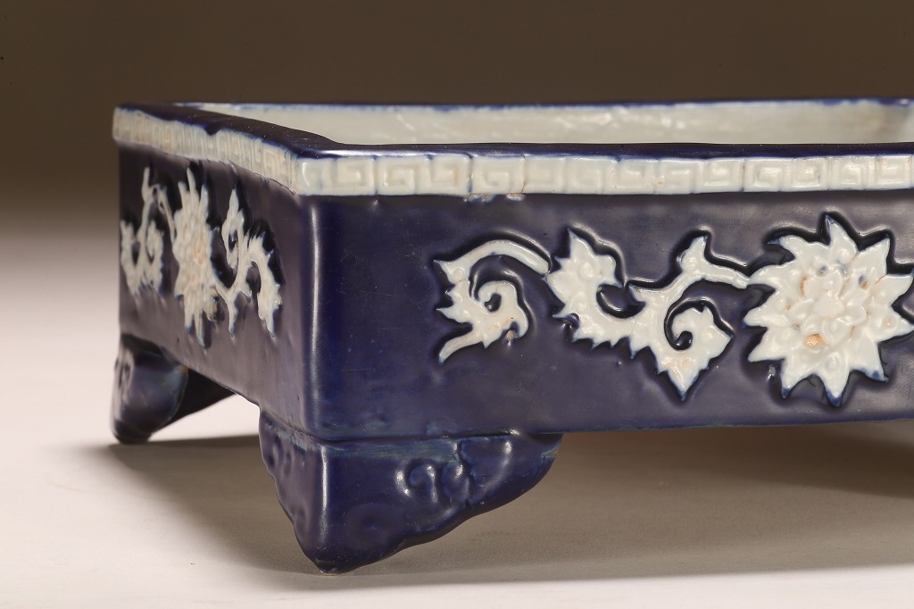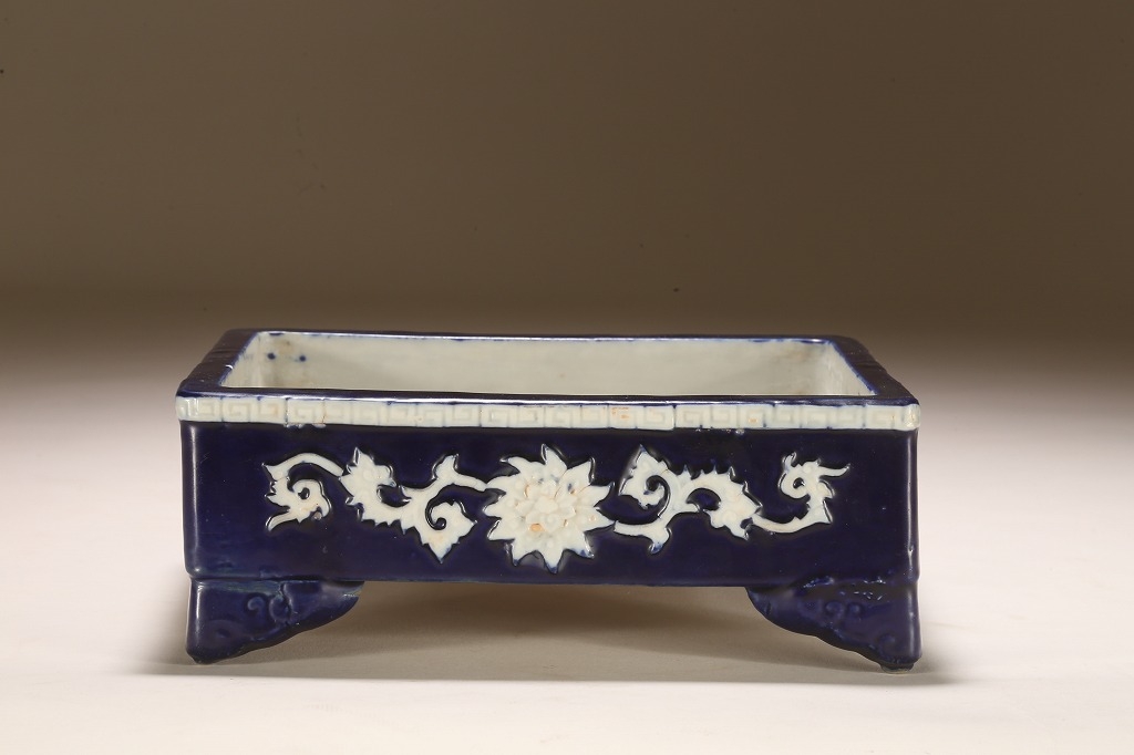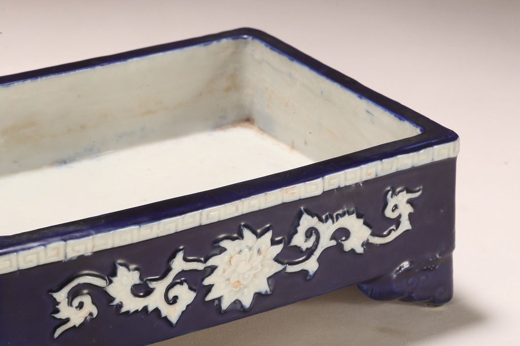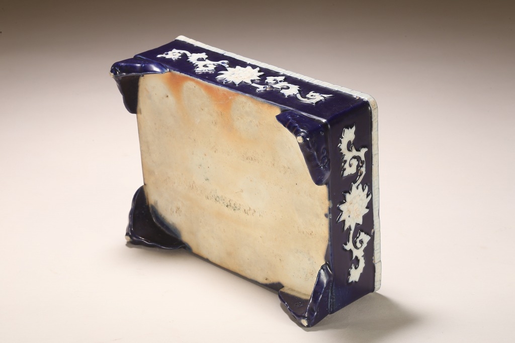 江戸期より瀬戸地方に興った尾張焼は、貼花紋など、当時として装飾性の高い藩窯として特別な扱いの中にありました。本作はその尾張焼を明治期に焼成方法を同じくして作られたものです。特徴的な深い瑠璃釉、型取りによって施される貼花、小振りなサイズは、文房的な愛玩品として位高い室内で楽しまれたものです。贅沢な道具立てとしてご紹介します。
