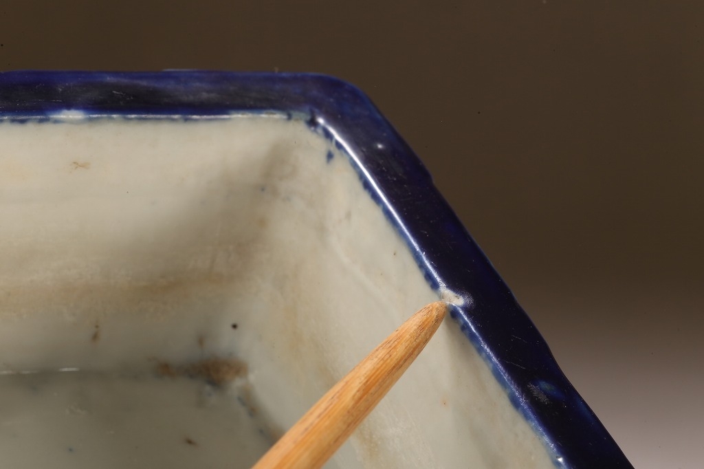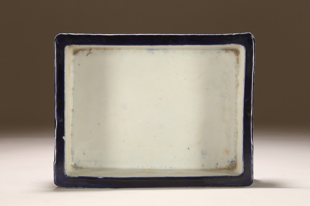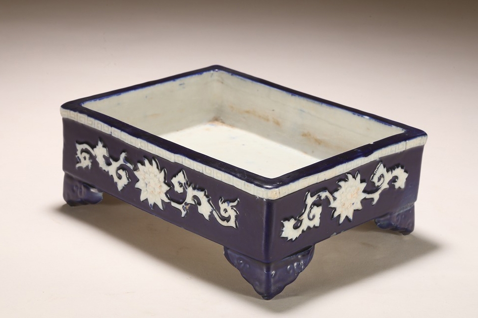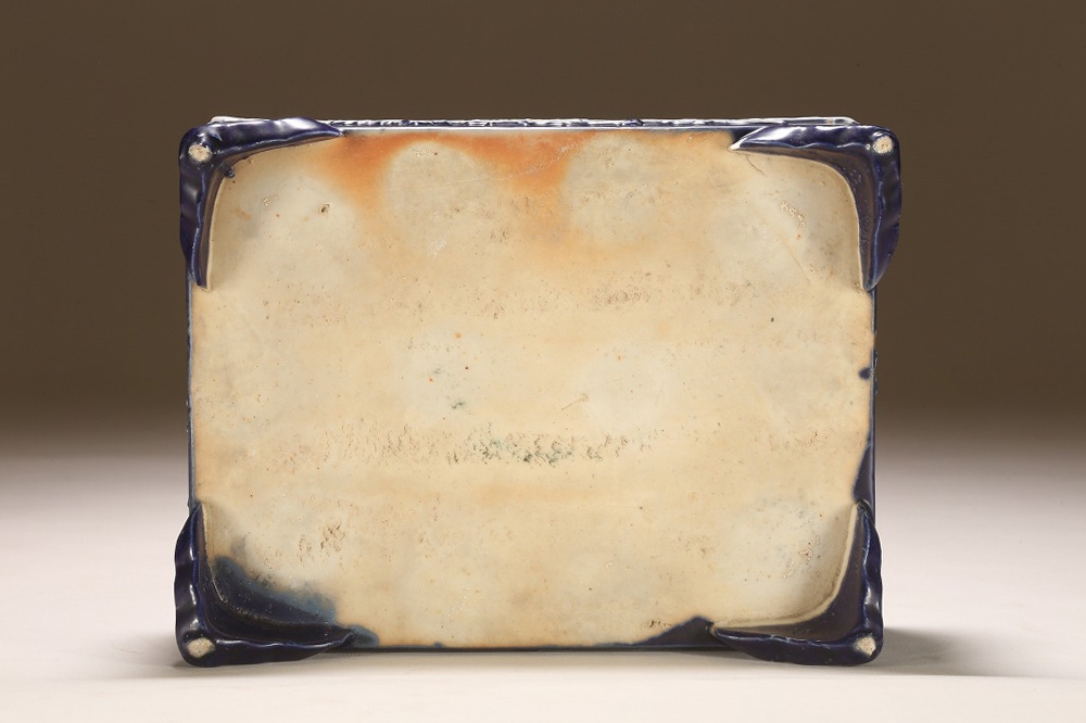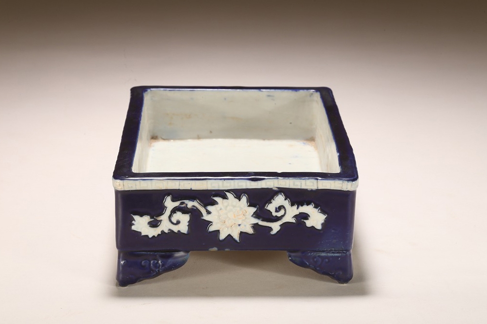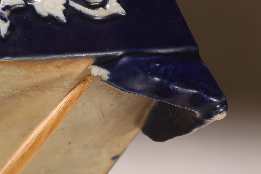 江戸期より瀬戸地方に興った尾張焼は、貼花紋など、当時として装飾性の高い藩窯として特別な扱いの中にありました。本作はその尾張焼を明治期に焼成方法を同じくして作られたものです。特徴的な深い瑠璃釉、型取りによって施される貼花、小振りなサイズは、文房的な愛玩品として位高い室内で楽しまれたものです。贅沢な道具立てとしてご紹介します。