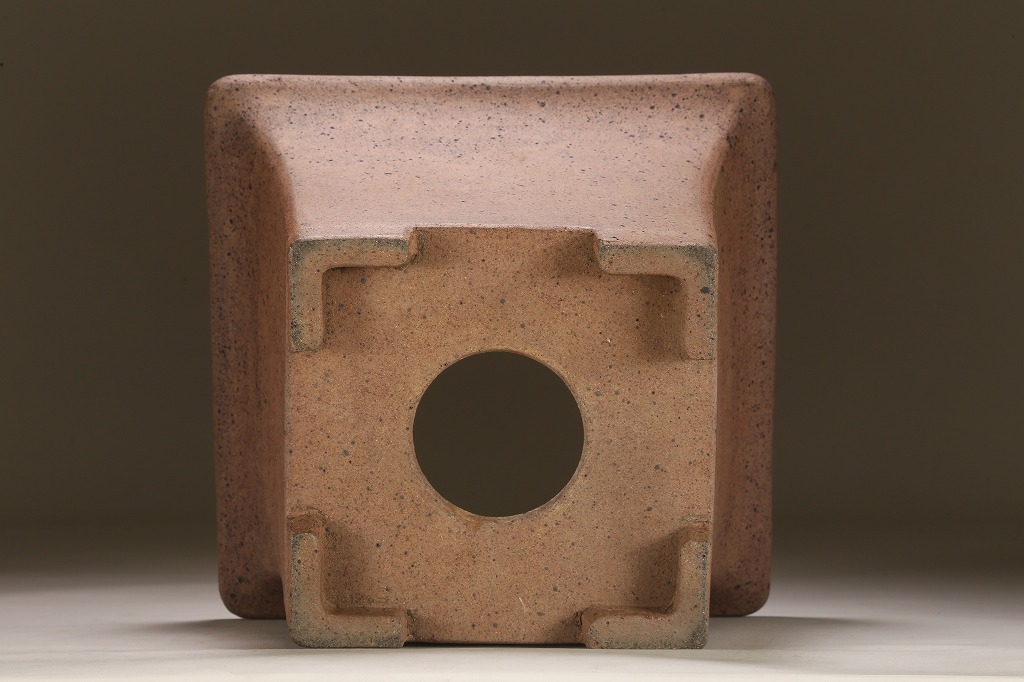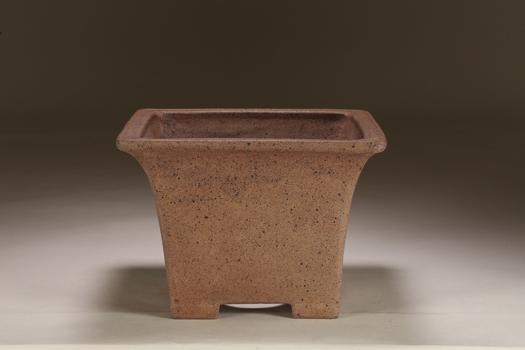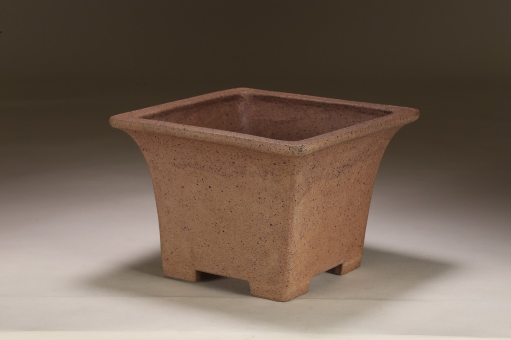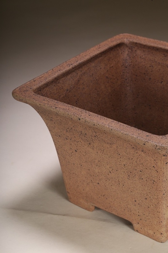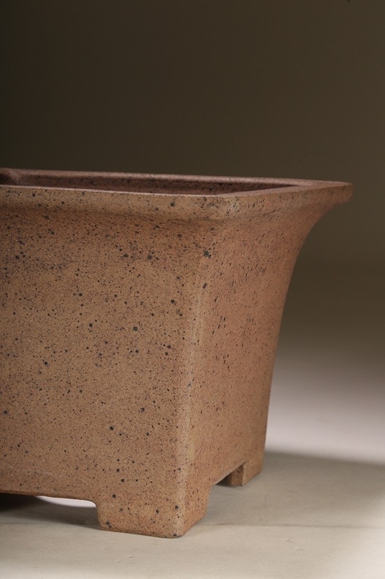 中国紫砂、中渡の実用の名器です。外反りの線、胴と一体になった足造りのスッキリとした姿は、この鉢の見せ所です。サイズも中型盆栽に適したもので、国風展三点飾りの主木に良く映る作品です。保存状態も上々です。