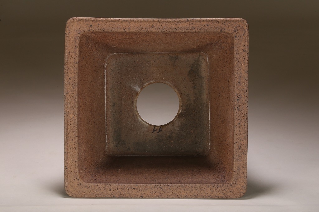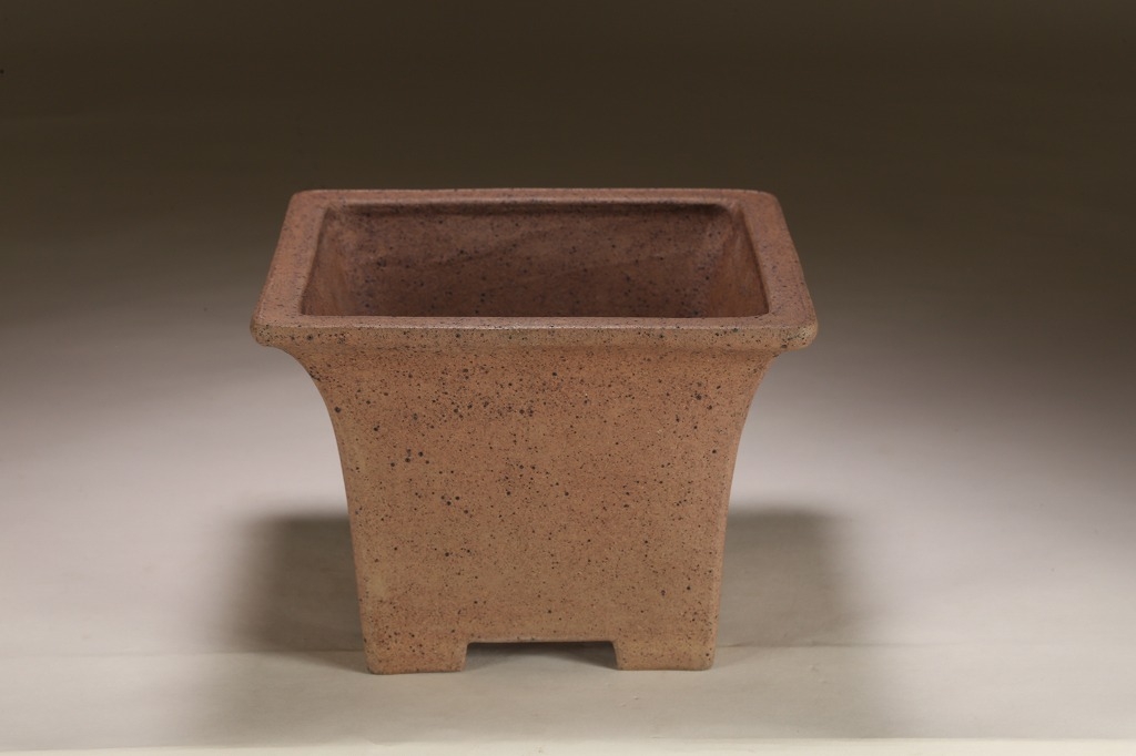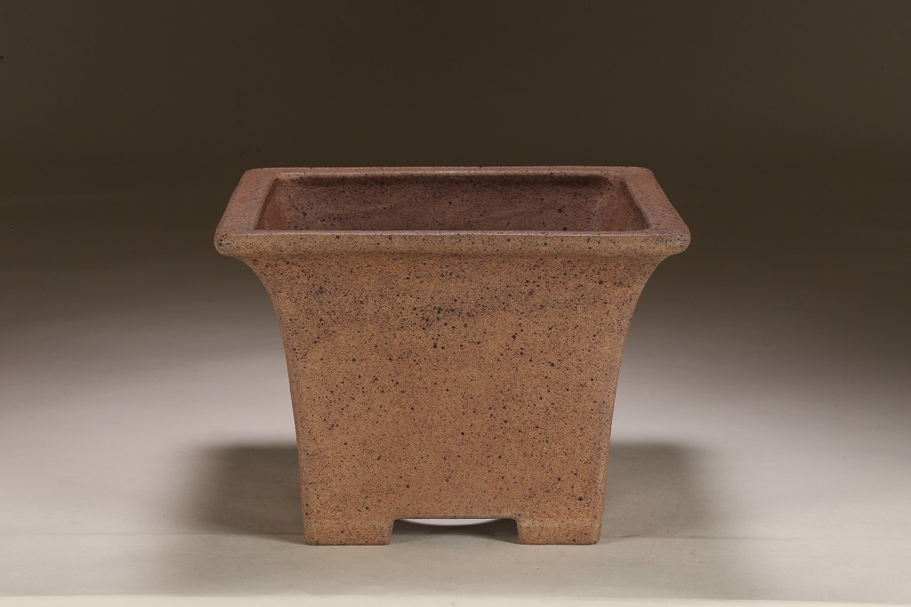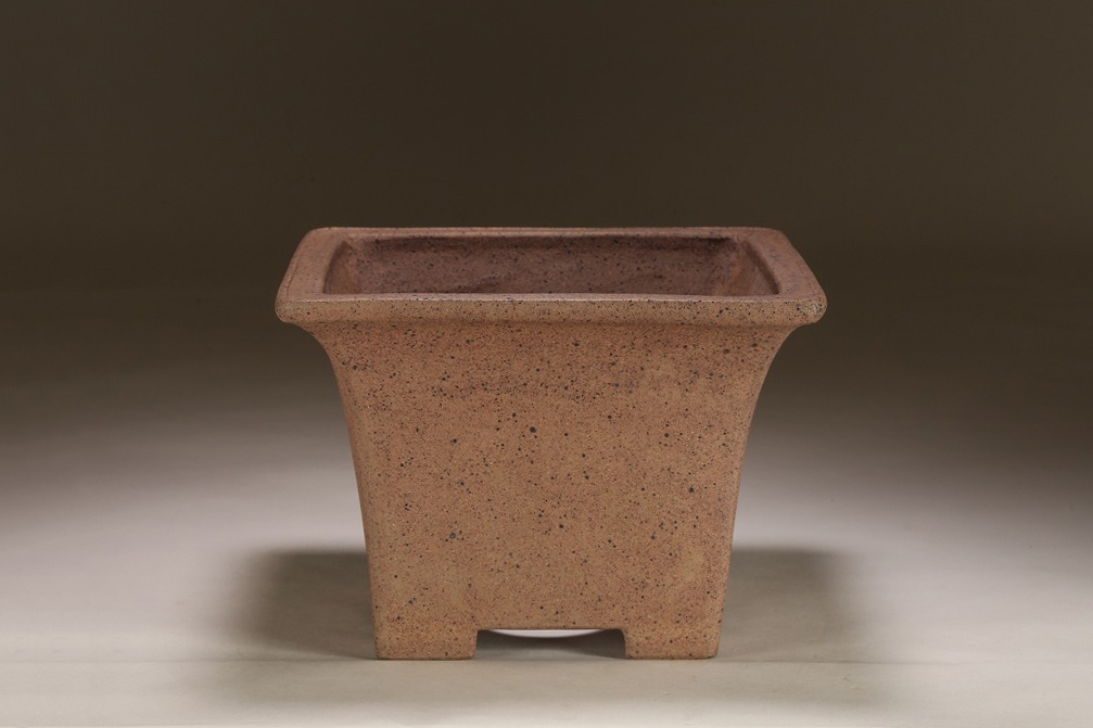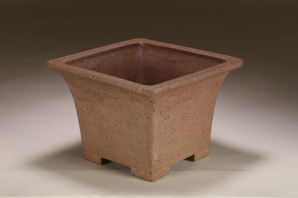 中国紫砂、中渡の実用の名器です。外反りの線、胴と一体になった足造りのスッキリとした姿は、この鉢の見せ所です。サイズも中型盆栽に適したもので、国風展三点飾りの主木に良く映る作品です。保存状態も上々です。