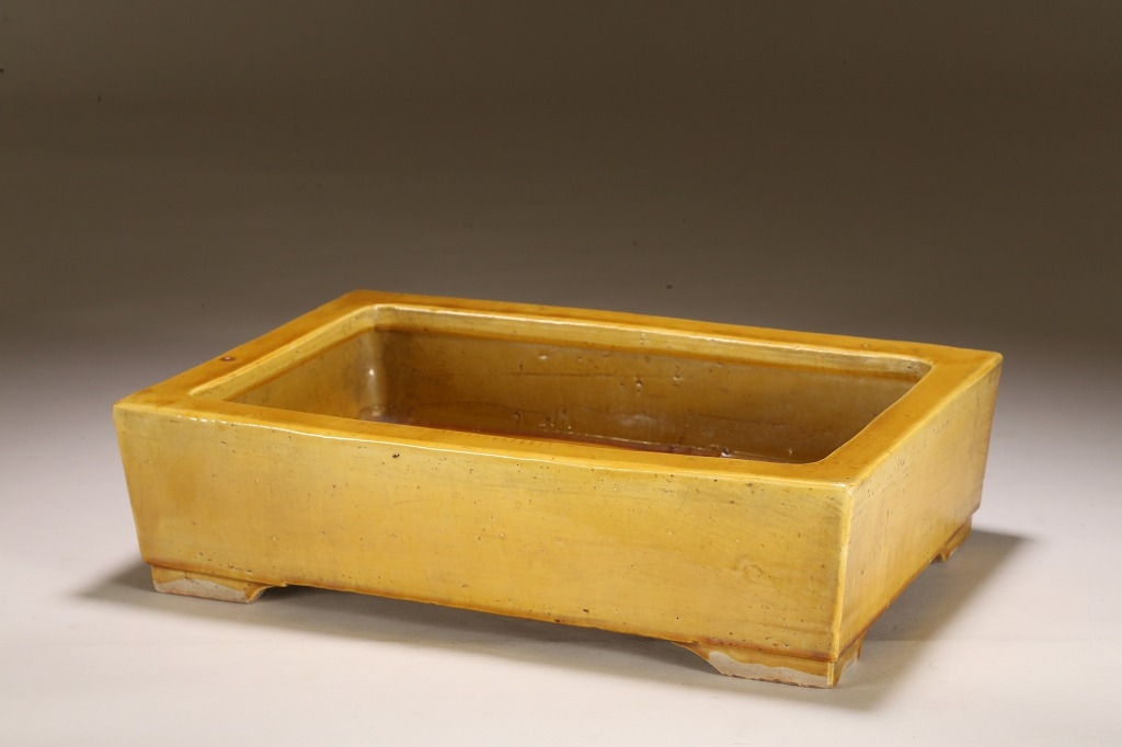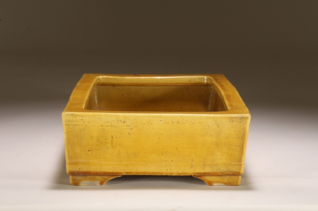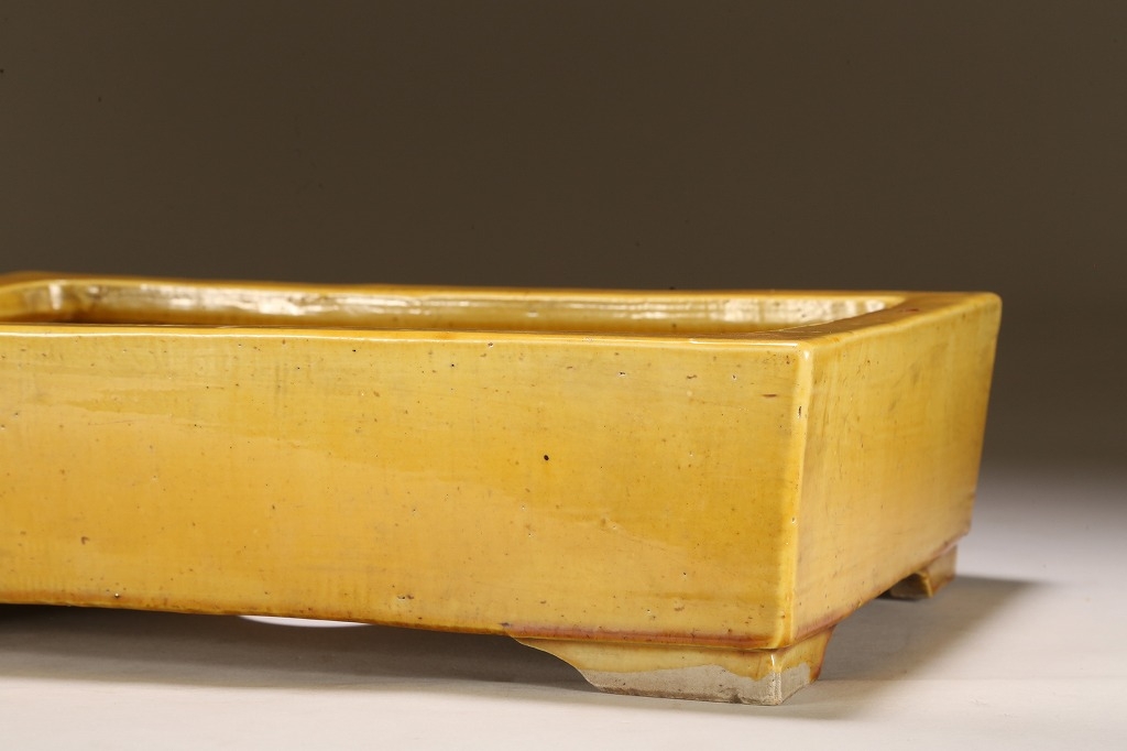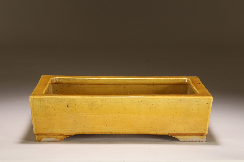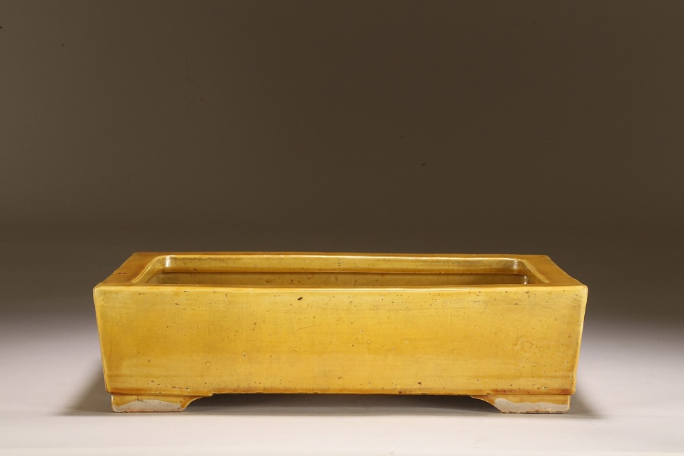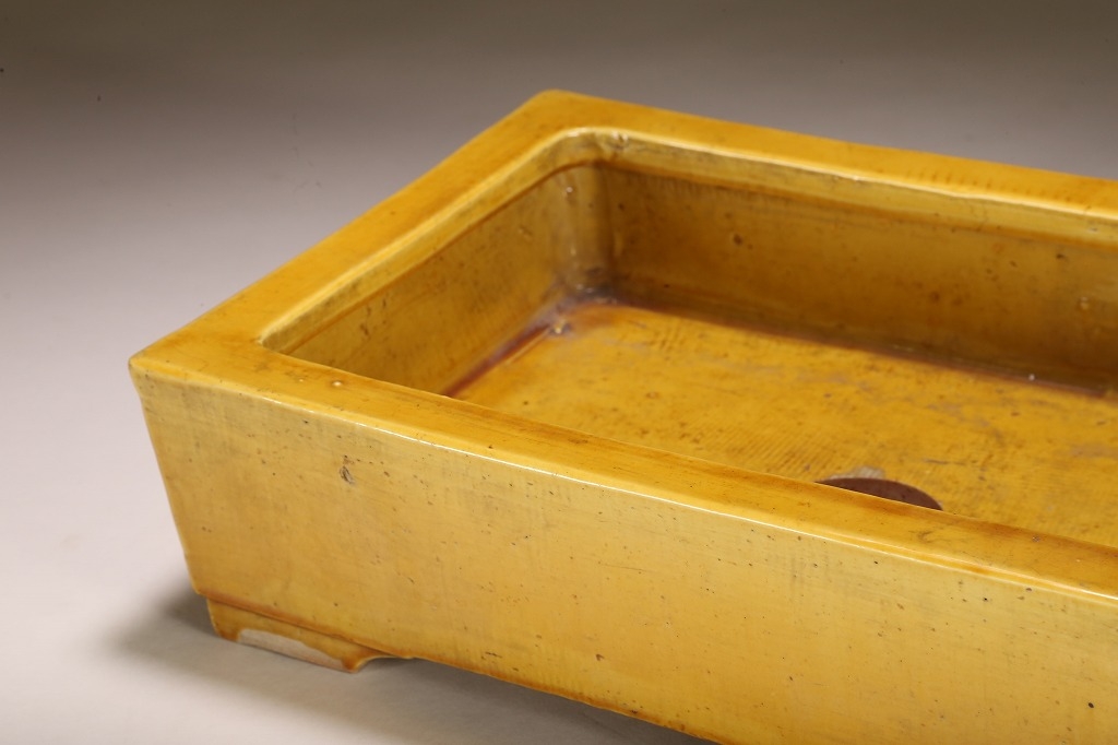 “山吹色“と言える、黄南京最上の釉薬調を今に伝える逸品鉢です。本来この作品は誕生した時に、深手水盤として作られましたが、数寄者の手により、深手の利点を考えて、盆器としての活用のために、跡穴が施され、長く釉薬鉢として半世紀を超えて盆栽界に伝えられたものです。200年の時を超えてなお、美しい発色は変わらず、中型の実物盆栽などへの贅沢なひと鉢として、美術盆器コレクションとして、お薦めの数少ないものです。