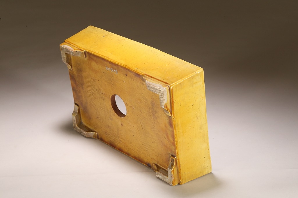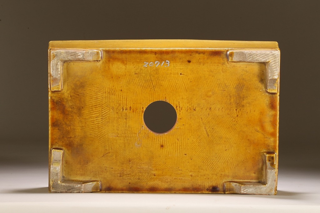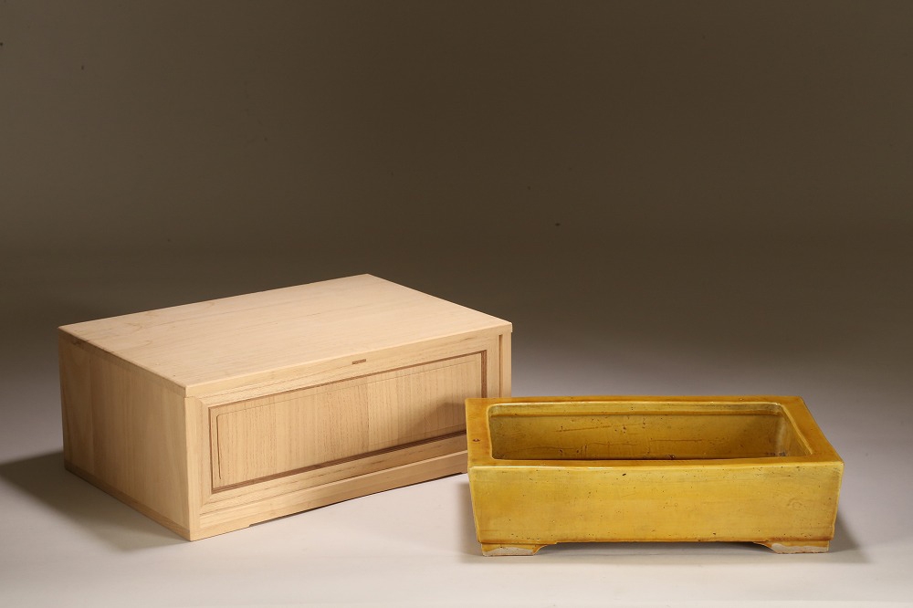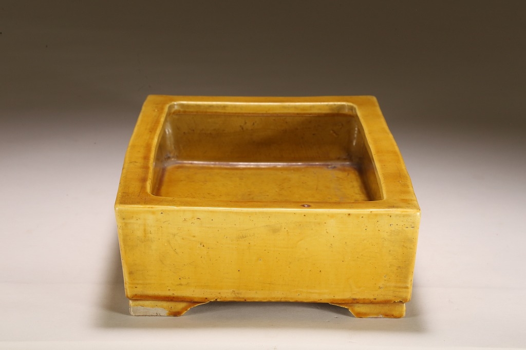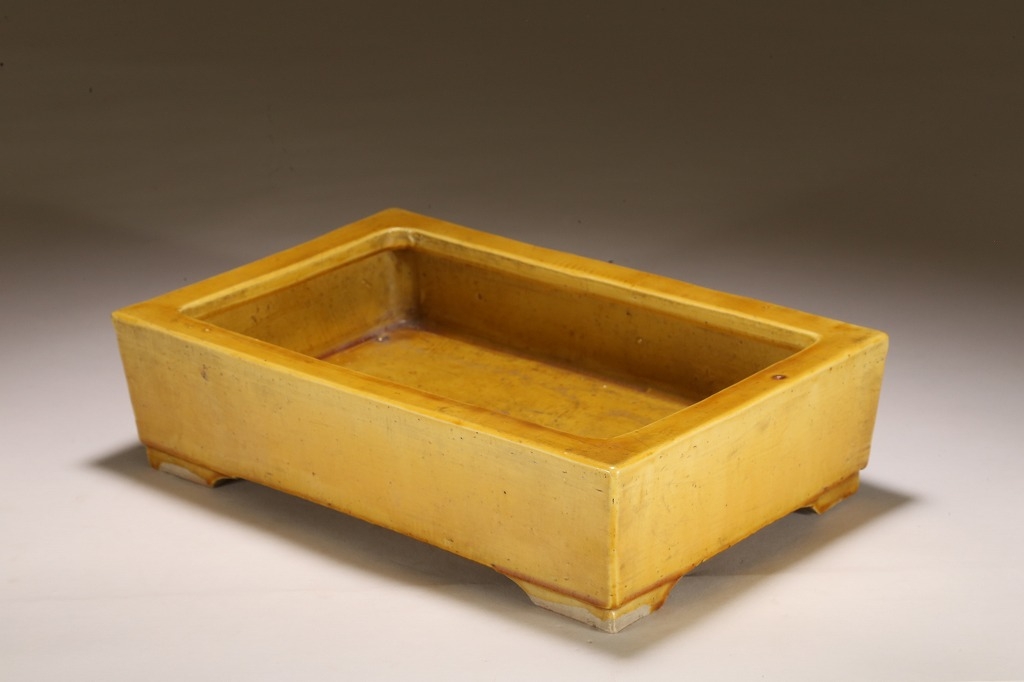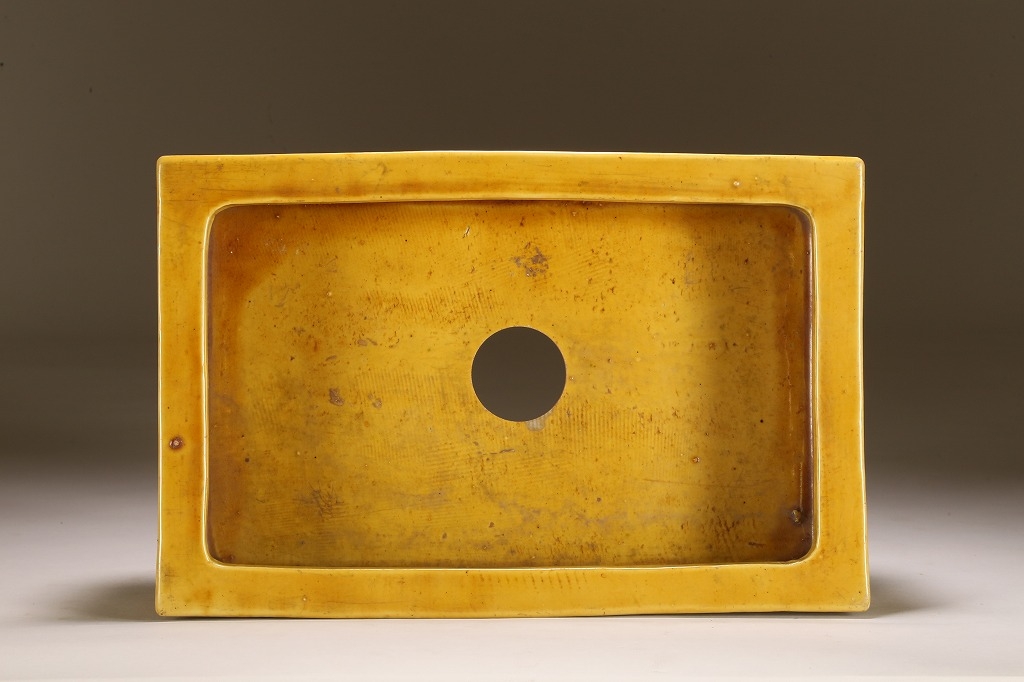 “山吹色“と言える、黄南京最上の釉薬調を今に伝える逸品鉢です。本来この作品は誕生した時に、深手水盤として作られましたが、数寄者の手により、深手の利点を考えて、盆器としての活用のために、跡穴が施され、長く釉薬鉢として半世紀を超えて盆栽界に伝えられたものです。200年の時を超えてなお、美しい発色は変わらず、中型の実物盆栽などへの贅沢なひと鉢として、美術盆器コレクションとして、お薦めの数少ないものです。