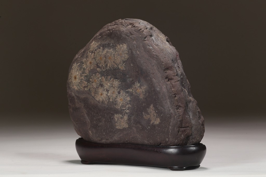 仄暗い薄紅紫の母岩、そのに浮かぶ十数輪の小菊の群生。薬品で花を浮かび上がらせたものや、磨き出しで美石として鑑賞したものなど、菊花石には多種多様なものがありますが、このように川擦れの石面に天然自然に浮かび出る小菊の様を呈する石は極めて稀なるものです。