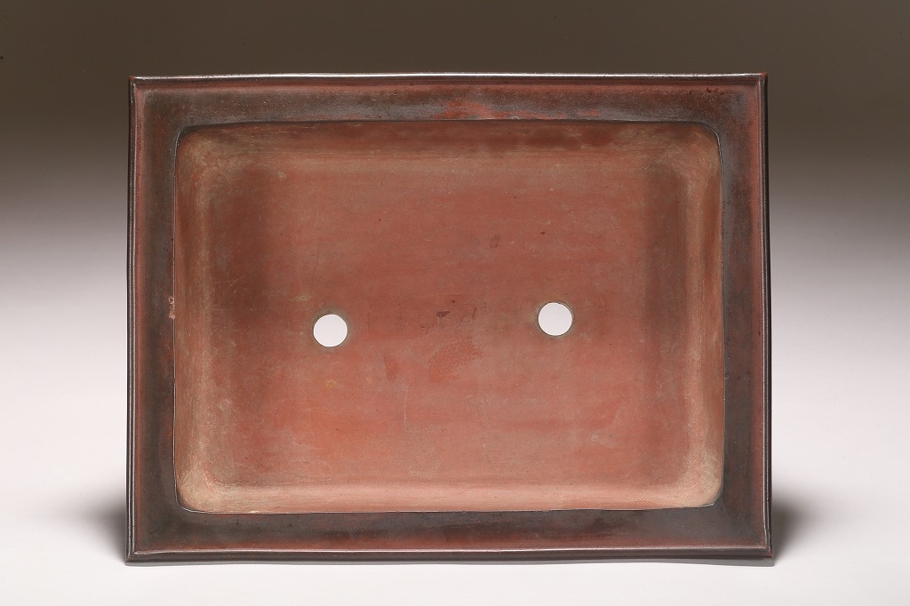 約150年前の中国宜興の“紫砂土“が生んだ、朱泥鉢の逸品です。紫砂は植え込んで使い込む程に、その土味に深みが増します。この鉢もゆうに半世紀以上、盆栽と共に生きてきたと思われます。特にこの寸法でこれほどの“奥行き“を持ったものは少なく、国風展三点飾りなどでの実用に最適な作品と言えます。縁上の僅かなホツのみの保存状態良好の賓作です。
