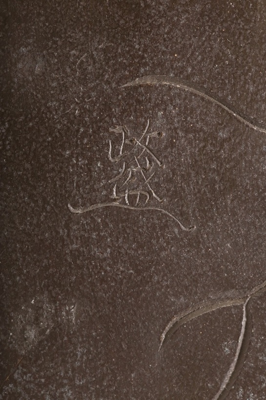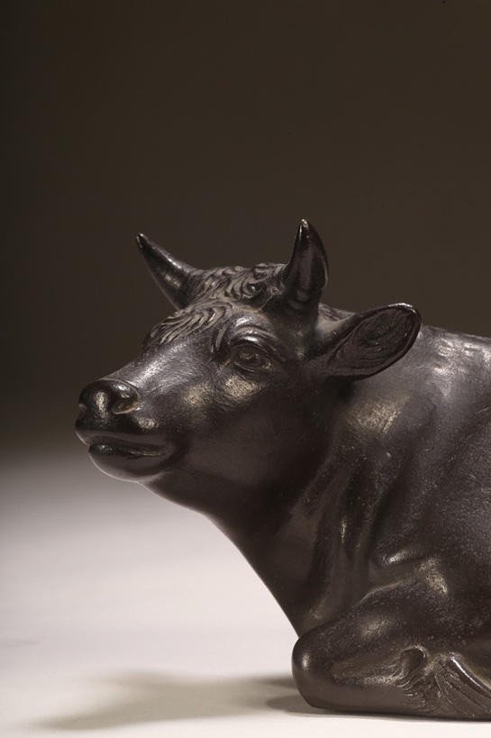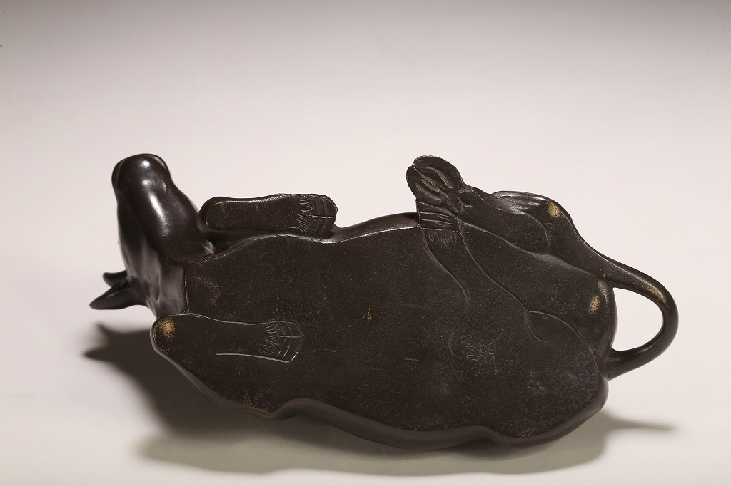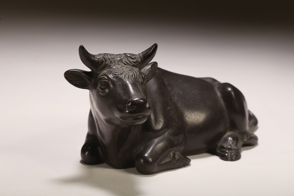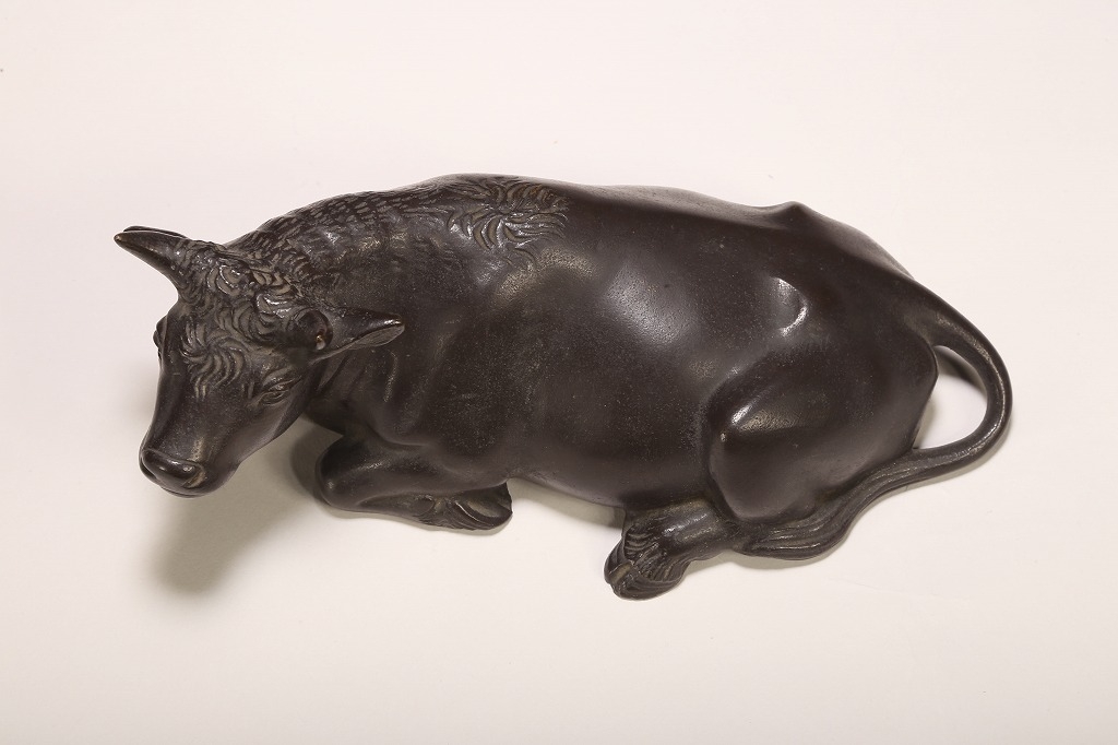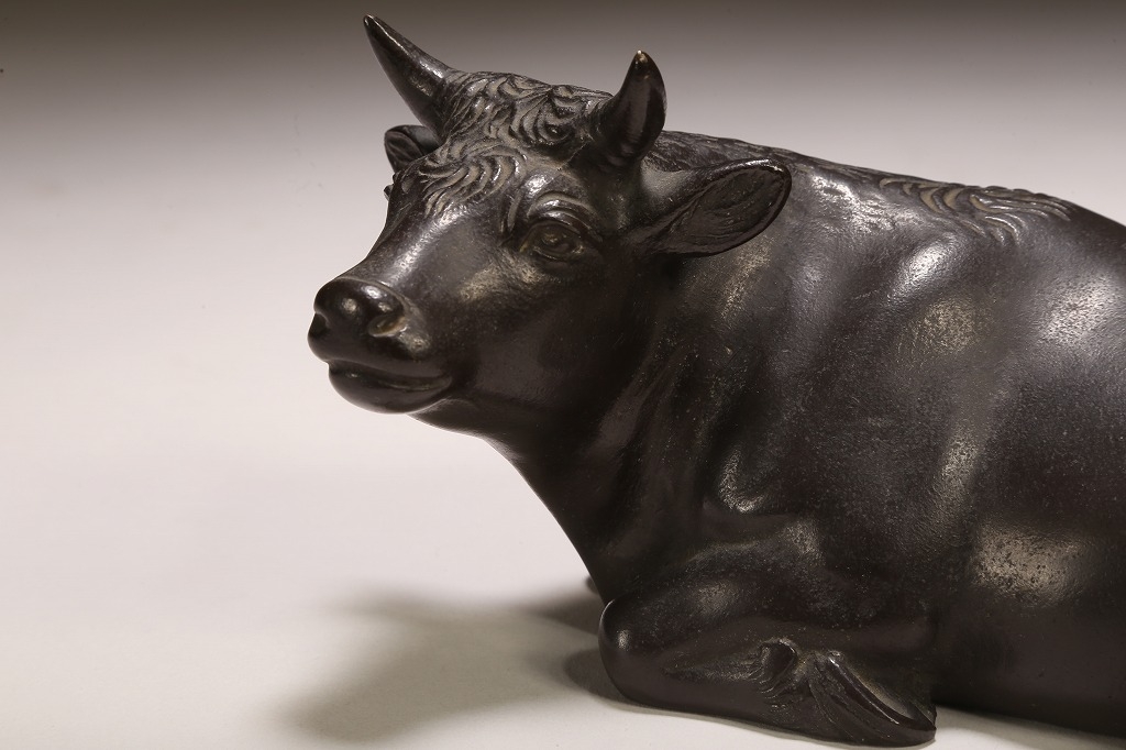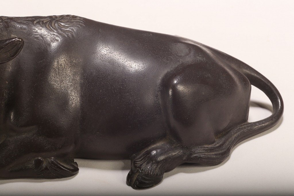 臥牛(横たわる牛)の基本は、あくまでも農村や旅すがらの道脇に休む“日本的な姿“が大切です。本作は江戸金工の技を受け継ぐ秀作で、銅味も抜群です。作者については不明ですが、盆栽水石の脇飾りの道具として最適な作品です。