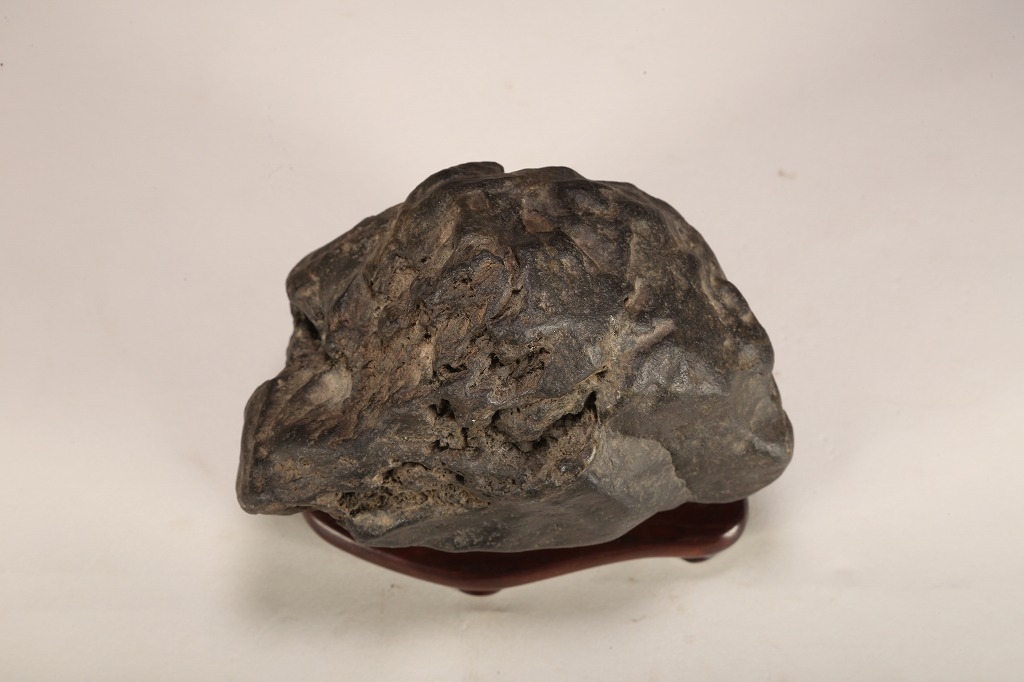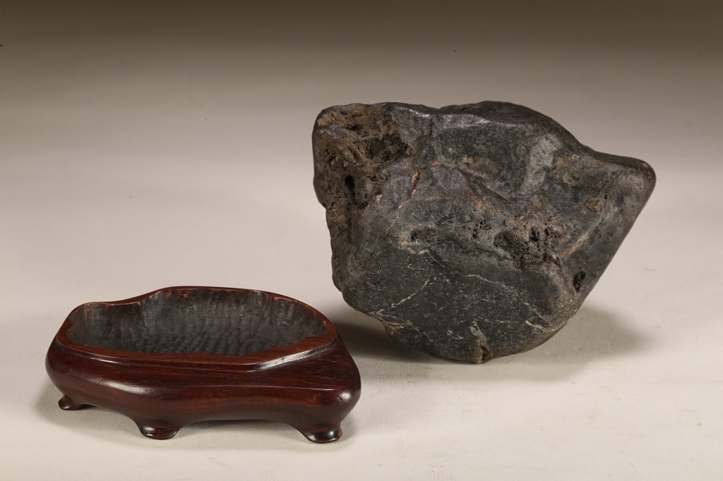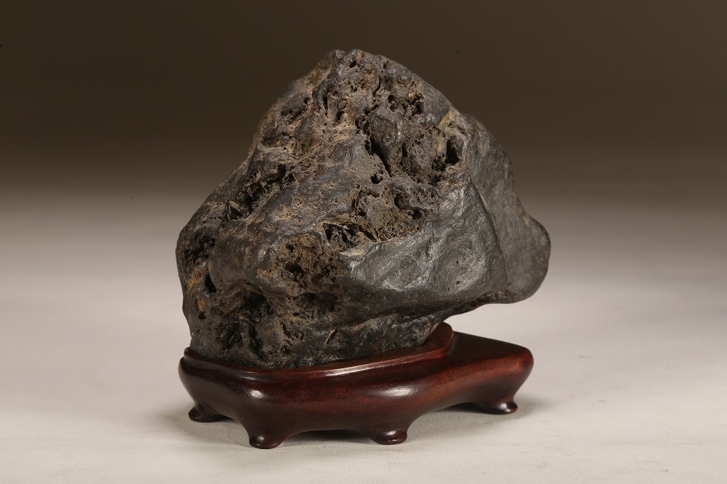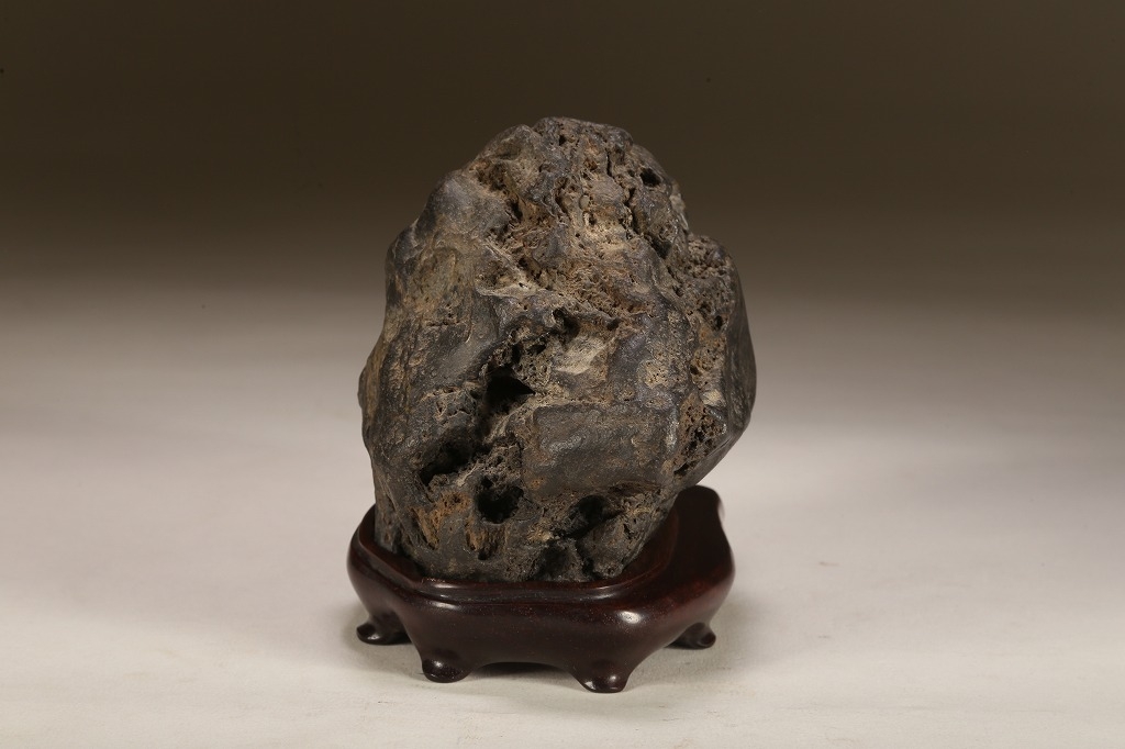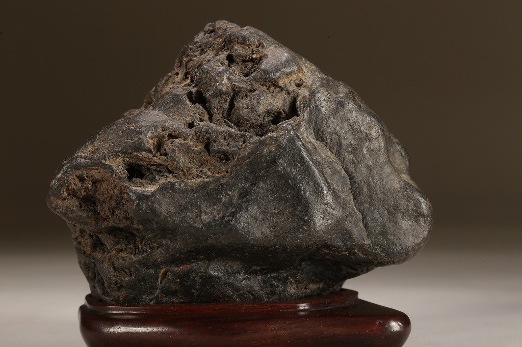 “練り真黒“と呼ばれる、加茂川真黒石の中でも、極めて石質良い天然ウブ成りの一石。たっぷりとした重みのある屋根姿に味わい深い石肌の凹凸。サイズ感も、盆栽などとの合わせ飾りに最適と言えます。勿論何よりも愛玩の歴史が紡いできた古感が、この石の最大の魅力です。