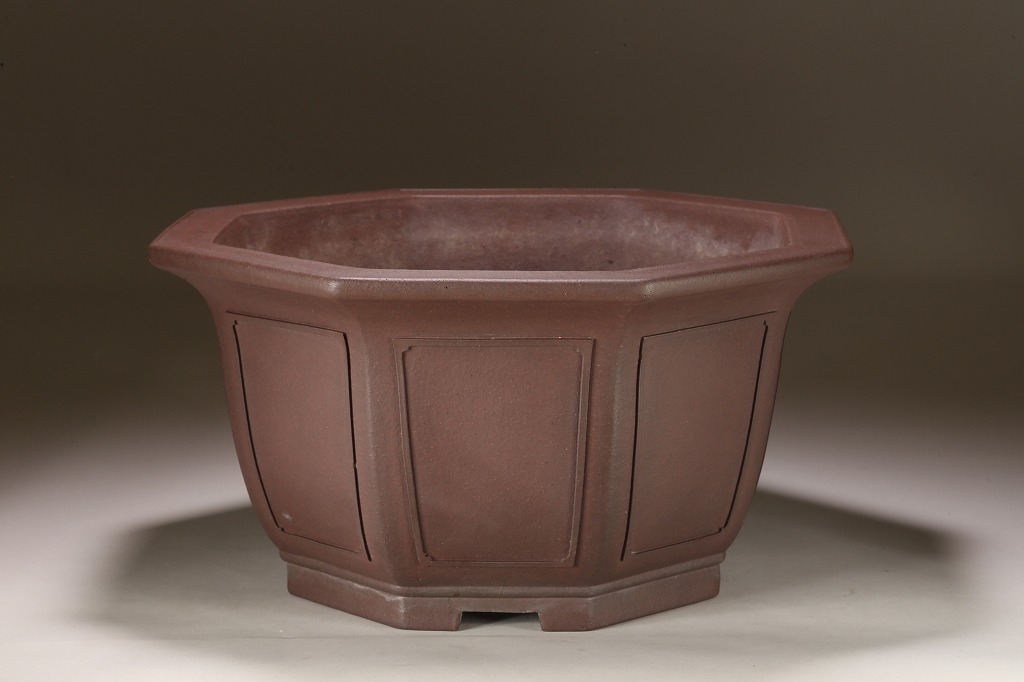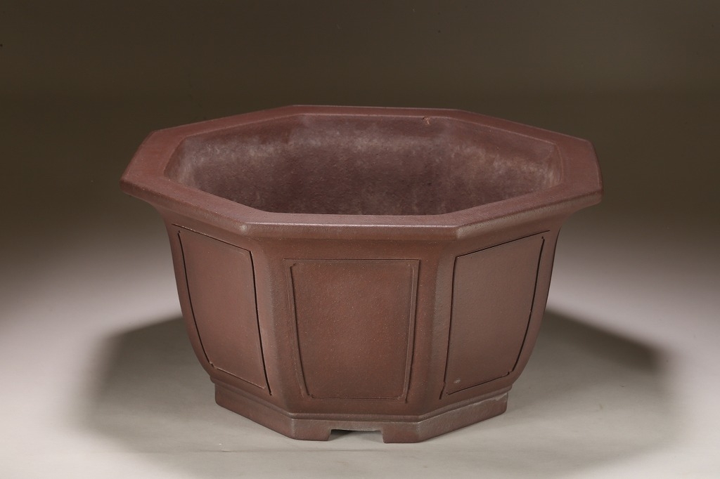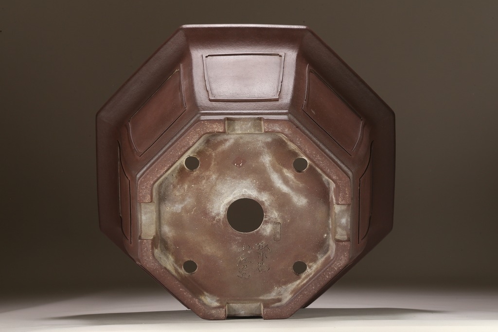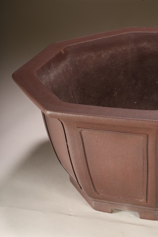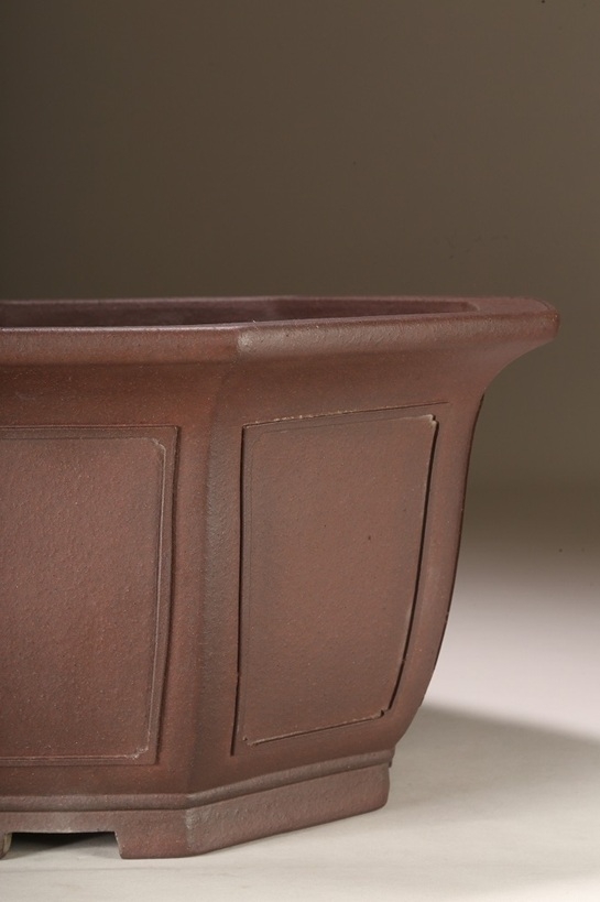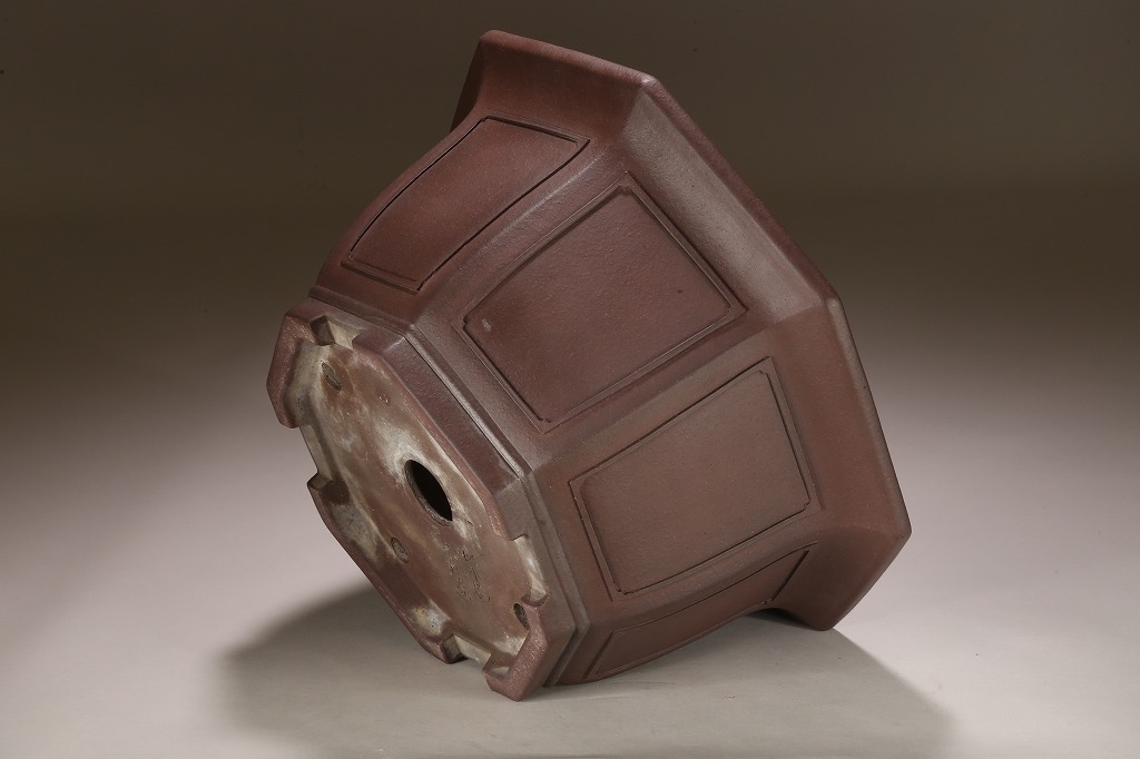 激減している山秋の大型六角鉢です。国風級の松柏を受け止めてきたもので、内ホツや額に僅かなホツが確認できます。完成された器形は、多くの大型盆栽を映します。