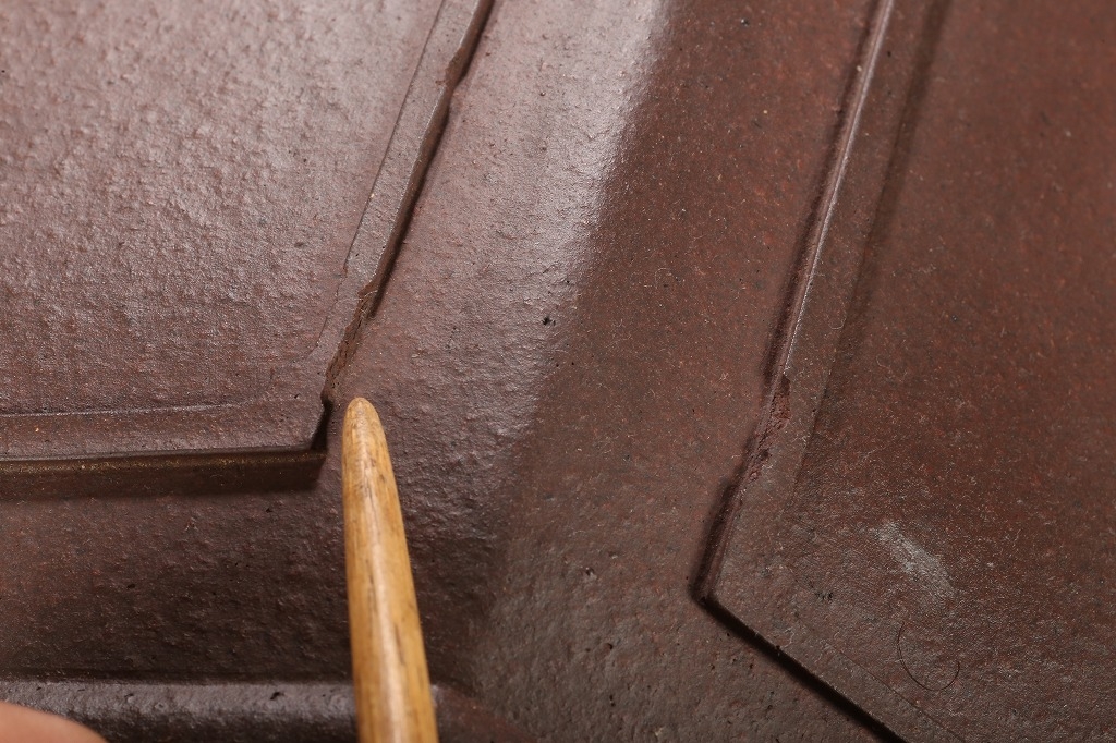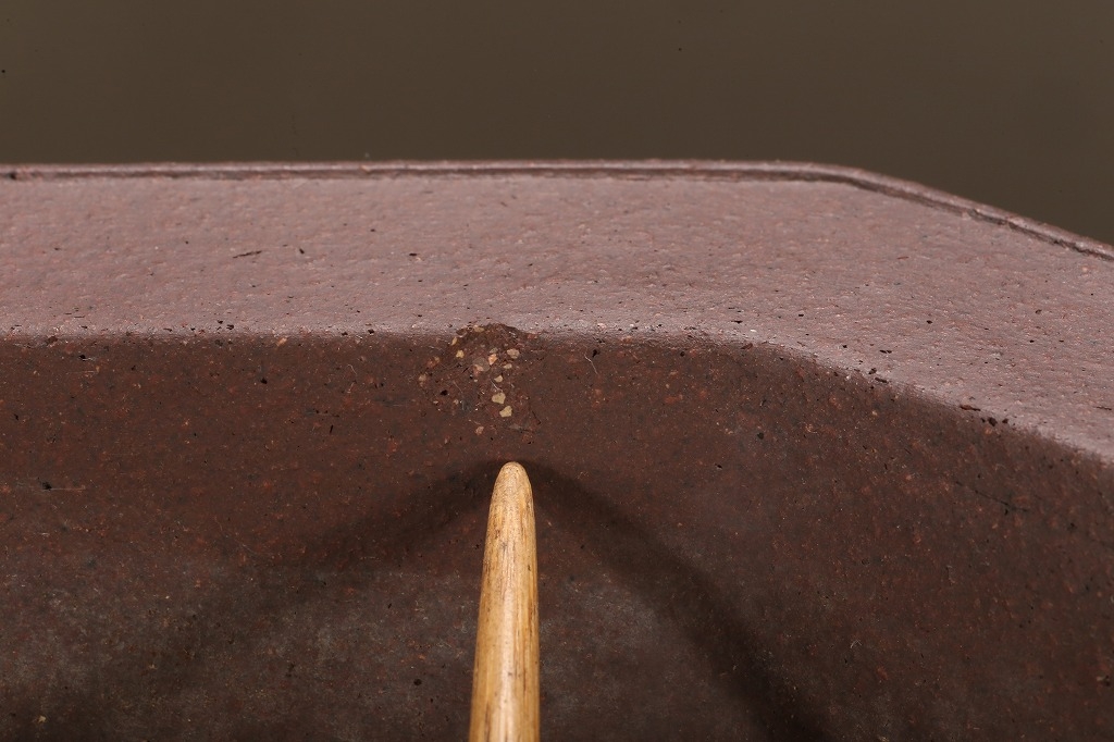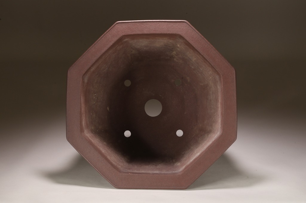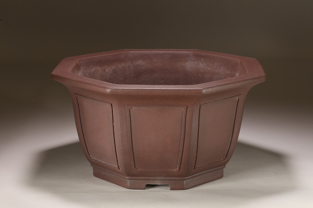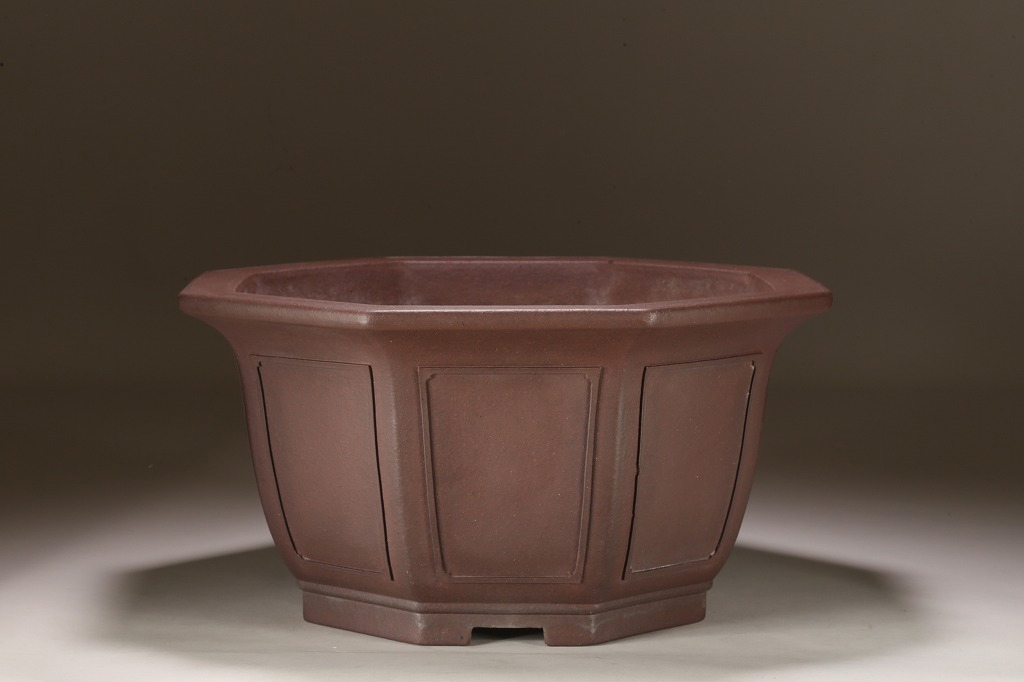 激減している山秋の大型六角鉢です。国風級の松柏を受け止めてきたもので、内ホツや額に僅かなホツが確認できます。完成された器形は、多くの大型盆栽を映します。