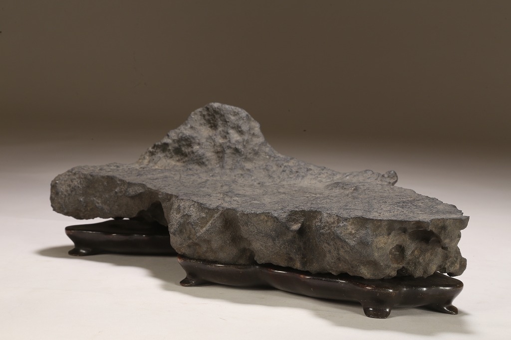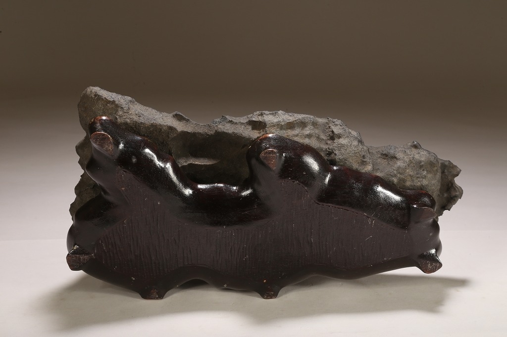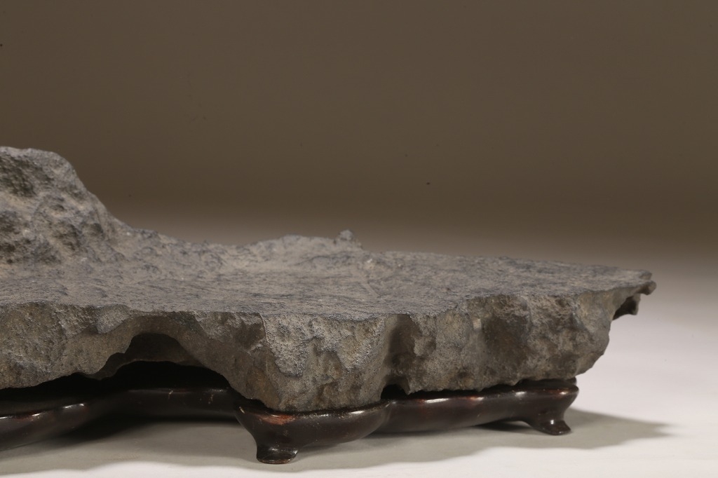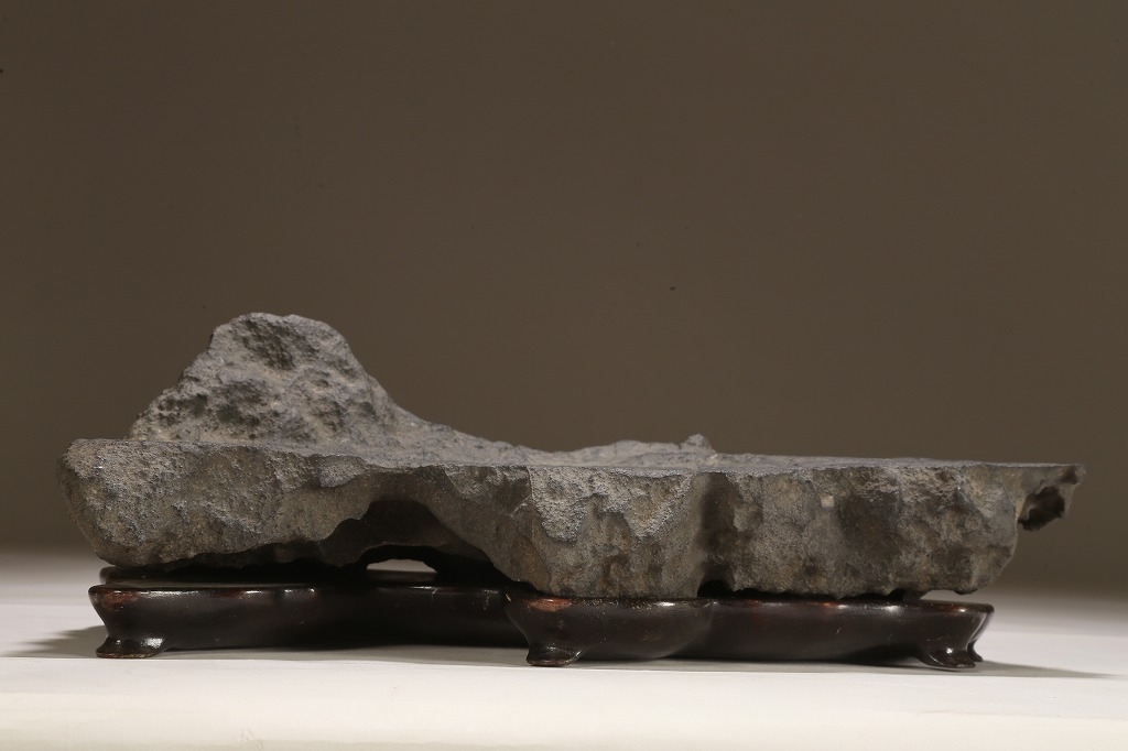 堅牢な岩型の相が多い筑前真黒石の中で、寸法の大きさを含めて、このような土坡姿を持つものは稀です。左方に遠見の山を仰ぎ、そこから何処までも続くような平原とも岬とも見ゆる景。特に土坡下の石相はこの石の特色。水盤での景趣も素晴らしいものです。