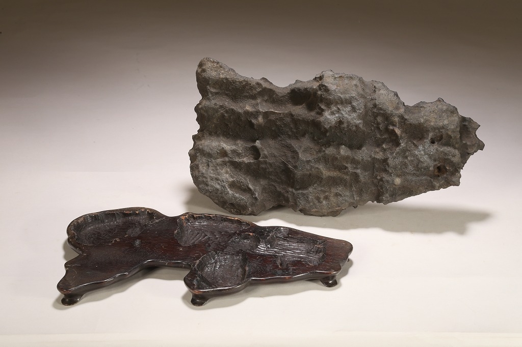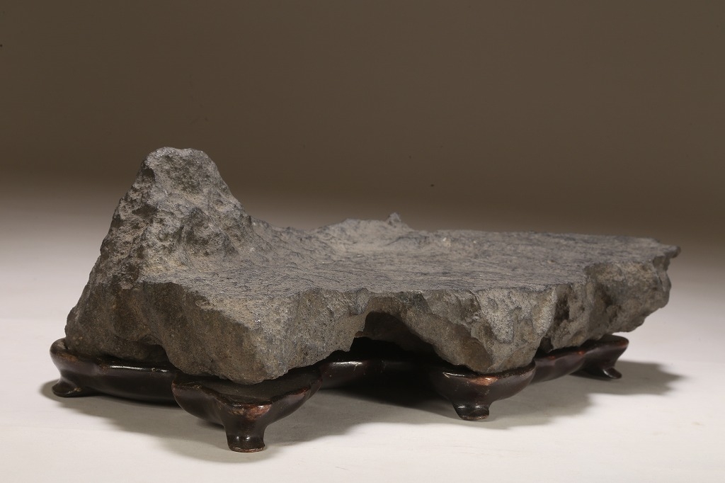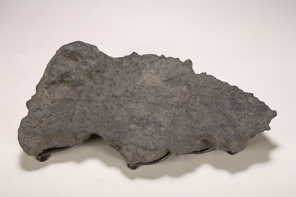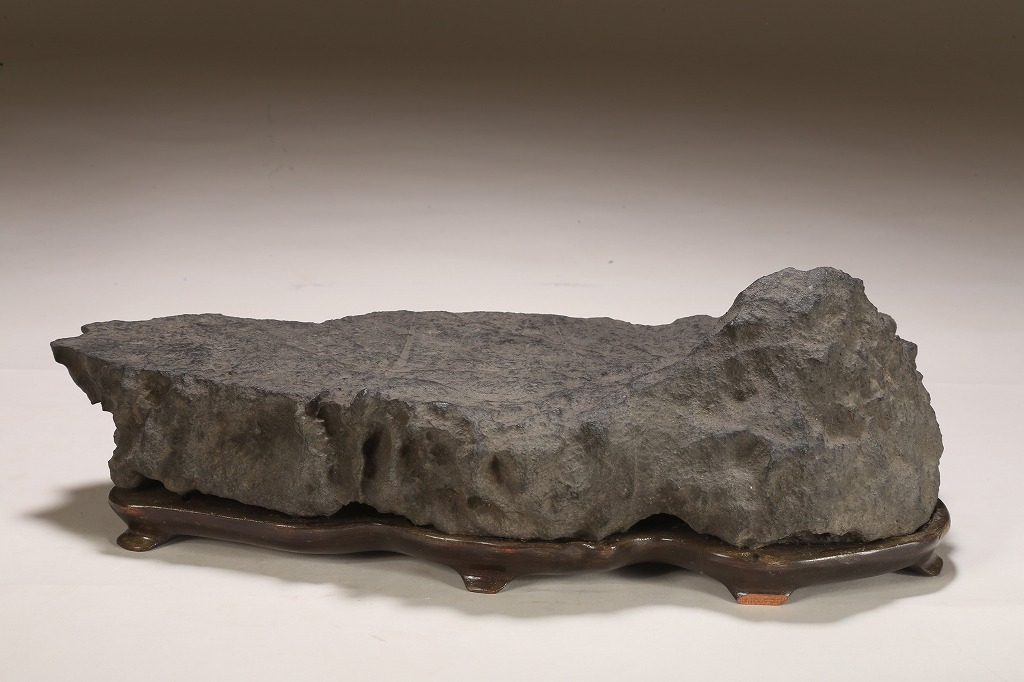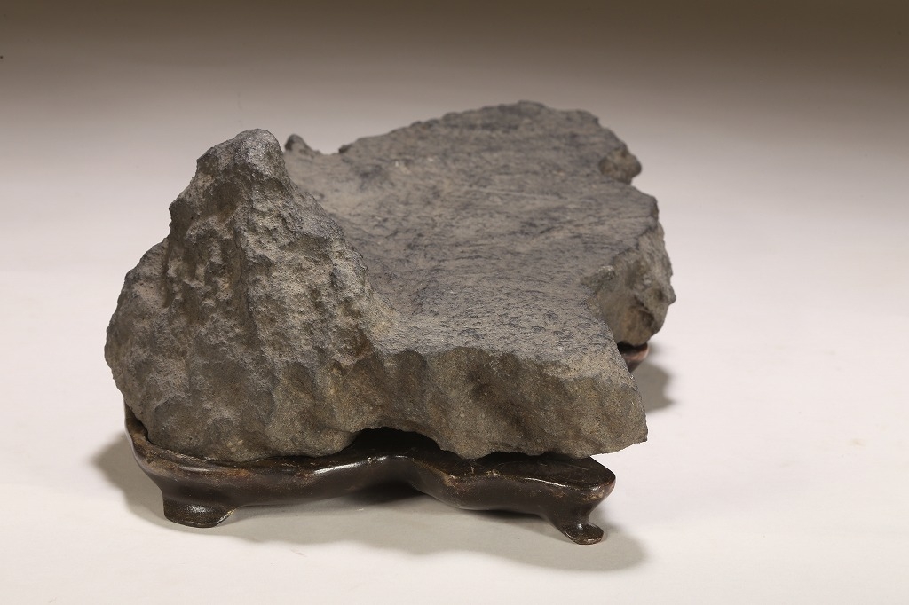 堅牢な岩型の相が多い筑前真黒石の中で、寸法の大きさを含めて、このような土坡姿を持つものは稀です。左方に遠見の山を仰ぎ、そこから何処までも続くような平原とも岬とも見ゆる景。特に土坡下の石相はこの石の特色。水盤での景趣も素晴らしいものです。