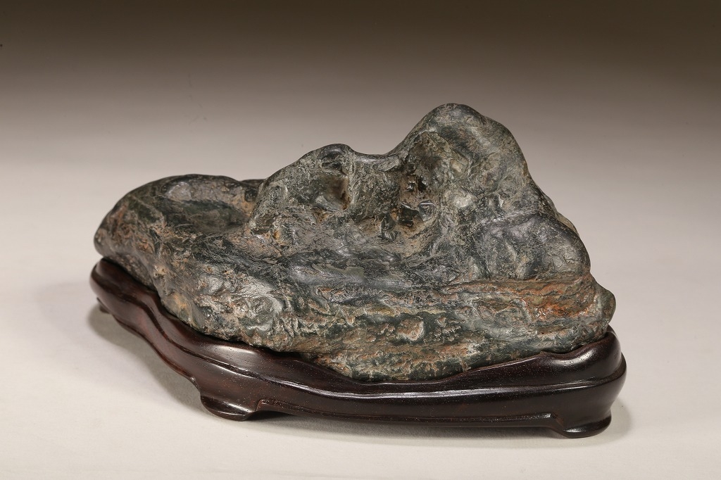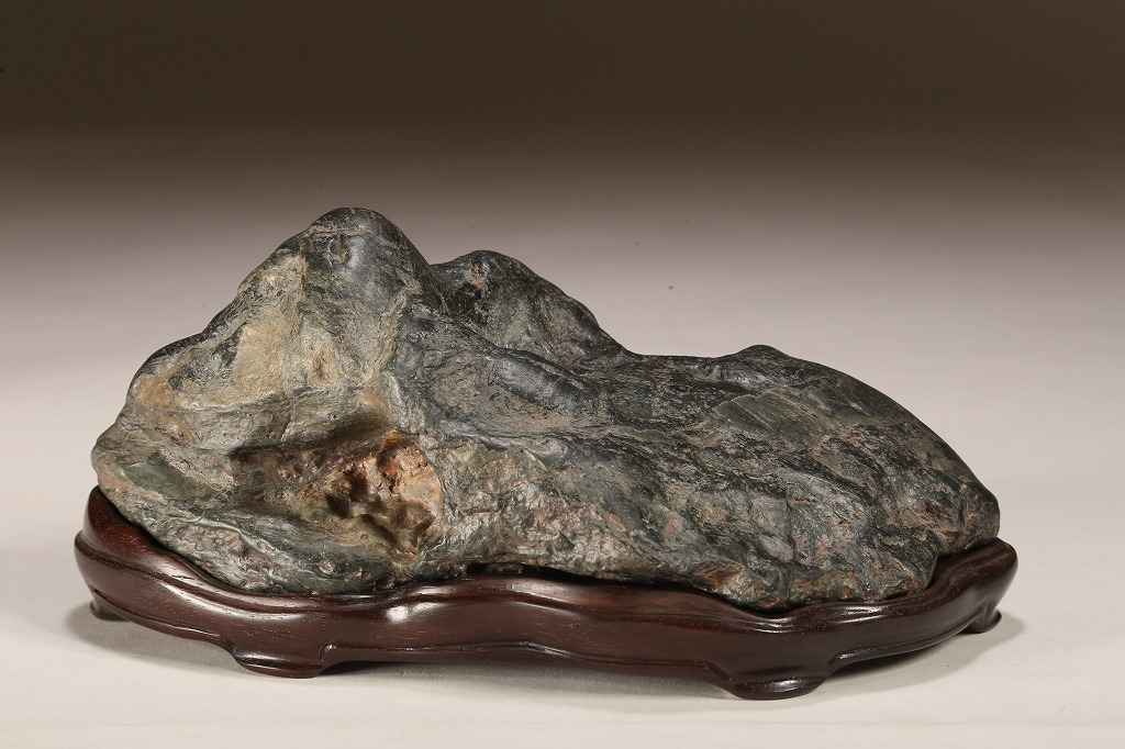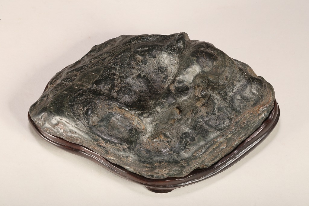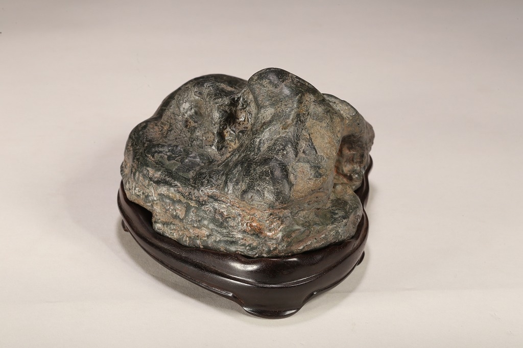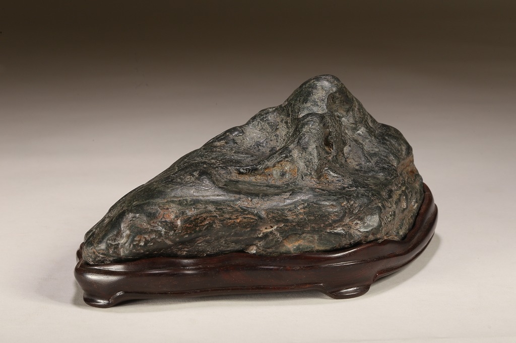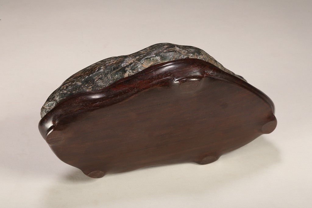 右方に聳える山頂、裾野を広げる如き山裾の広大さ。堅牢な石質の神居古潭石で、このような秀麗な石相を示すものは貴重です。底部に至るまで加工なく、台座も名工鈴木広寿翁による逸品石です。