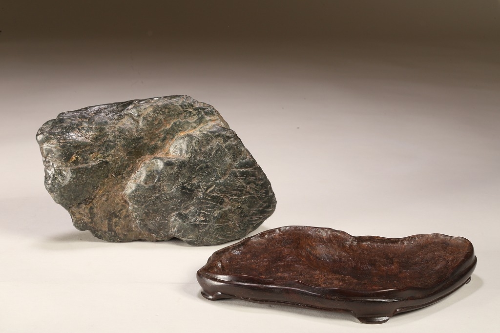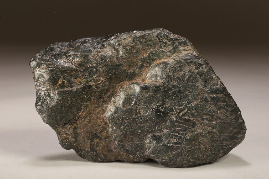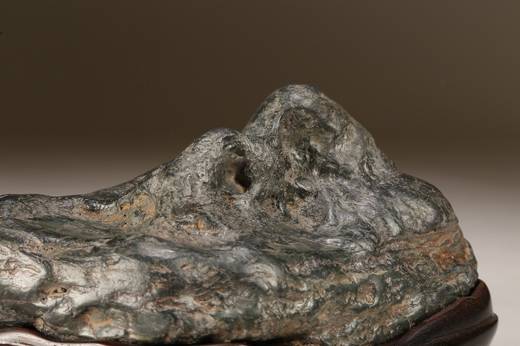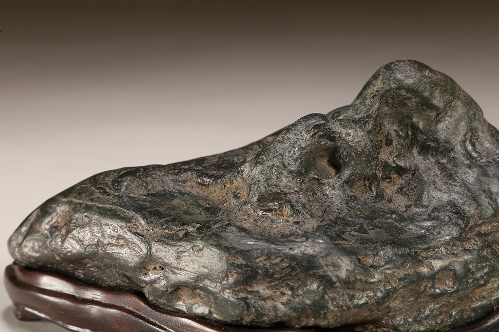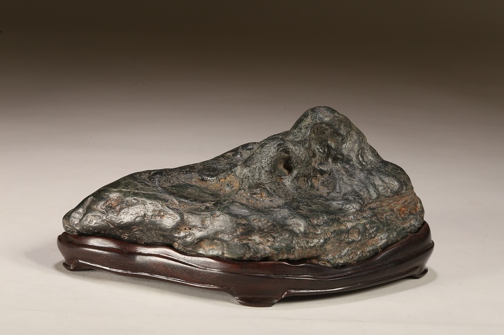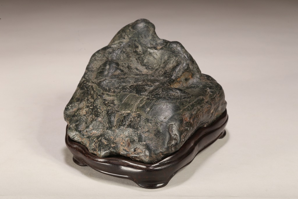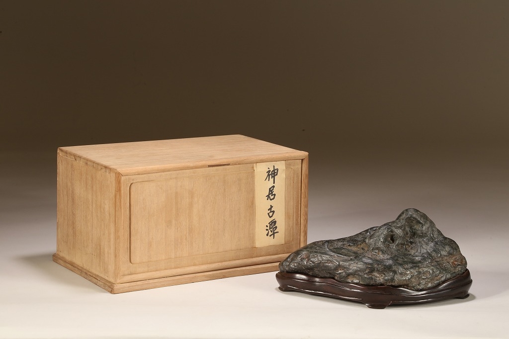 右方に聳える山頂、裾野を広げる如き山裾の広大さ。堅牢な石質の神居古潭石で、このような秀麗な石相を示すものは貴重です。底部に至るまで加工なく、台座も名工鈴木広寿翁による逸品石です。