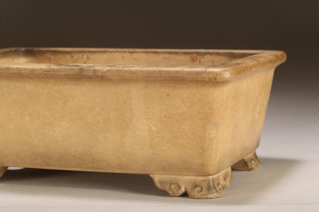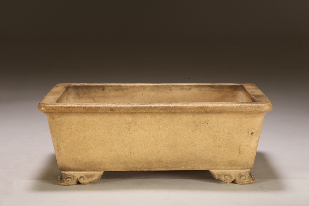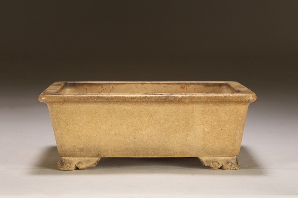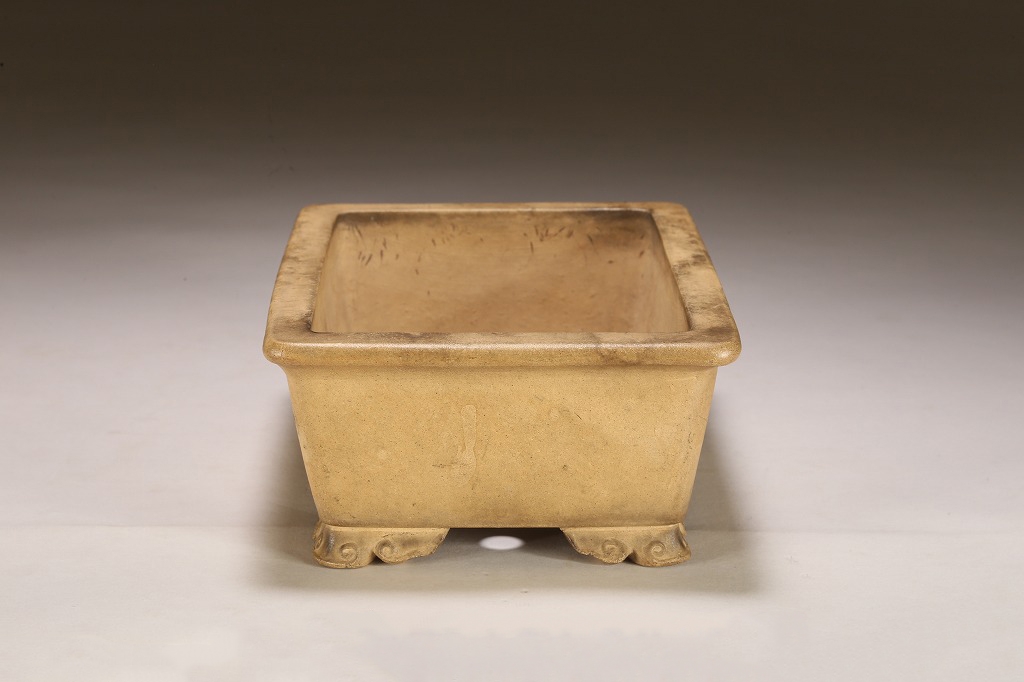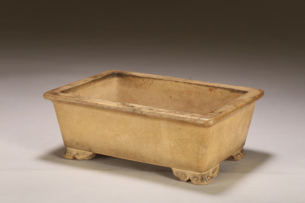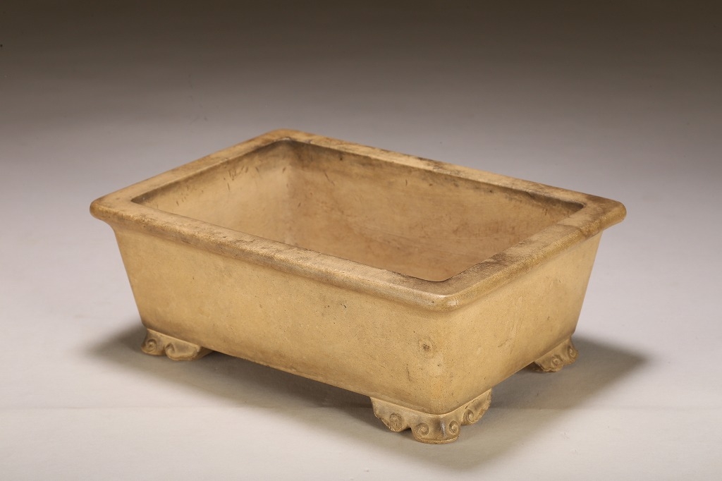 中国中渡り中品鉢の“定番“的な人気のある“葛明白泥“も、現在は稀少性の高い盆器となりました。現地中国宜興でも、このような純粋の白泥は“工芸大師“の称号を持つ人でも、入手すら出来ない材料となってしまいました。紫泥や朱泥などの濃い色合いの土味とは異なり、鉢映りの点でも、中型の取合わせ飾りには、是非とも欲しい逸品です。