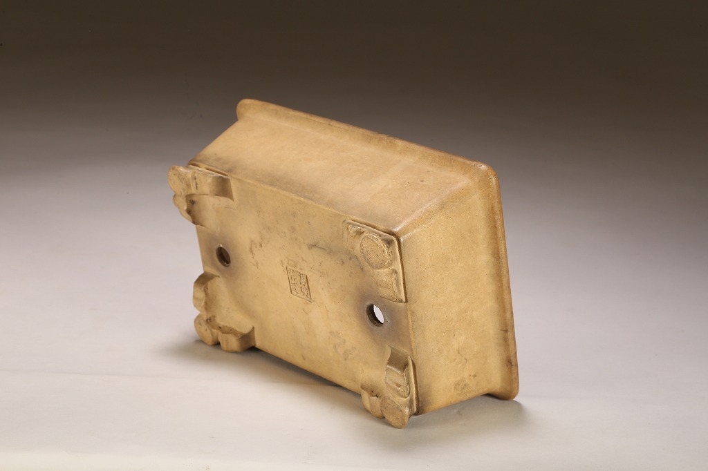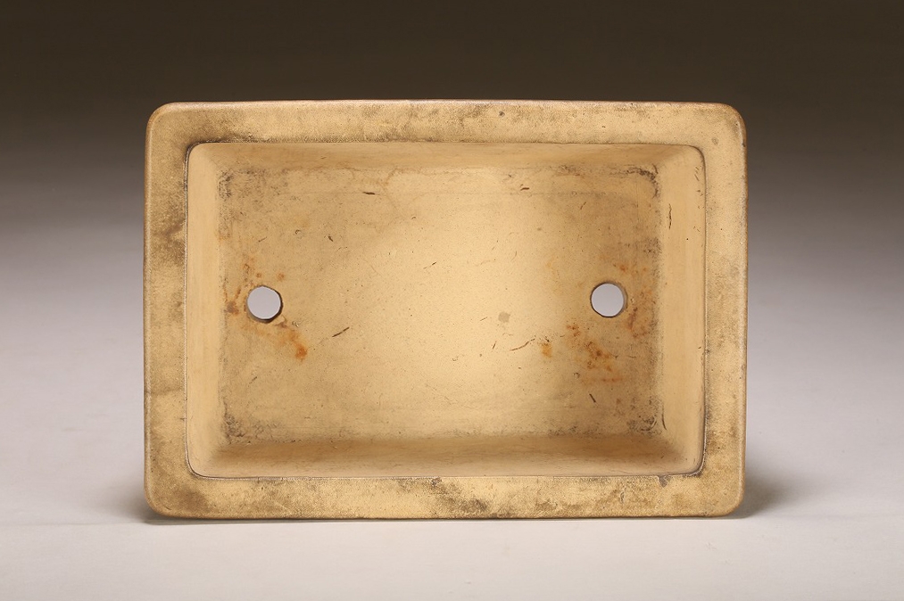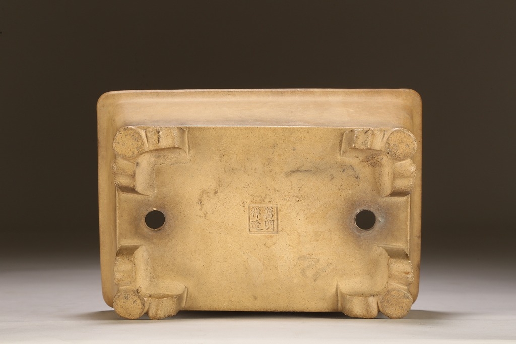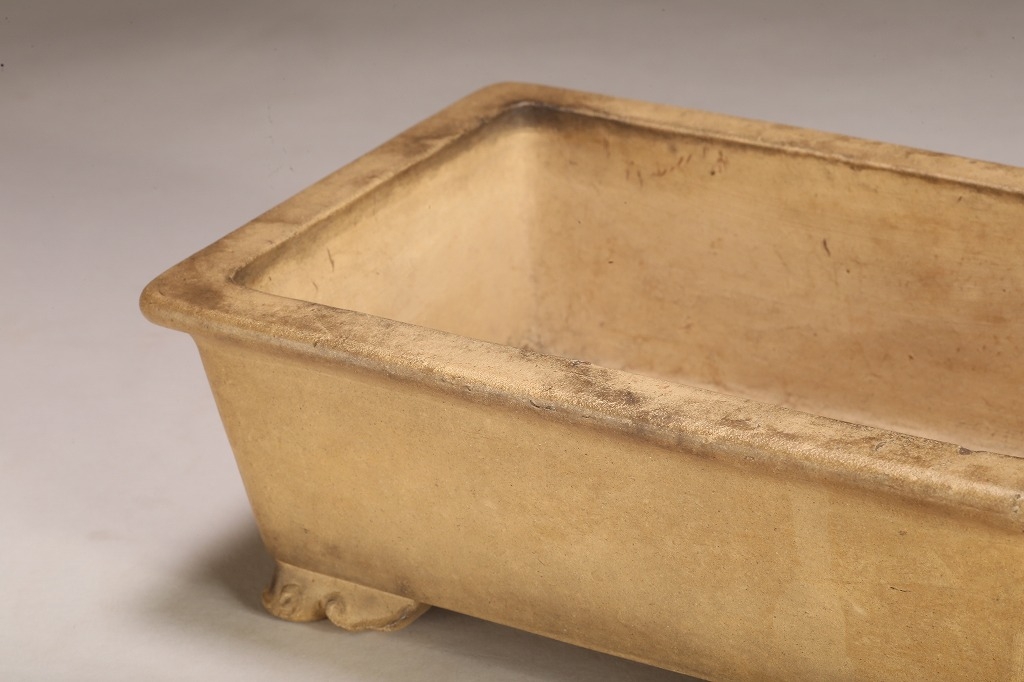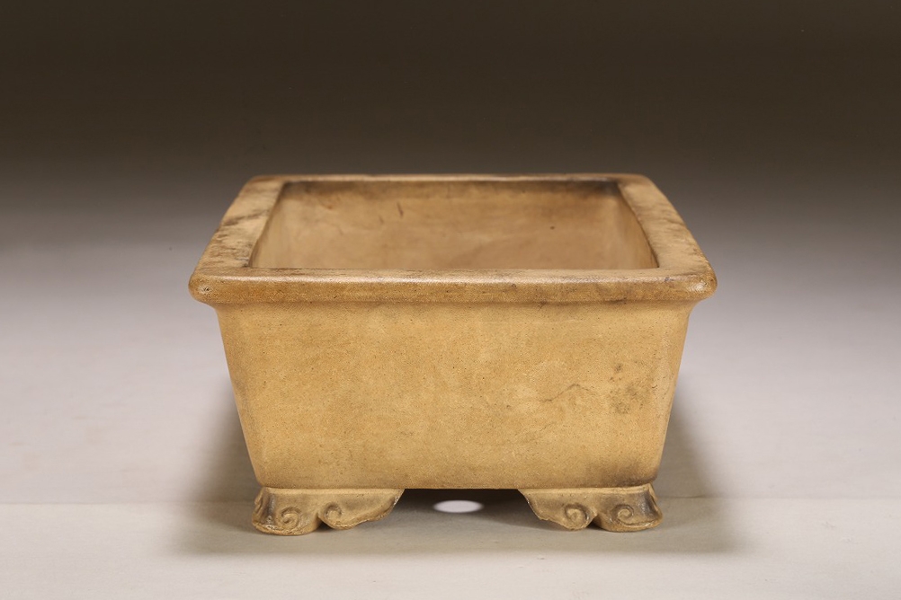 中国中渡り中品鉢の“定番“的な人気のある“葛明白泥“も、現在は稀少性の高い盆器となりました。現地中国宜興でも、このような純粋の白泥は“工芸大師“の称号を持つ人でも、入手すら出来ない材料となってしまいました。紫泥や朱泥などの濃い色合いの土味とは異なり、鉢映りの点でも、中型の取合わせ飾りには、是非とも欲しい逸品です。