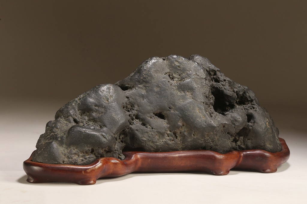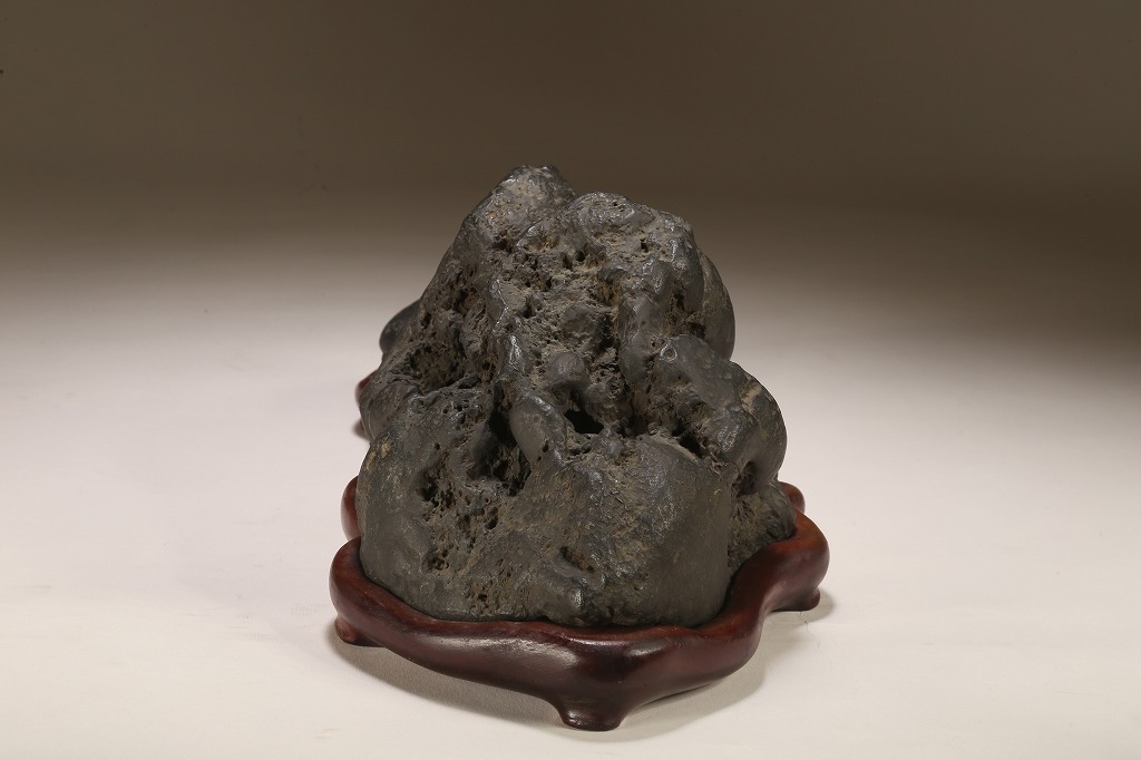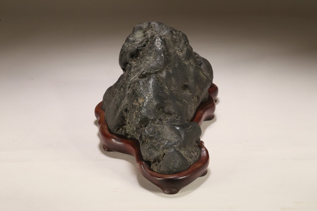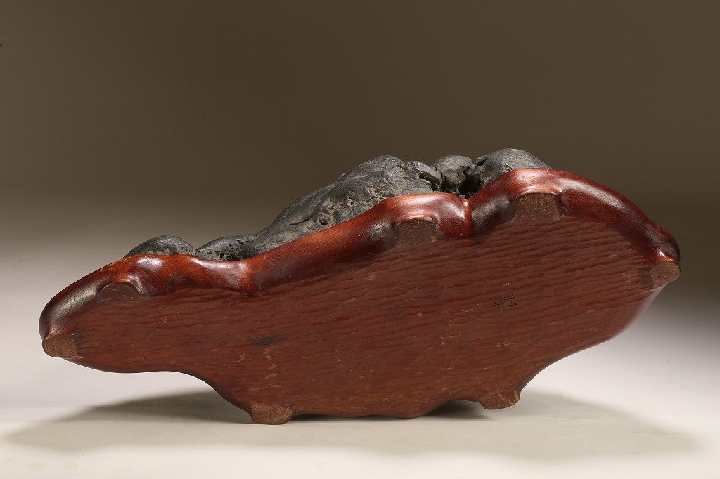 量感豊かな山容を示す“北の名石“ 千軒石の古感見事な一石です。松前古潭とも呼ばれる千軒石は、加茂川石や八海山石と並んで、真黒質の良石の産地として名高く、本石も同産の石の中では古石に入る時代のものです。底部の擦り加工はありますが、台上の石相には一切の加工のない天然石です。台座姿は勿論のこと、水盤仕立てでも、雄大な景趣が楽しめる“王道の一石“です。