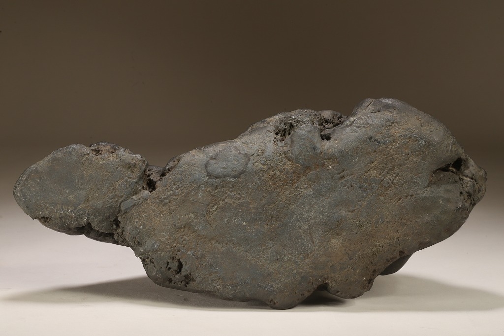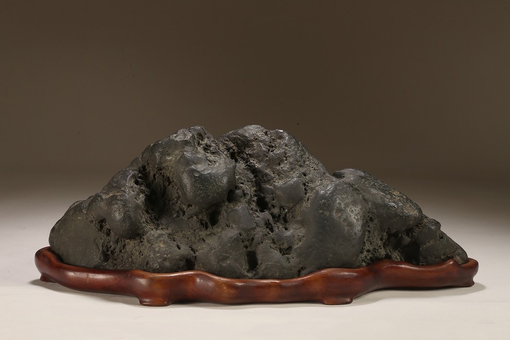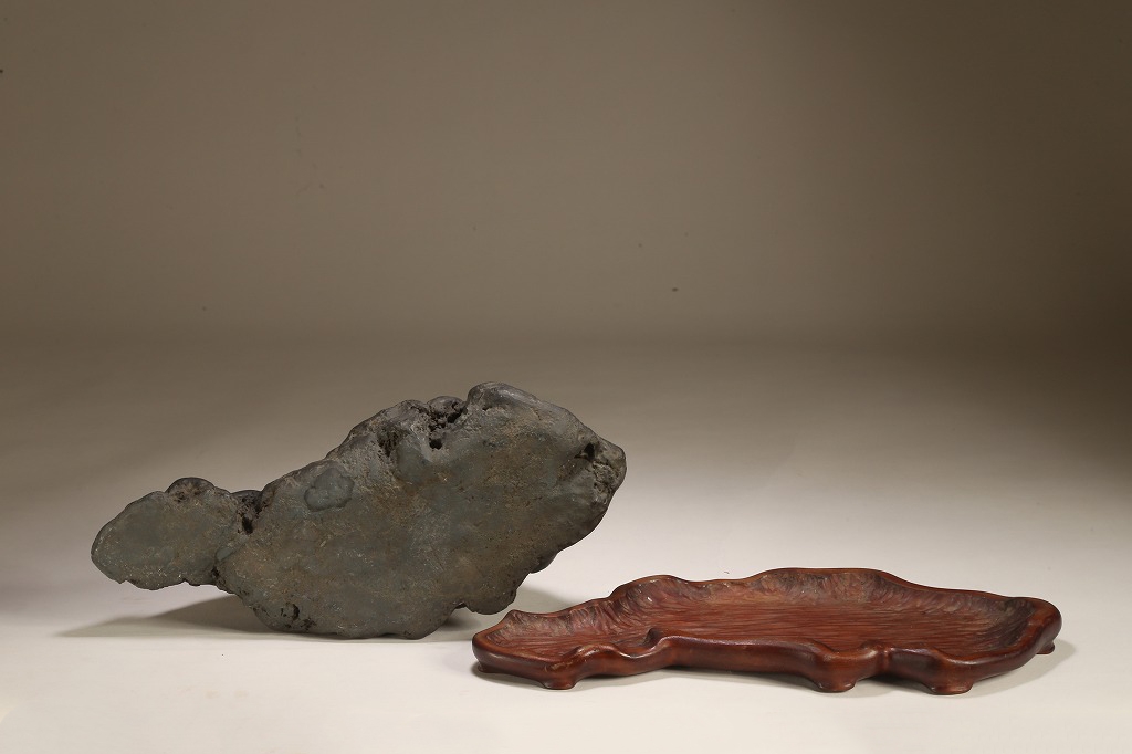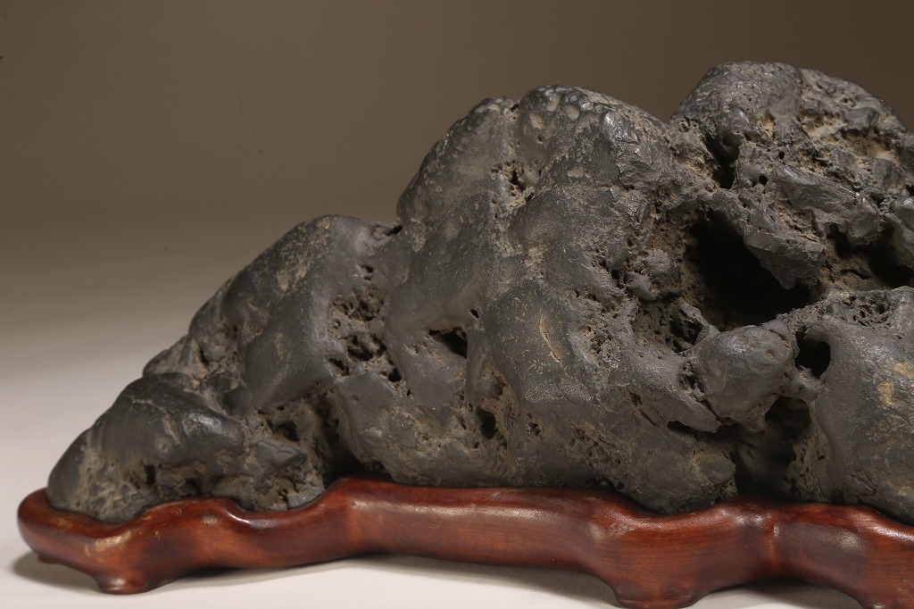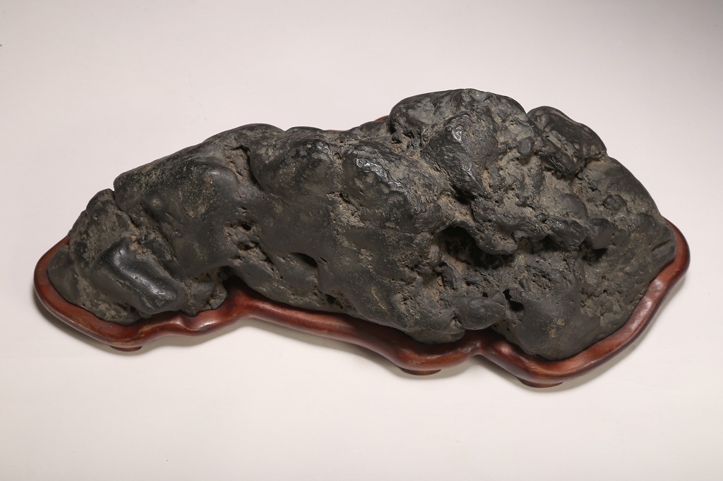 量感豊かな山容を示す“北の名石“ 千軒石の古感見事な一石です。松前古潭とも呼ばれる千軒石は、加茂川石や八海山石と並んで、真黒質の良石の産地として名高く、本石も同産の石の中では古石に入る時代のものです。底部の擦り加工はありますが、台上の石相には一切の加工のない天然石です。台座姿は勿論のこと、水盤仕立てでも、雄大な景趣が楽しめる“王道の一石“です。