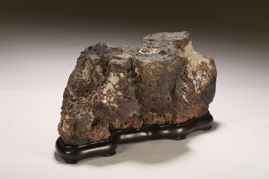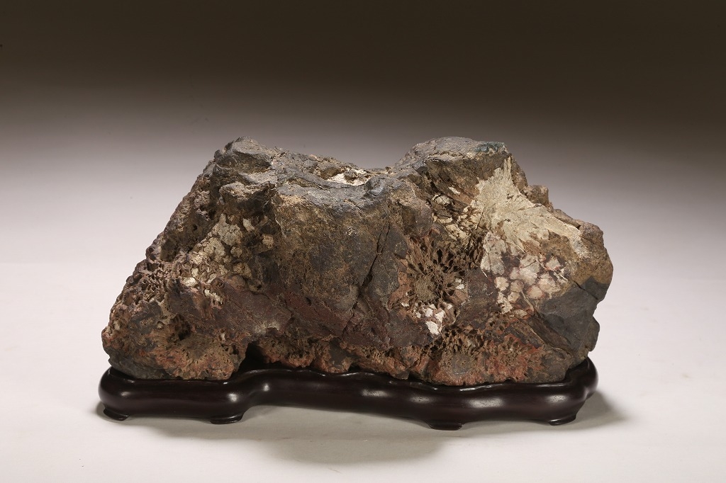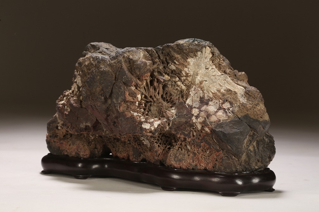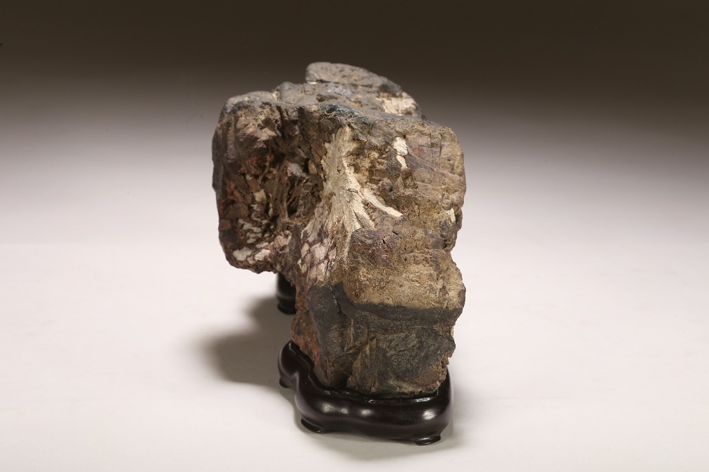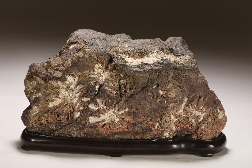 深味のある母岩の石質と色調、菊花石の最上質と言われる根尾谷に産したこの石は、石の各所に渋みある白色の菊花を見せています。紋様石としてどちらかと言えば派手な菊花が多い中、このような侘び寂びを感じさせる石は、往時より盆栽愛好家が好むものでした。底部に至るまで加工なき天然石。目利き必見の一石です。