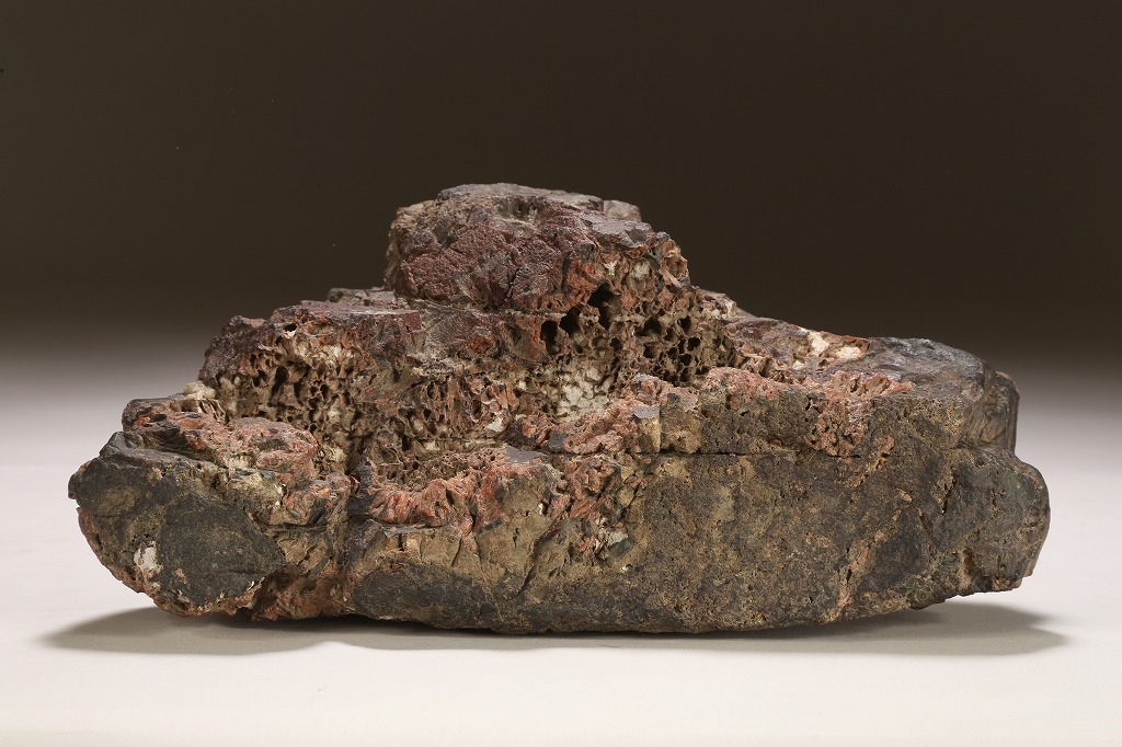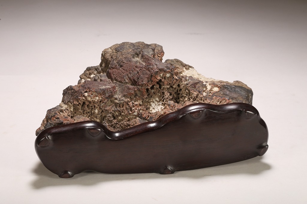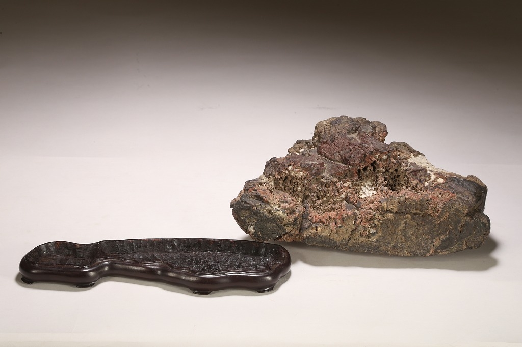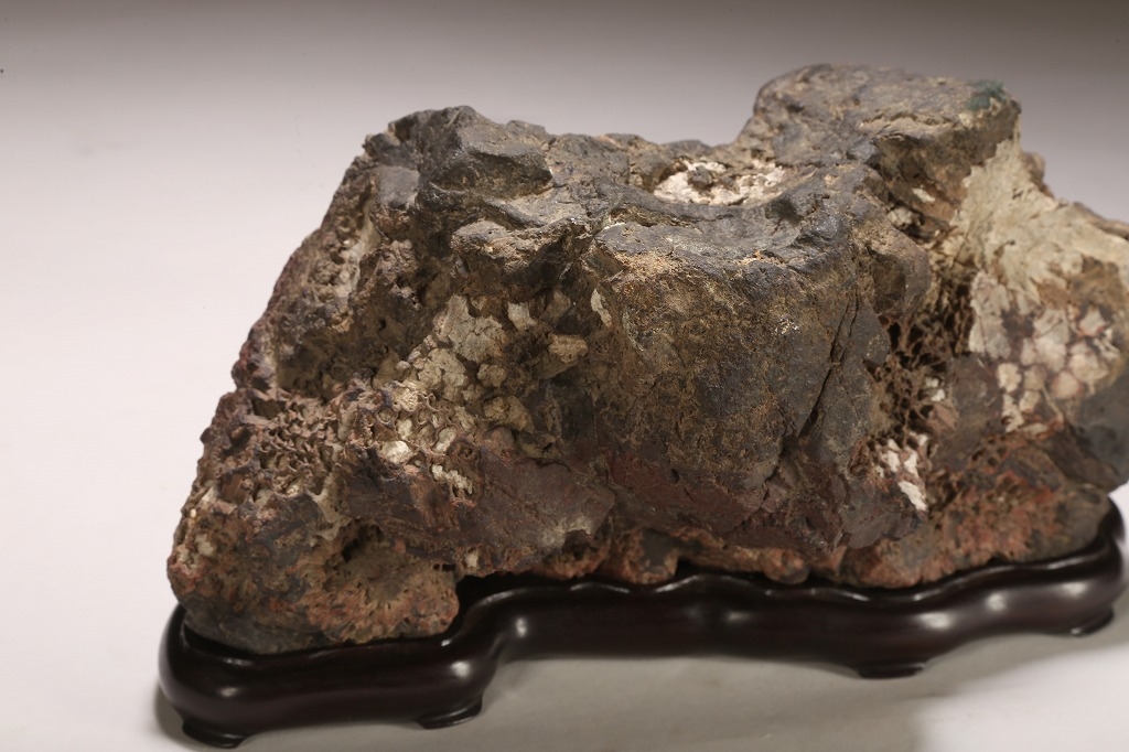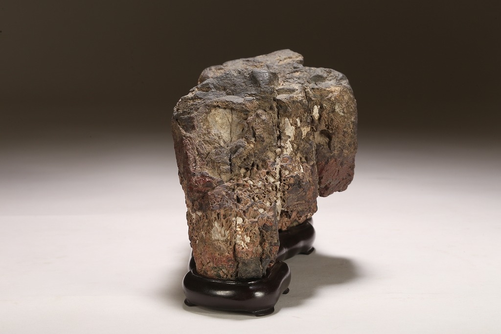 深味のある母岩の石質と色調、菊花石の最上質と言われる根尾谷に産したこの石は、石の各所に渋みある白色の菊花を見せています。紋様石としてどちらかと言えば派手な菊花が多い中、このような侘び寂びを感じさせる石は、往時より盆栽愛好家が好むものでした。底部に至るまで加工なき天然石。目利き必見の一石です。