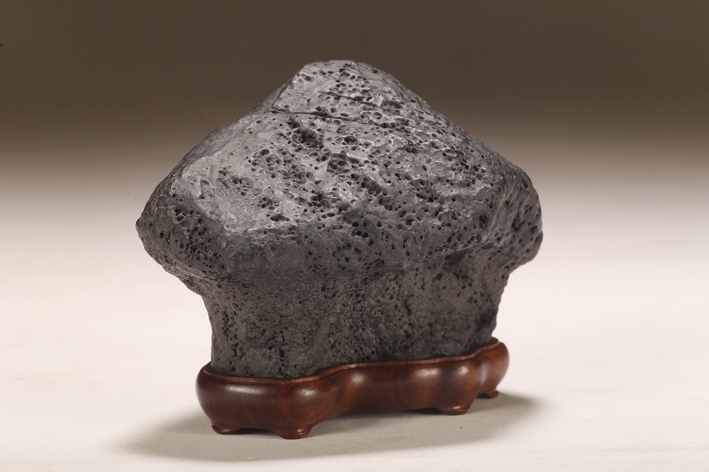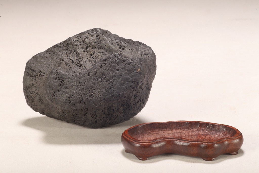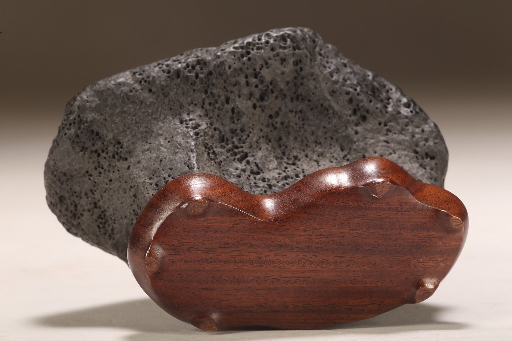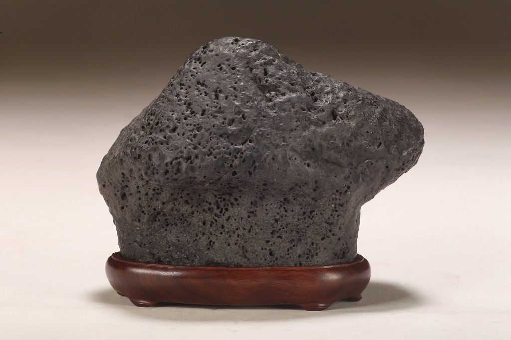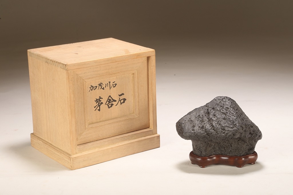 真黒質に巣立が入った長閑な石姿の茅屋石です。丸味を帯びた石相が、様々な場面での展示に適しています。姿石は、“何処となく感じる“程度の見立てが良いとされます。寸法も茶室飾りや、文人盆栽との取合わせにも使いやすい一石です。