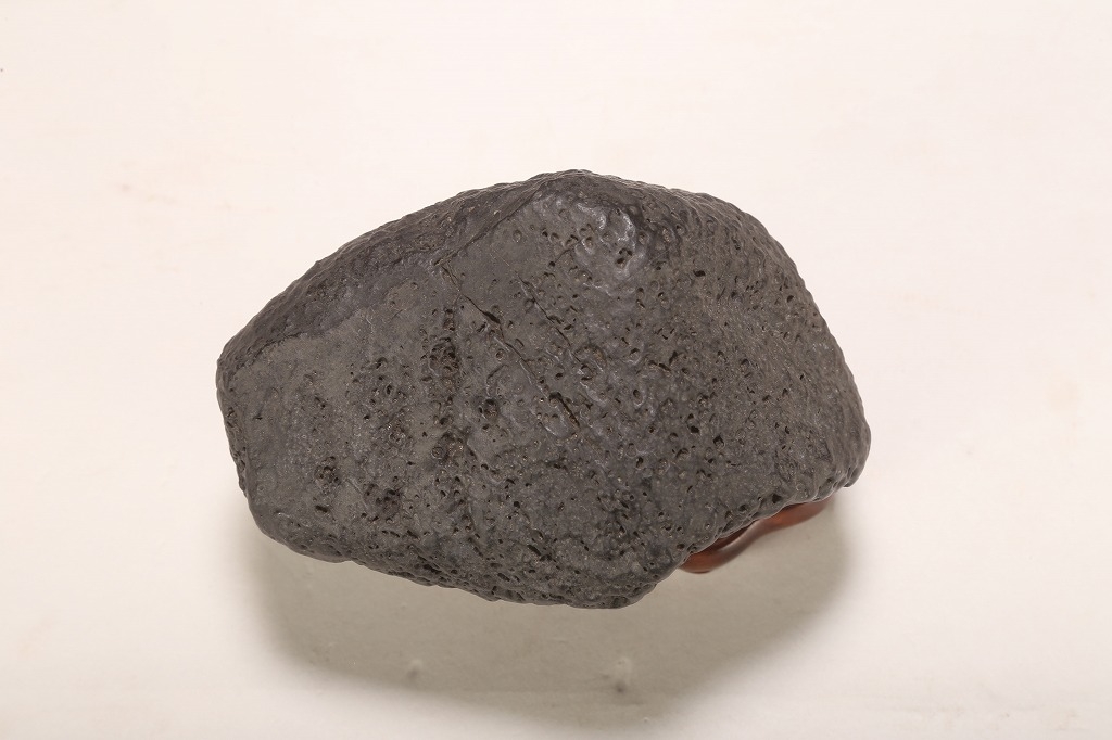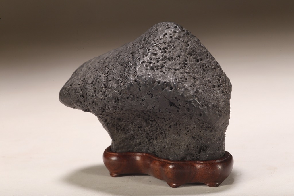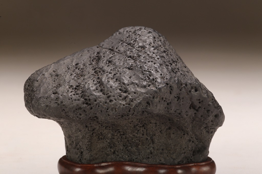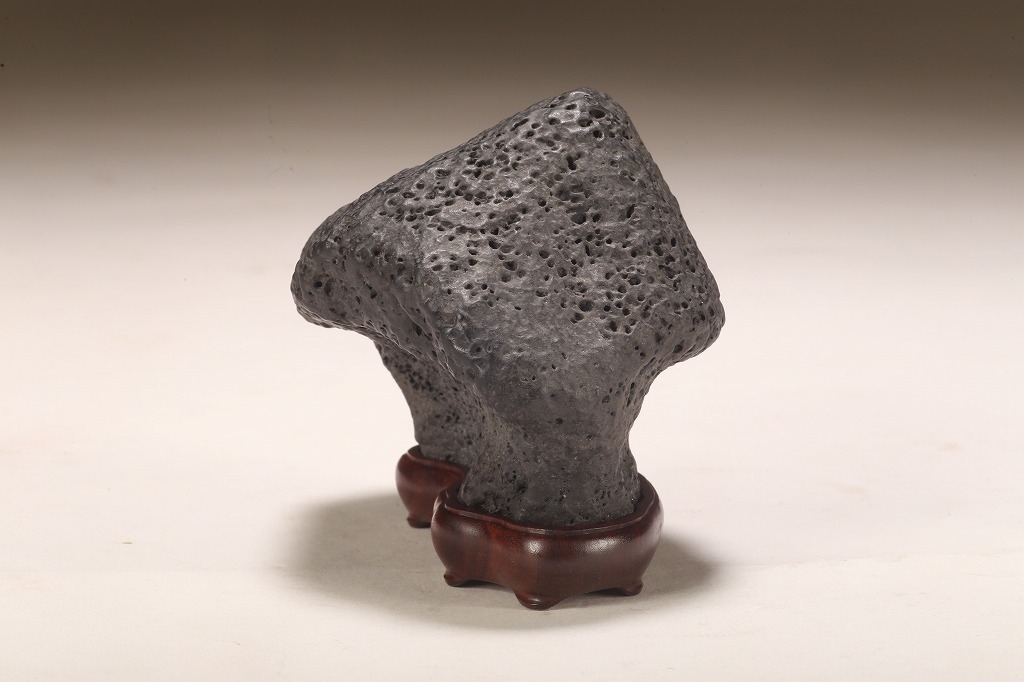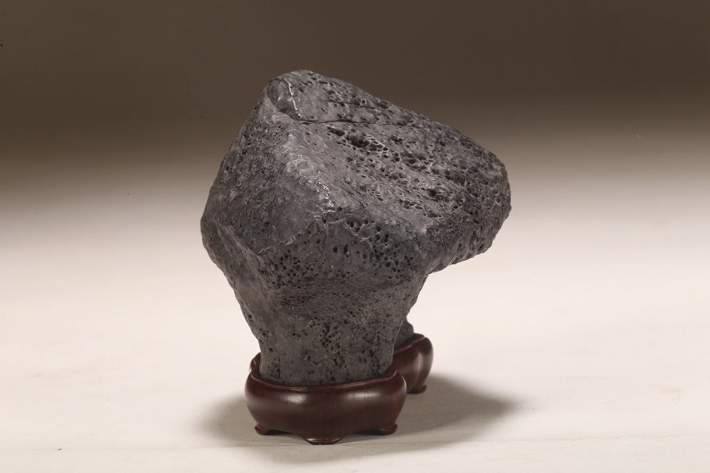 真黒質に巣立が入った長閑な石姿の茅屋石です。丸味を帯びた石相が、様々な場面での展示に適しています。姿石は、“何処となく感じる“程度の見立てが良いとされます。寸法も茶室飾りや、文人盆栽との取合わせにも使いやすい一石です。