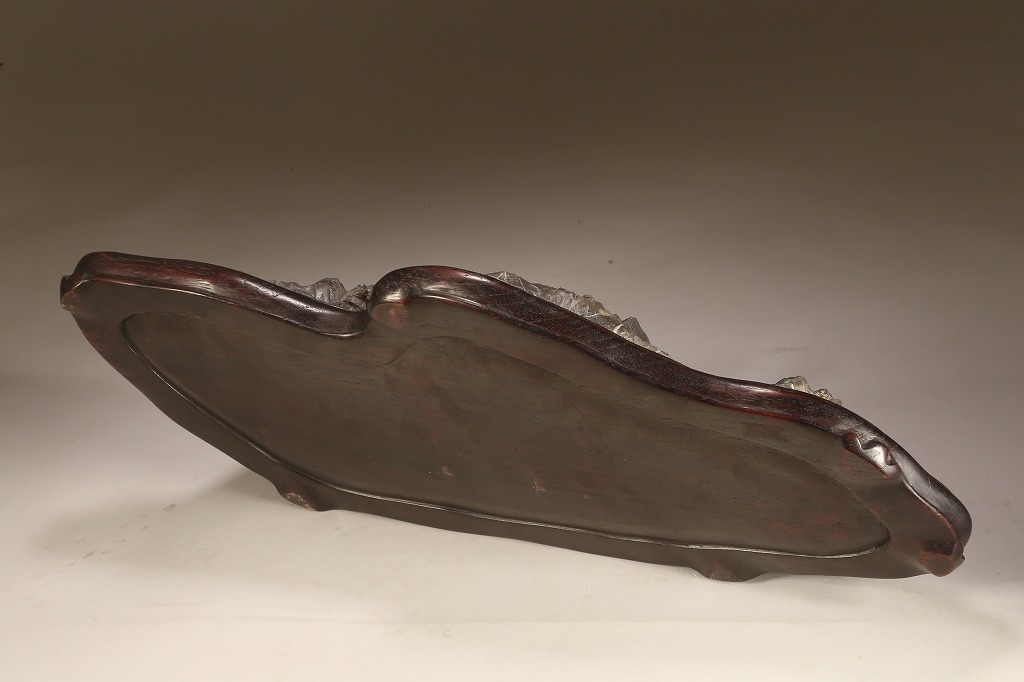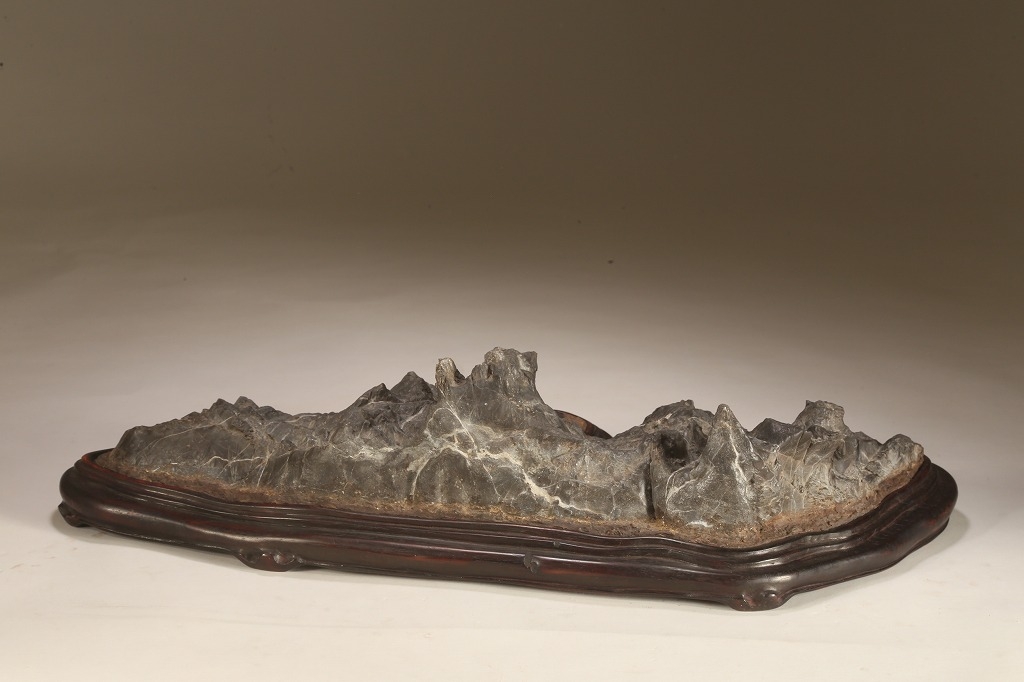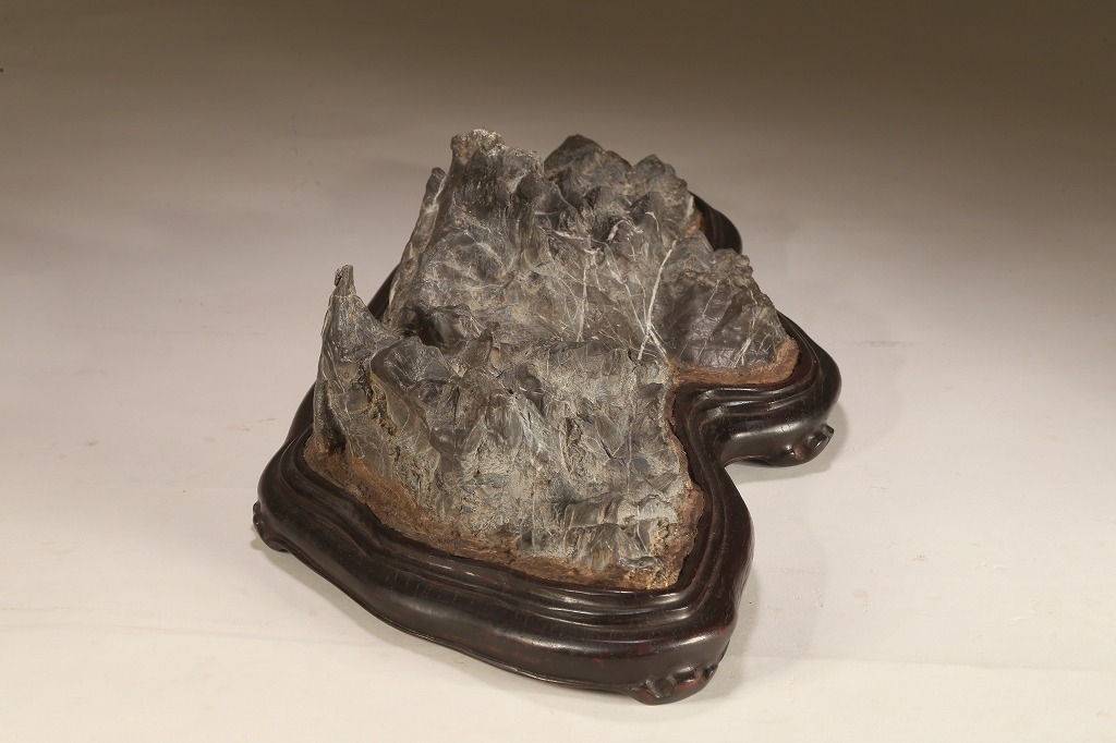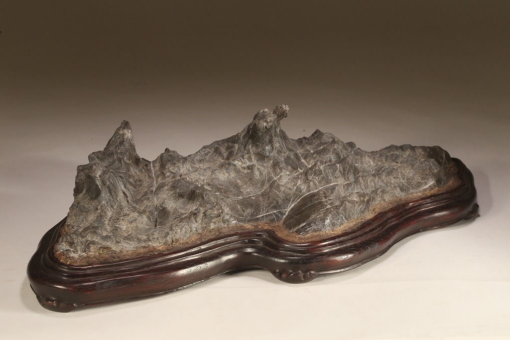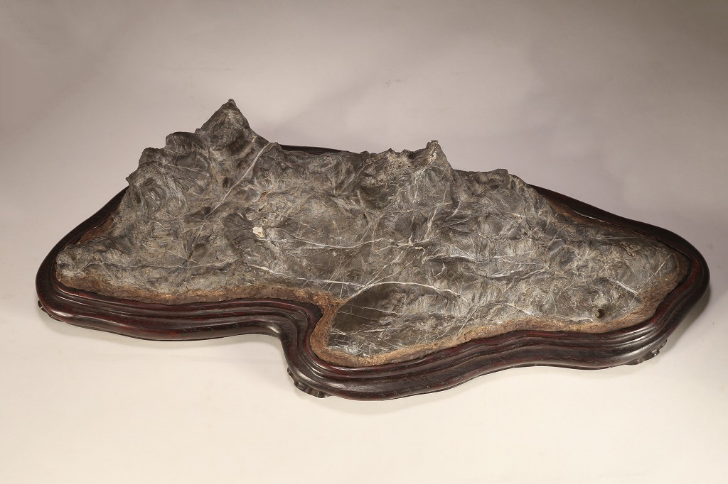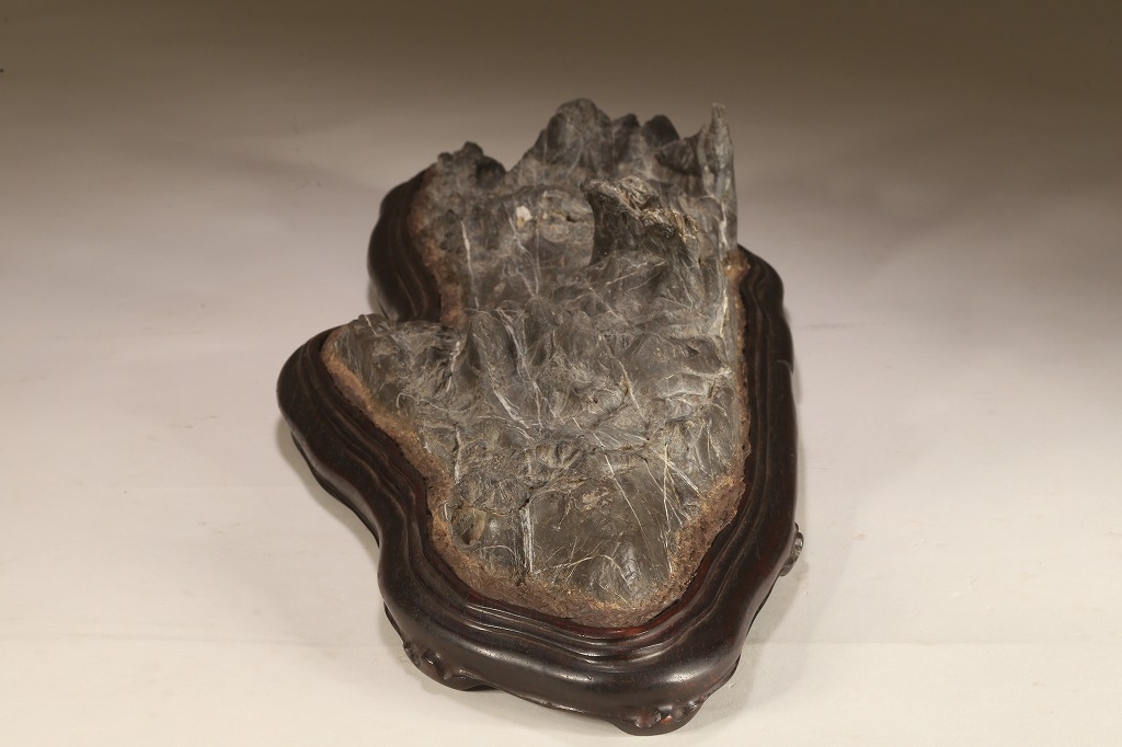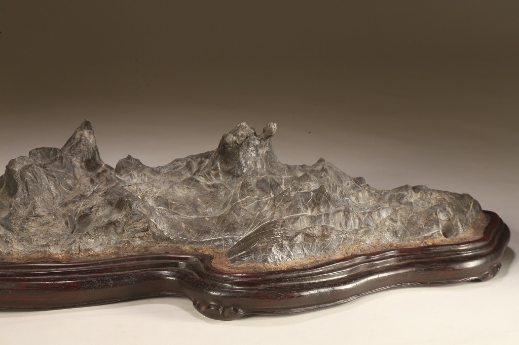 果てしなく続く大陸の山々を連想させる重畳たる風景。古谷石において、これだけの大型石は、ご紹介できる僅かな機会のものです。台座回りは“練り下駄“と呼ばれる作りですが、石相を含めて、著名水石展でも、一際の注目を浴びる石です。