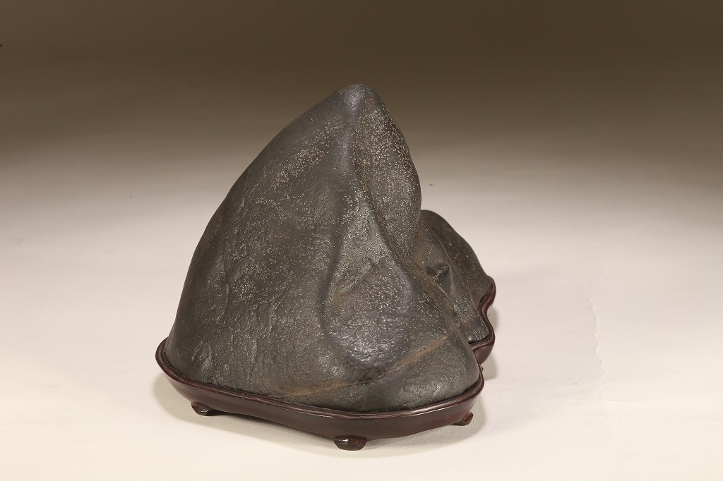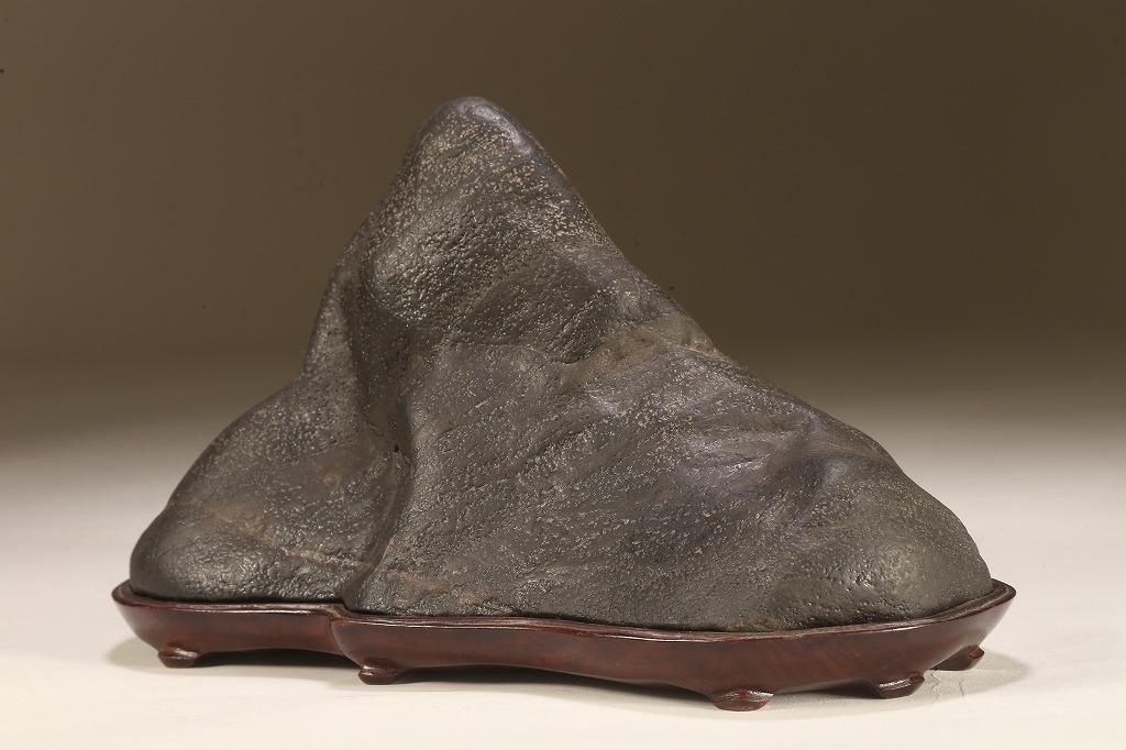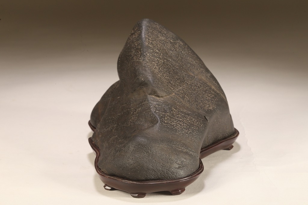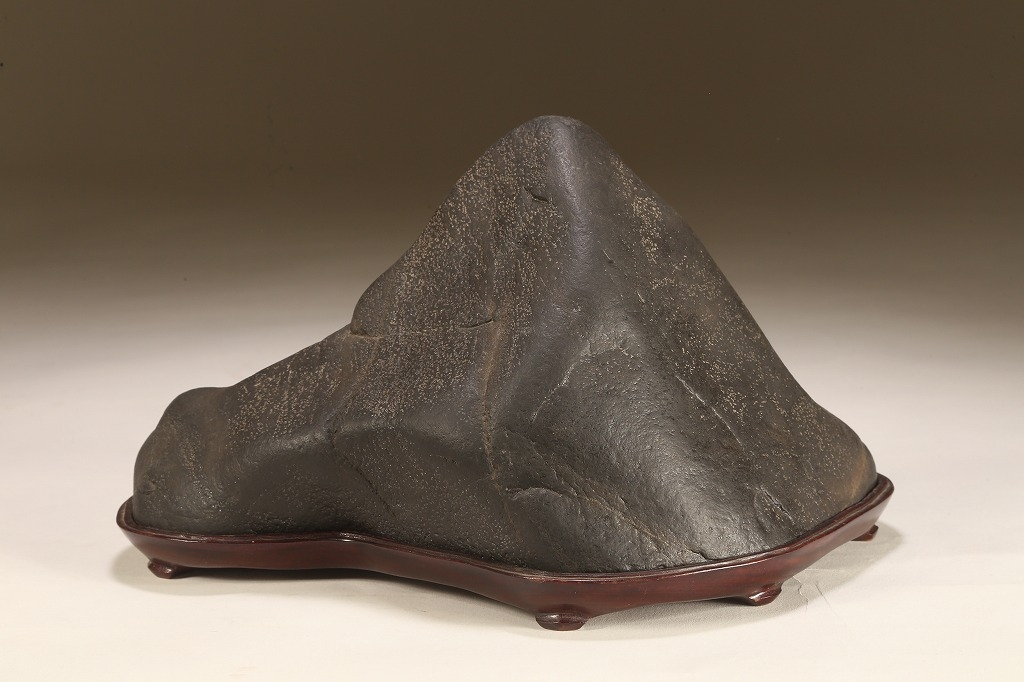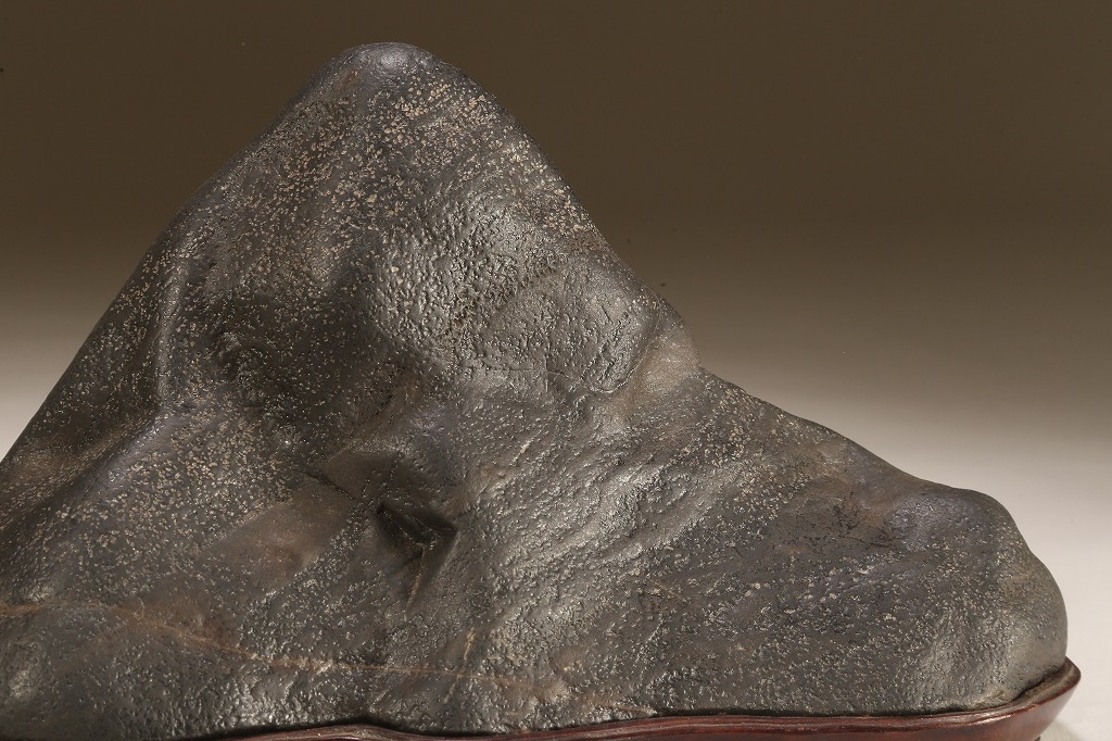 真黒質に美しい細やかな“梨地“を全面に帯びた、瀬田川石の秀石です。“泰山の風“と言える“三面の法則“を具現したこの石は、山型石の王道と言える石相。台座よし水盤飾りよしの格調高いものです。底部の擦り加工以外、台上の景色に一切の加工はありません。