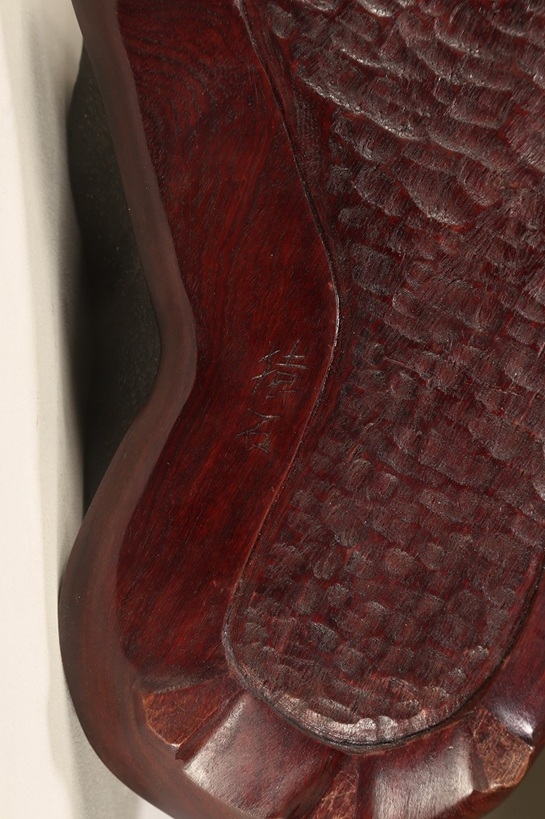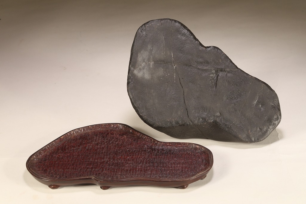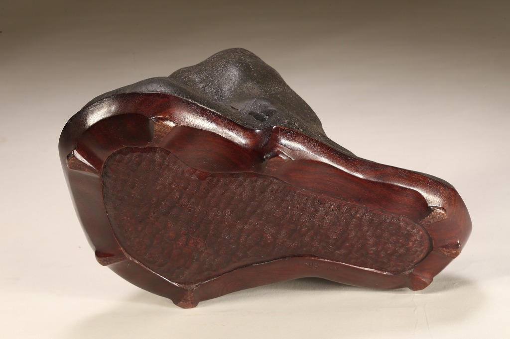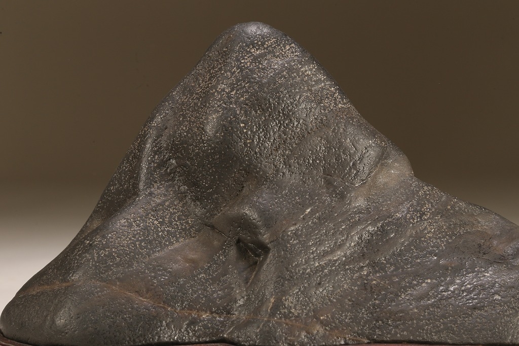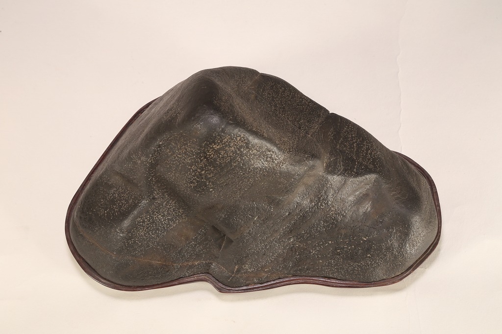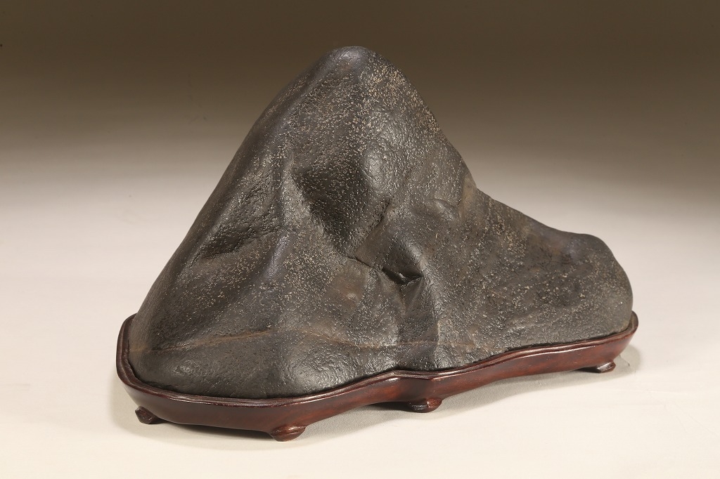 真黒質に美しい細やかな“梨地“を全面に帯びた、瀬田川石の秀石です。“泰山の風“と言える“三面の法則“を具現したこの石は、山型石の王道と言える石相。台座よし水盤飾りよしの格調高いものです。底部の擦り加工以外、台上の景色に一切の加工はありません。