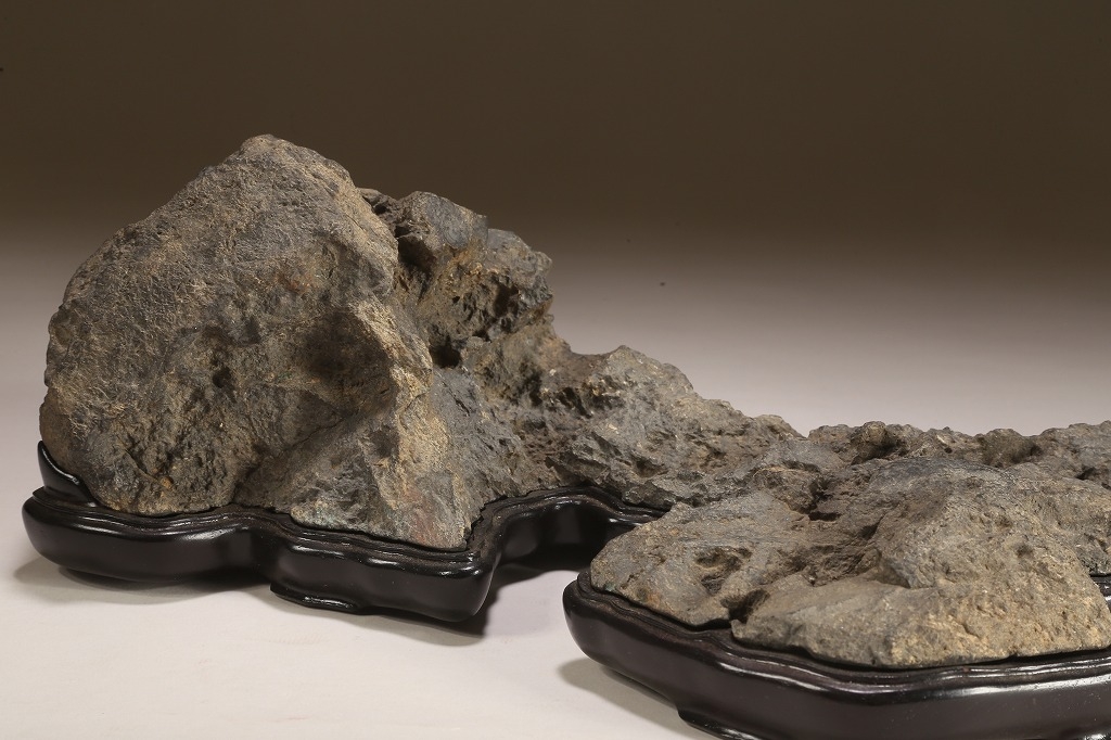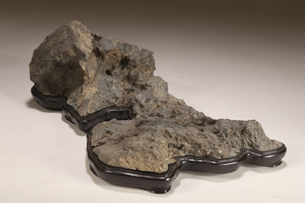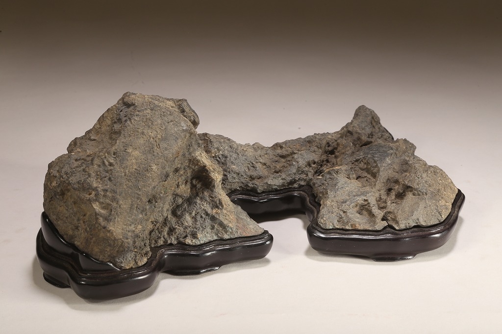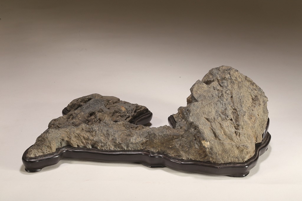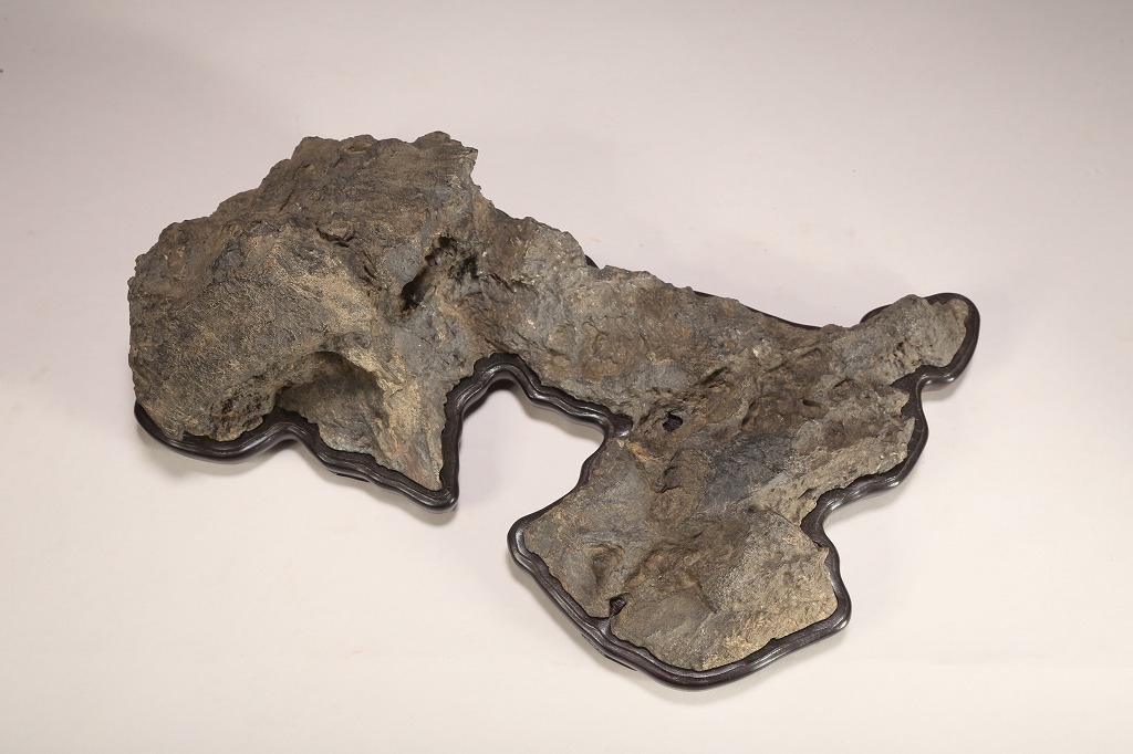 枯れ寂びた石肌、宛らこの大八洲の何処かの島々や入江を想わせる、景趣豊かな台座石です。山姿から伸びる岬の景、水盤でどれ程の世界が広がるか楽しみなこの石は、底部の切りフカシ加工以外、台座上の石相に一切の加工を持たない天然石です。唐木の台座作りも秀抜。