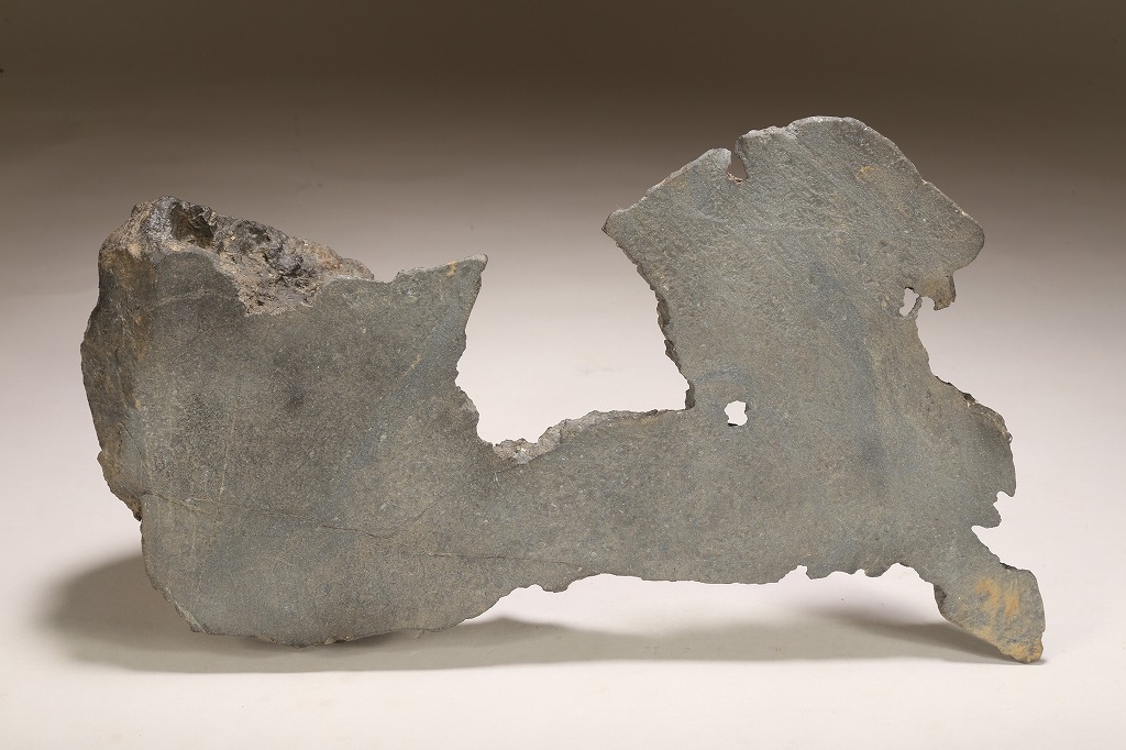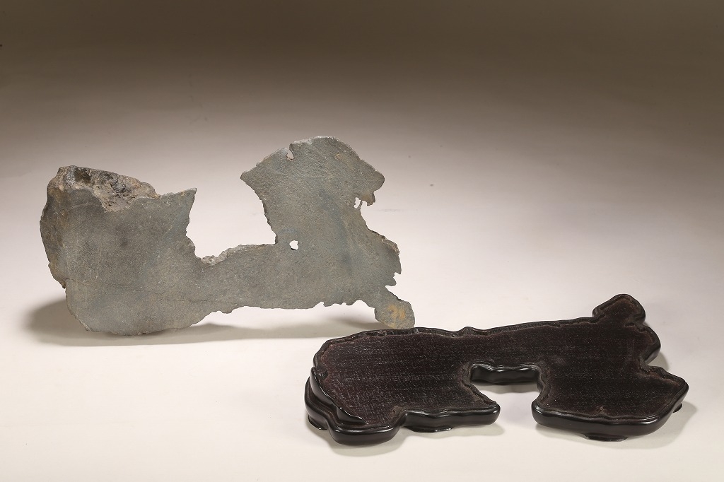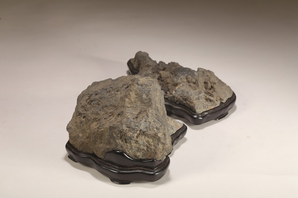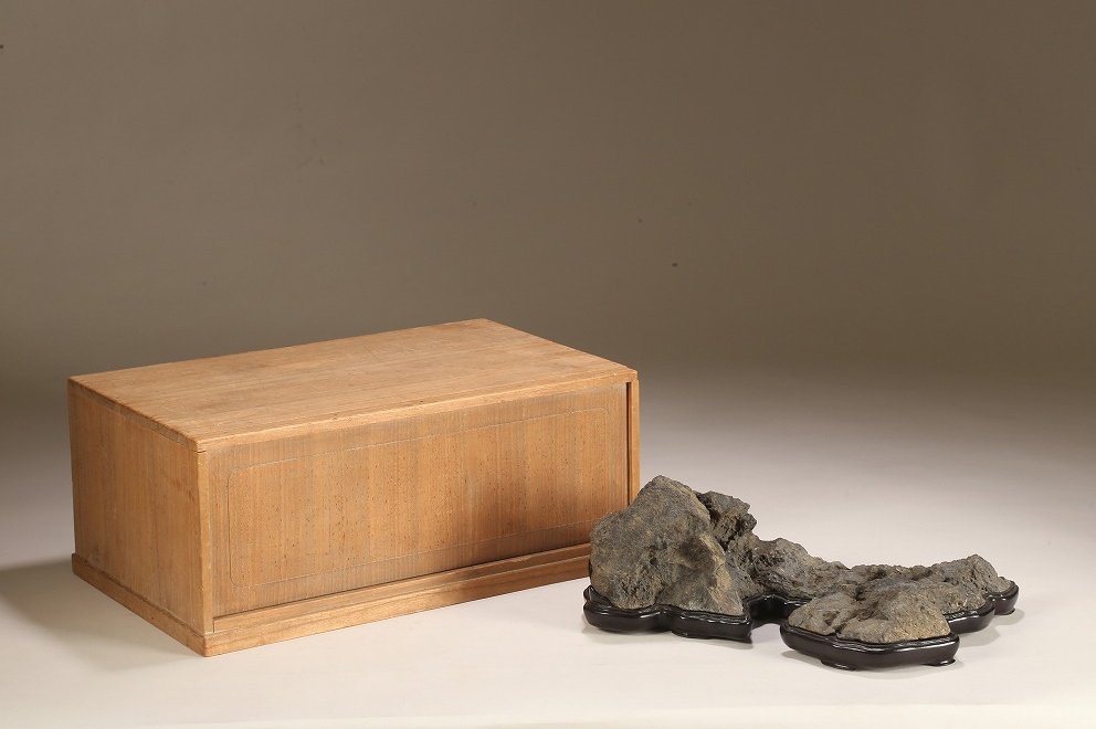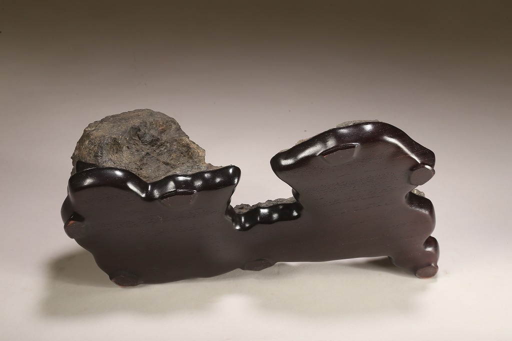 枯れ寂びた石肌、宛らこの大八洲の何処かの島々や入江を想わせる、景趣豊かな台座石です。山姿から伸びる岬の景、水盤でどれ程の世界が広がるか楽しみなこの石は、底部の切りフカシ加工以外、台座上の石相に一切の加工を持たない天然石です。唐木の台座作りも秀抜。