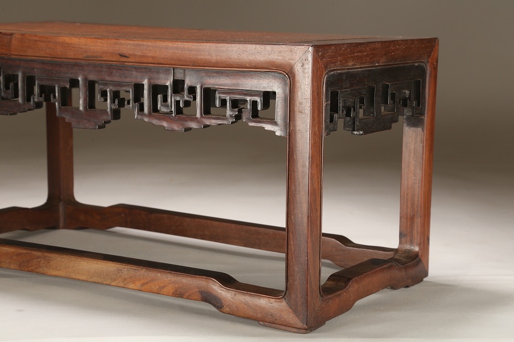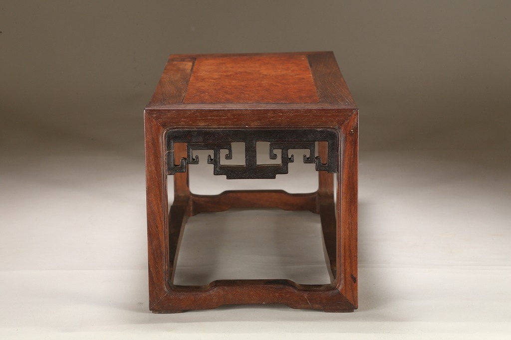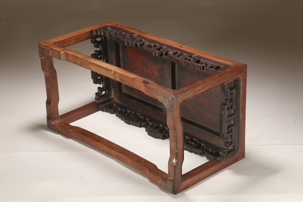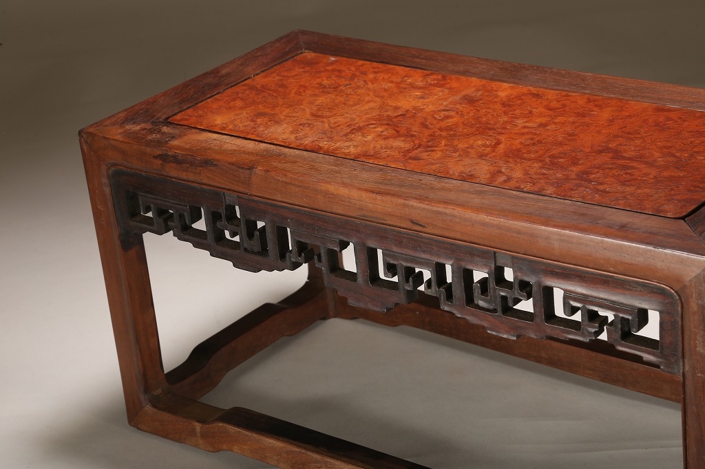 約100年前の渡来文房中品卓です。贅沢な紫檀の良材によって、堅牢な柱や足廻りを作り、天板には葡萄杢の無垢材を使用しています。幕飾りの意匠も“逆水切り“と言う最も手間のかかる匠技が駆使されています。シンプルな姿が、盆石から中品盆栽まで使い勝手の幅広い“実用の名卓です。