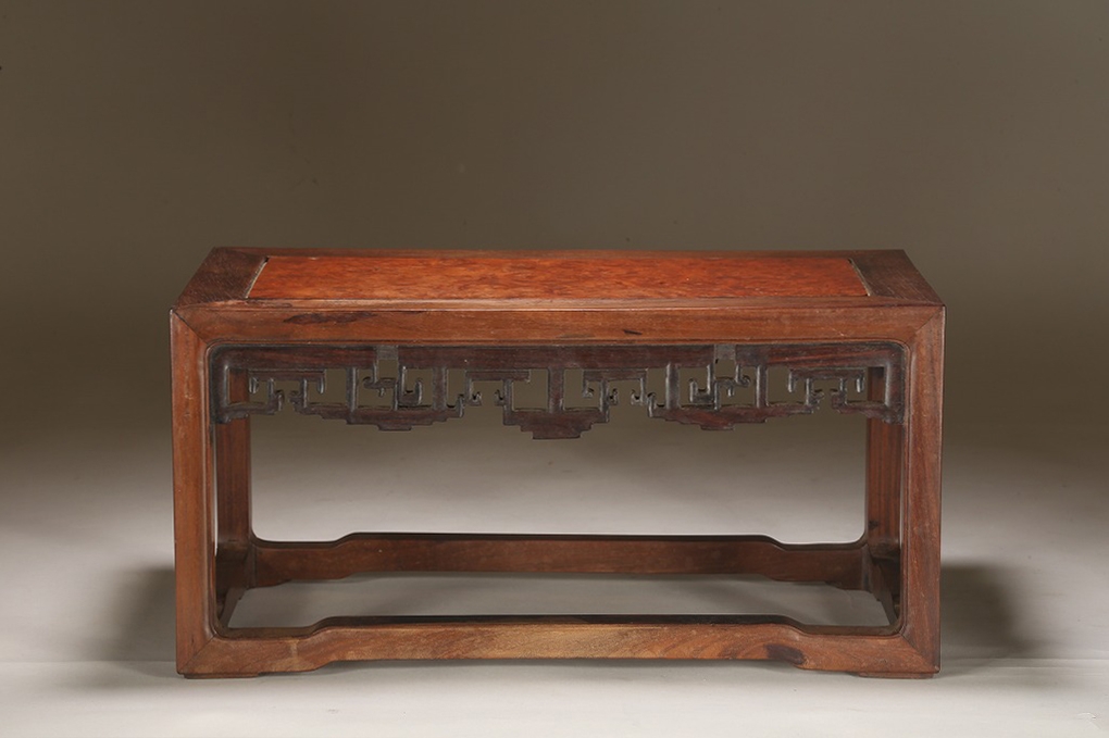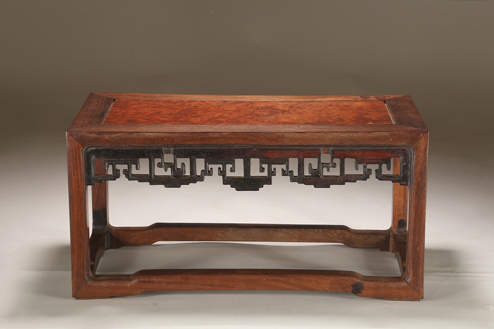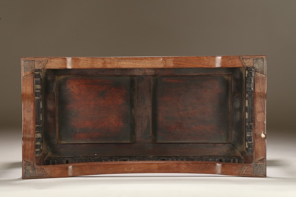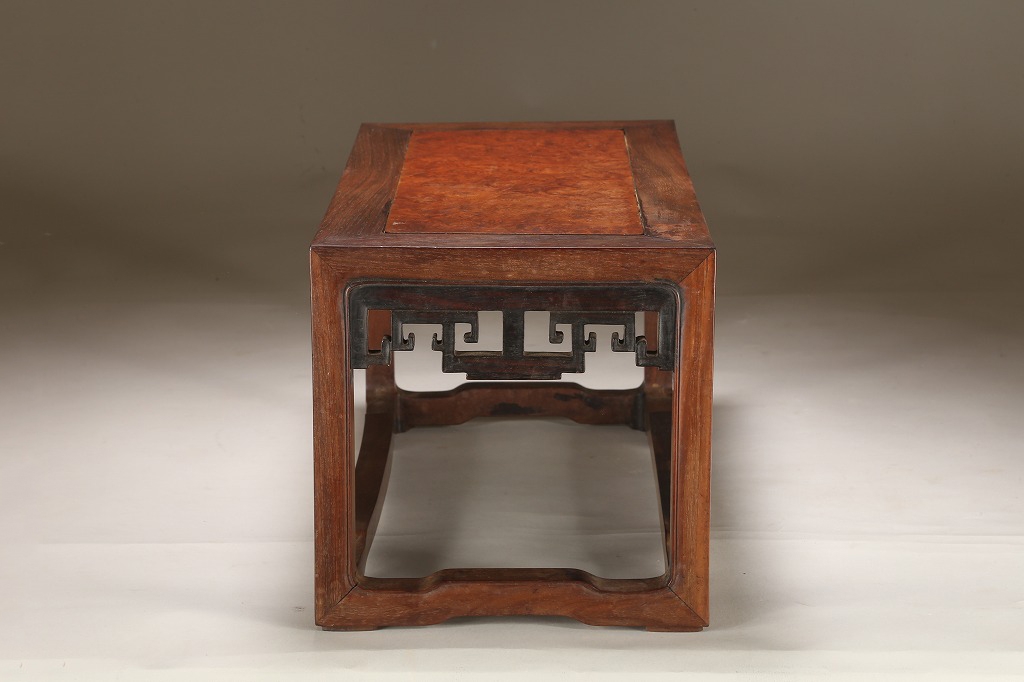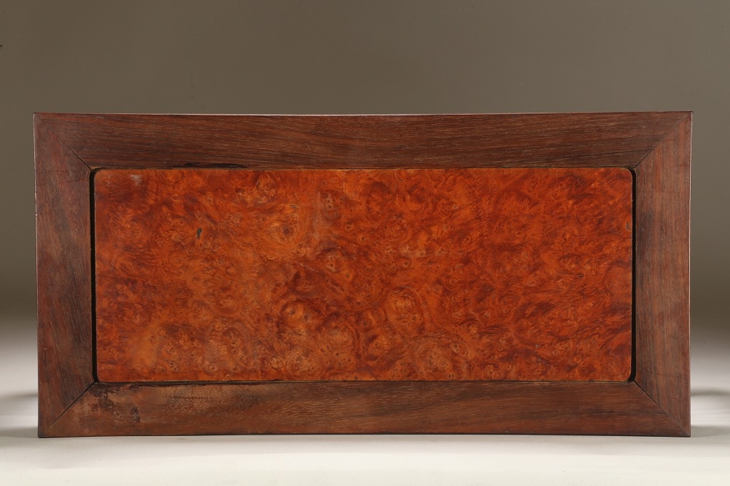 約100年前の渡来文房中品卓です。贅沢な紫檀の良材によって、堅牢な柱や足廻りを作り、天板には葡萄杢の無垢材を使用しています。幕飾りの意匠も“逆水切り“と言う最も手間のかかる匠技が駆使されています。シンプルな姿が、盆石から中品盆栽まで使い勝手の幅広い“実用の名卓です。