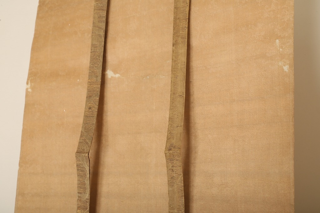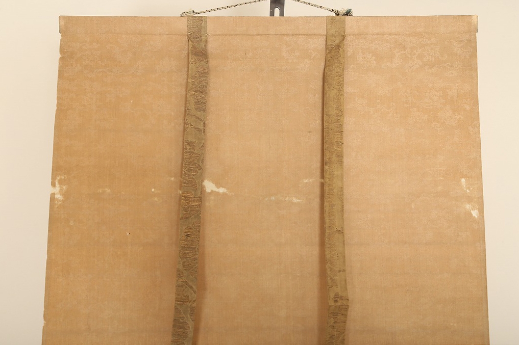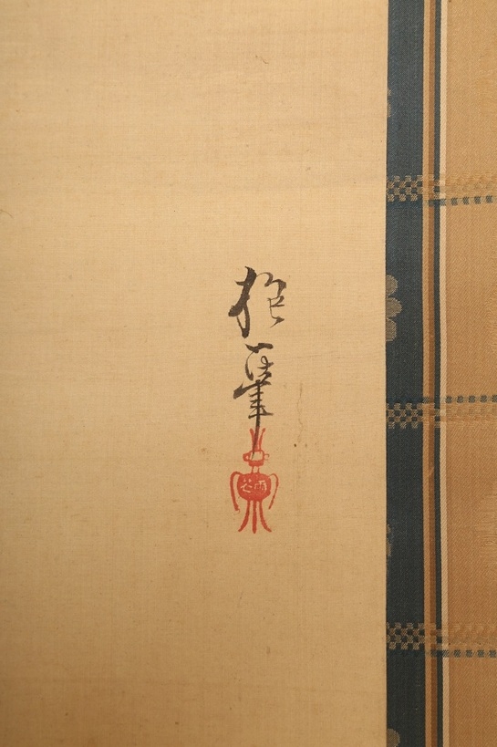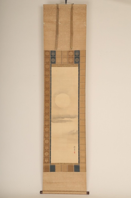 酒井抱一(1761~1829)は、江戸琳派の祖とされる画家ですが、現在の美術市場では、ある程度の名家や来歴が明確でないものは、正式な鑑定が出来ないものが多く、本作も未鑑定品としてご紹介します。絹本で描かれた雲月の様は、盆栽水石に最適な道具立てと言えます。江戸琳派らしく、表具も古色ある時代物、古裂に菊桐が見える所から、それなりの家格で楽しまれていたものでしょう。表具上部を含めて、スレ・剥離・シミ・などがありますが、展示会の掛物としては上々の保存と言えます。