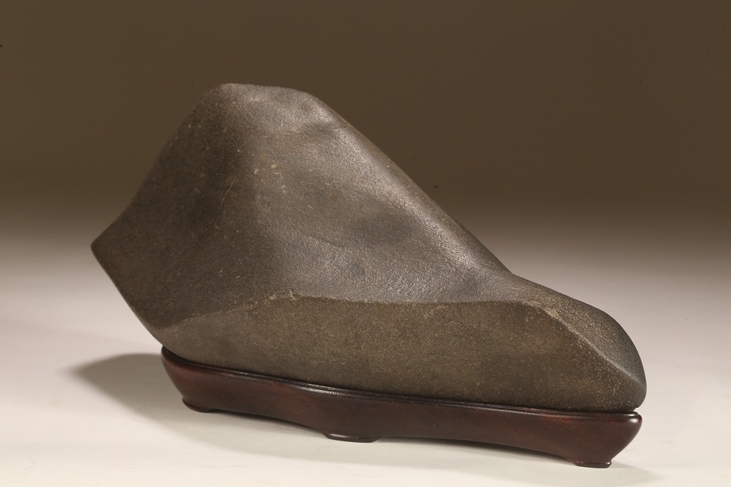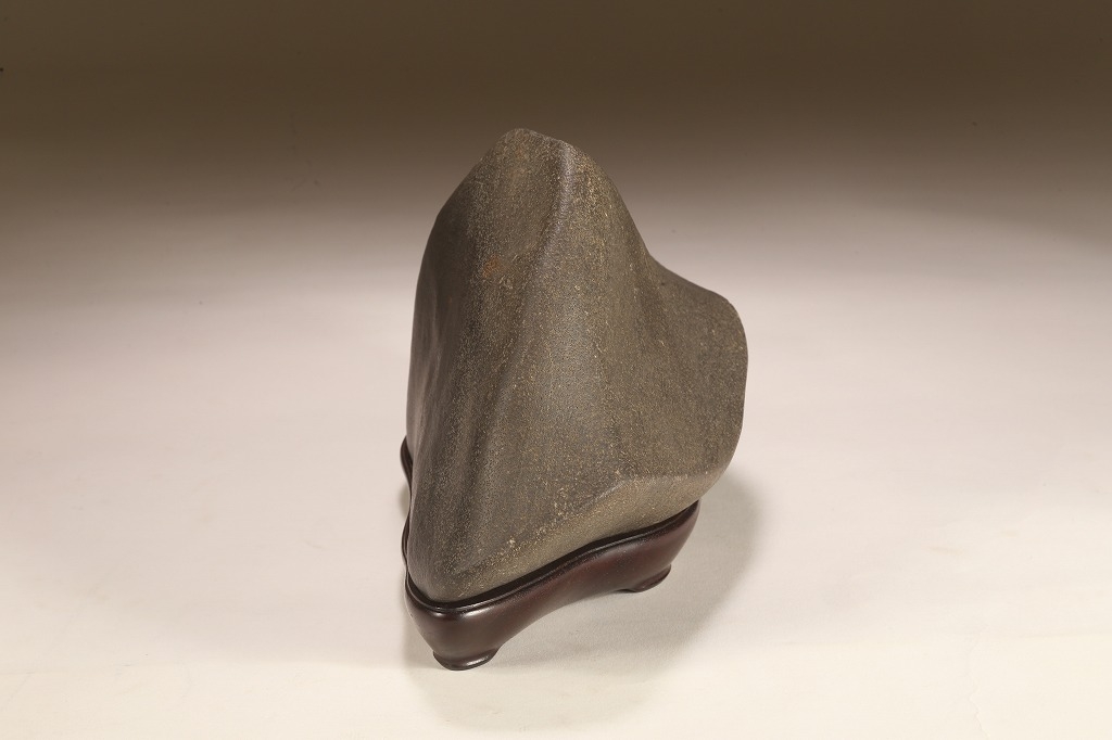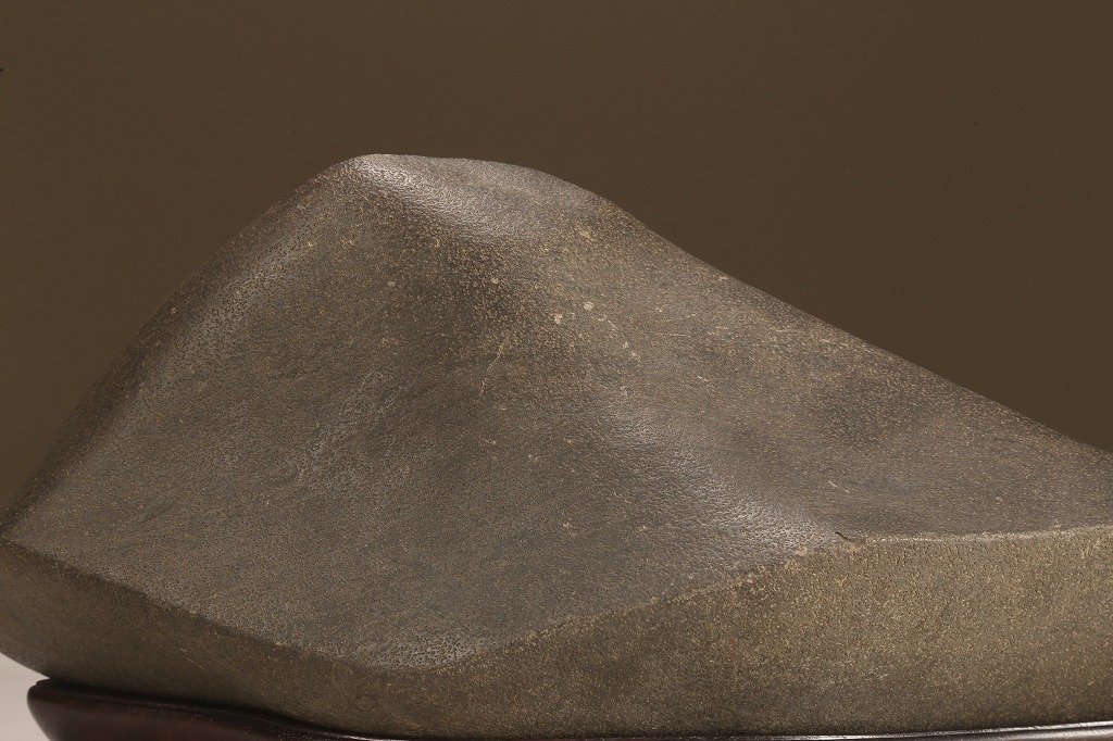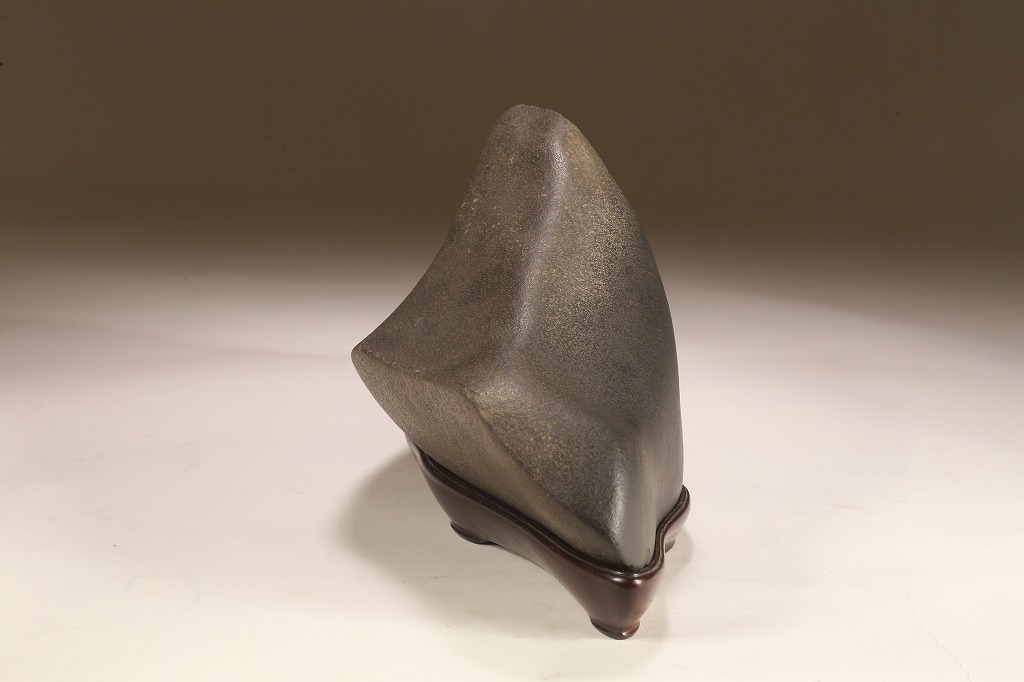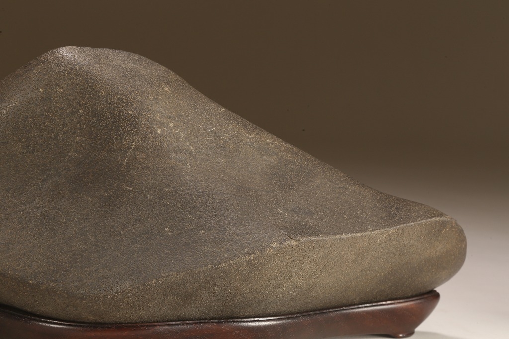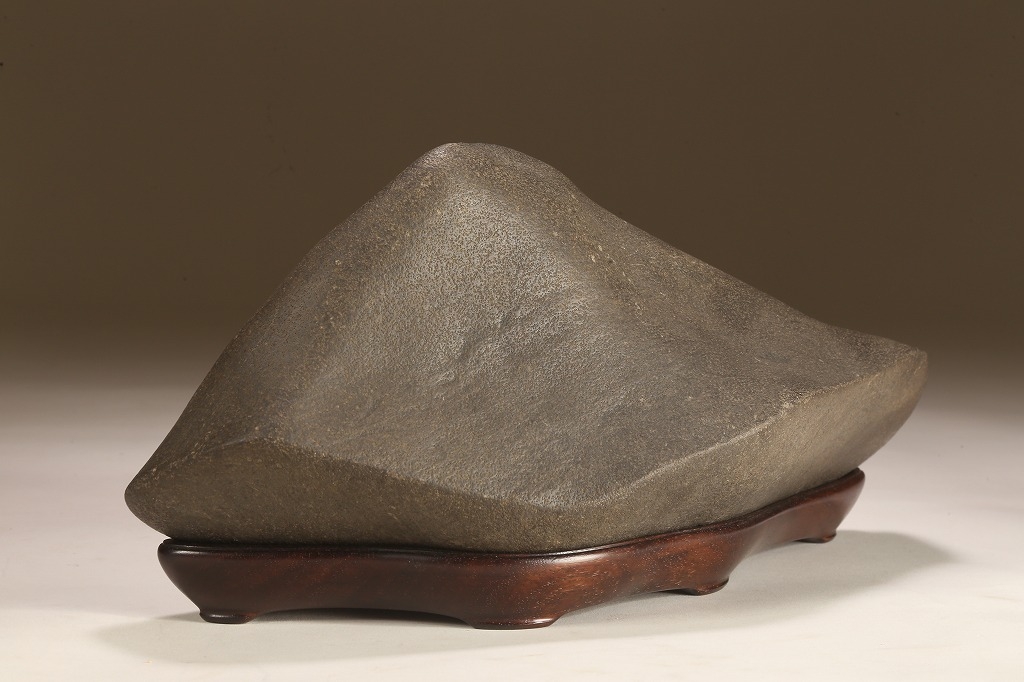 きめ細やかな透徹した石肌、底部も含めて一切の加工なき天然ウブ成りのこの瀬田川石は、山型石としての格調と、景趣を超えた哲学的な“禅味“すら感得出来る賓石です。ウブ成りで展示会向けの寸法を持つ同産の石が激減する中、お薦めの一石です。