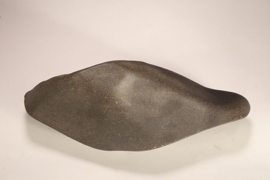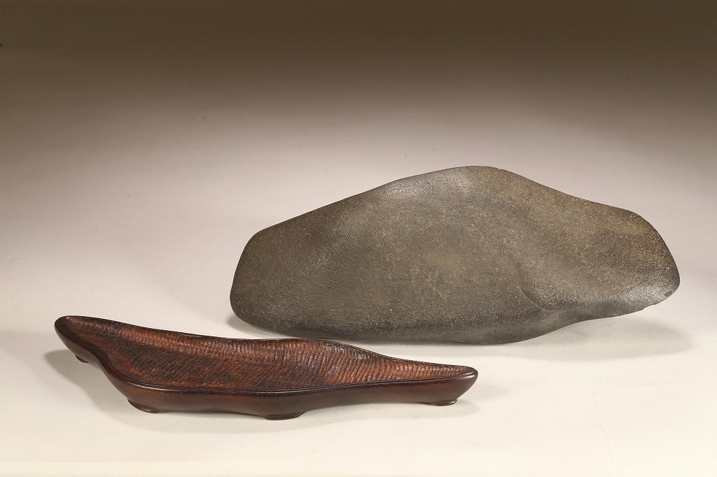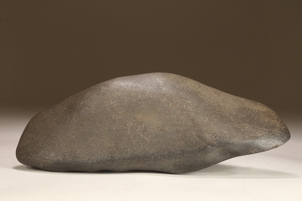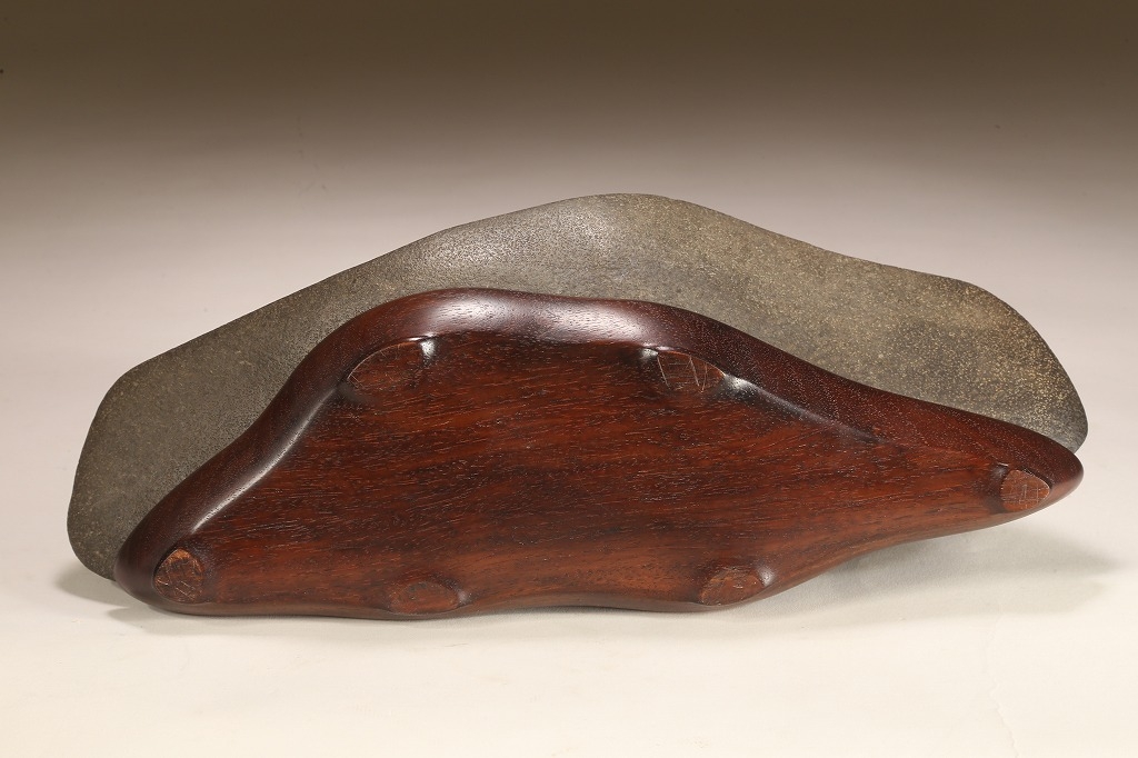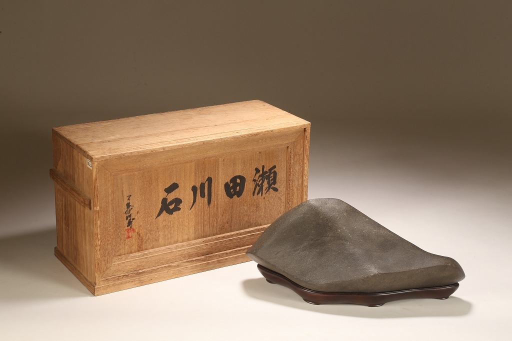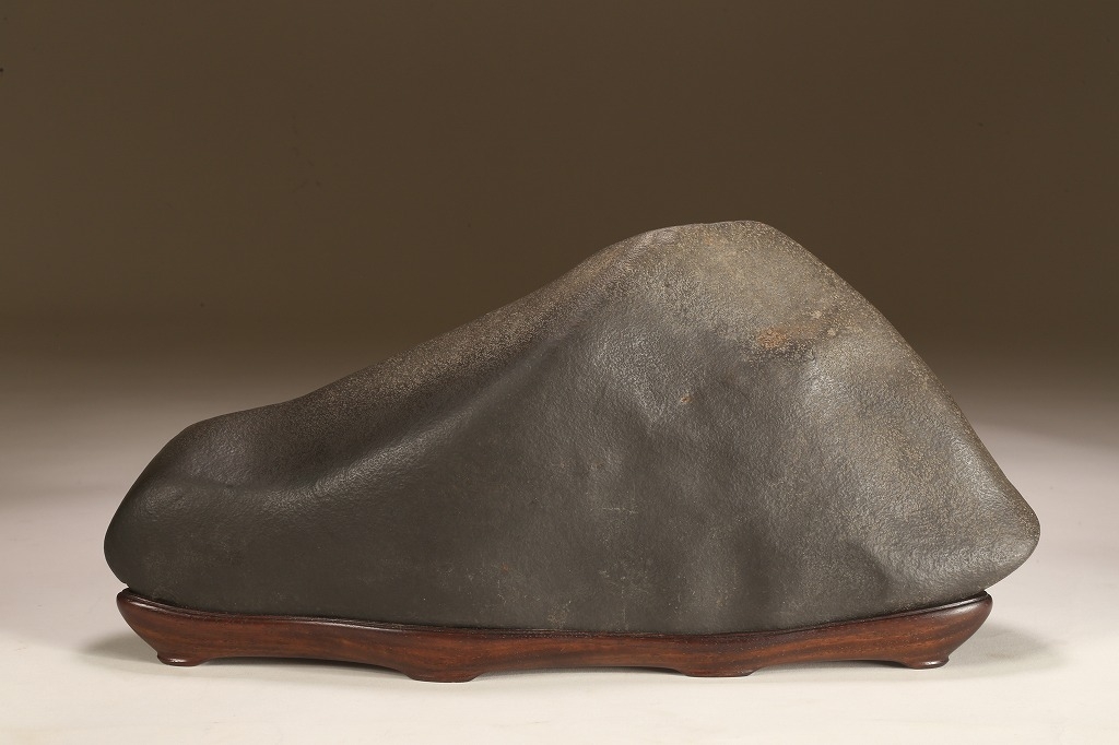 きめ細やかな透徹した石肌、底部も含めて一切の加工なき天然ウブ成りのこの瀬田川石は、山型石としての格調と、景趣を超えた哲学的な“禅味“すら感得出来る賓石です。ウブ成りで展示会向けの寸法を持つ同産の石が激減する中、お薦めの一石です。