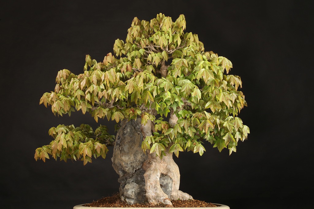 揖斐川の古石を抱いた楓石付の古盆です。既に石に付けられてから、半世紀を超える姿が、“樹石一体“の相を表しています。持ち込む中でも、石が根で覆われる事ない作出がされており、枝々の更なる充実で、中型楓の名樹となる予見が出来る逸品です。