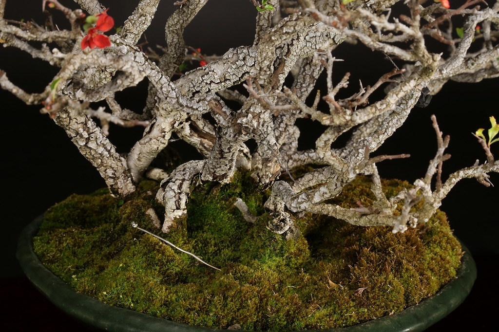 持込み古く、幹肌の老相は特筆する程です。長寿梅らしい叢立ちの姿の中にも、主木からの全体の“流れ“をしっかりと持った雅盆です。鉢映りを一考するだけで、その樹相と樹格は、格別のものになります。花性・枝性も“1号性“と呼ばれる最上質のものです。