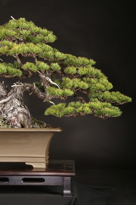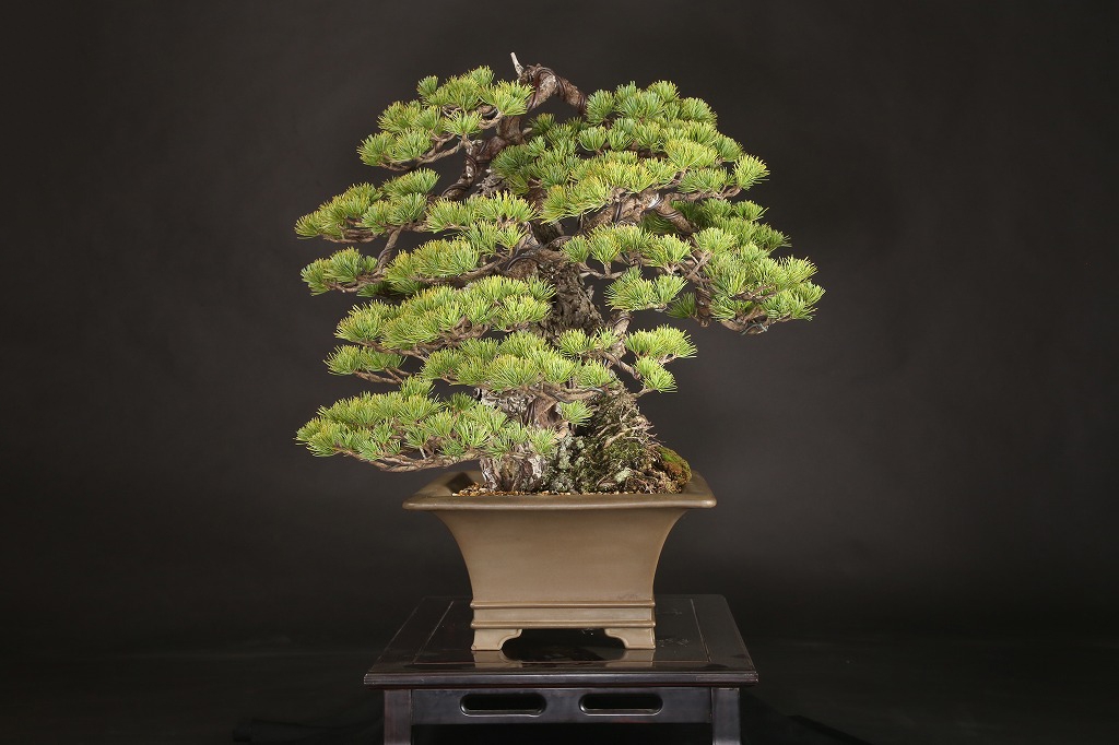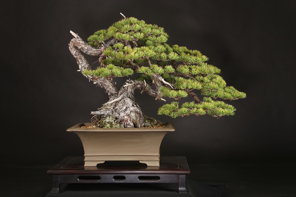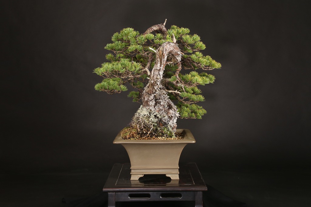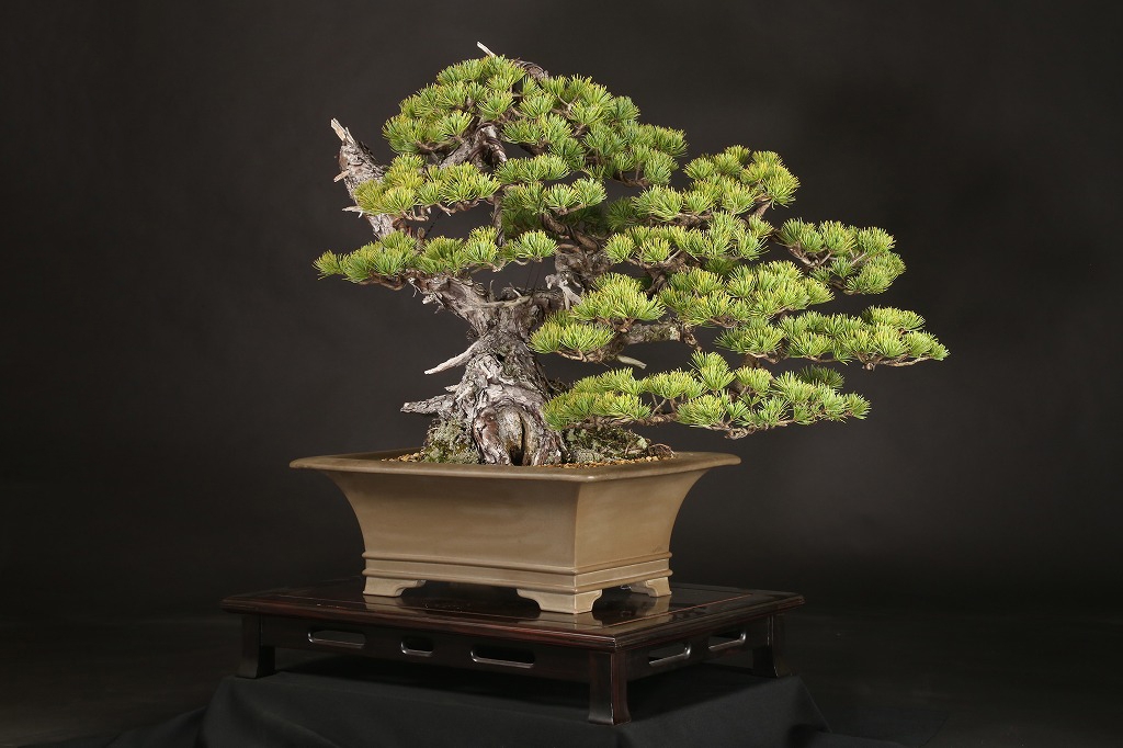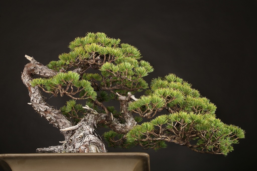 那須五葉松の葉性良い数少ない樹相を持つ山採り古盆です。天然の樹相が描き出す双龍と言える流れを持つ姿は、中型作品でありながら、大型盆栽に比肩する雅格を示しています。