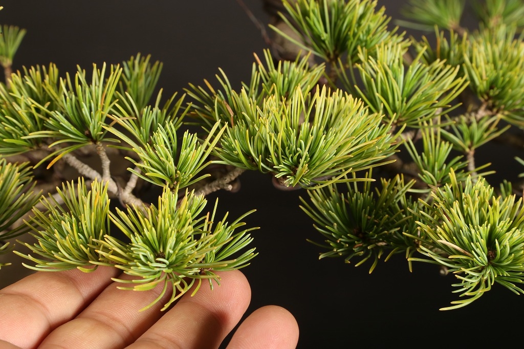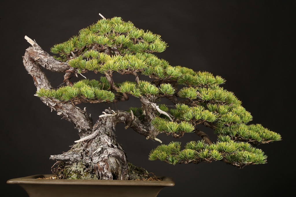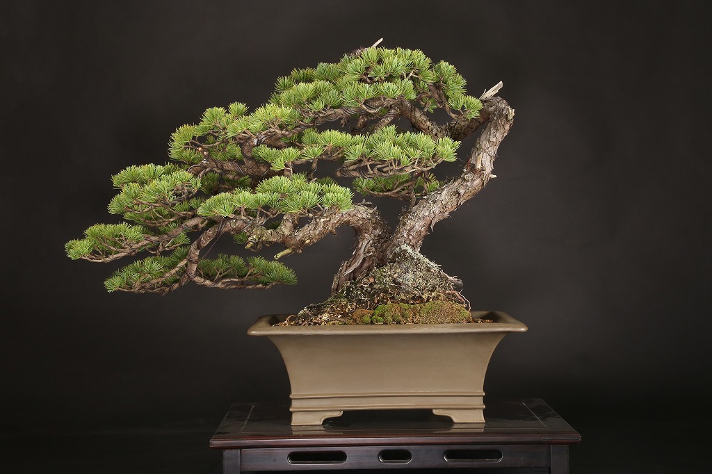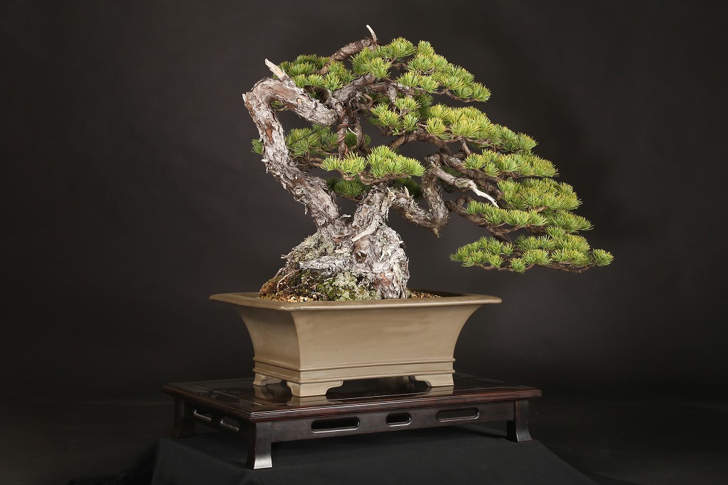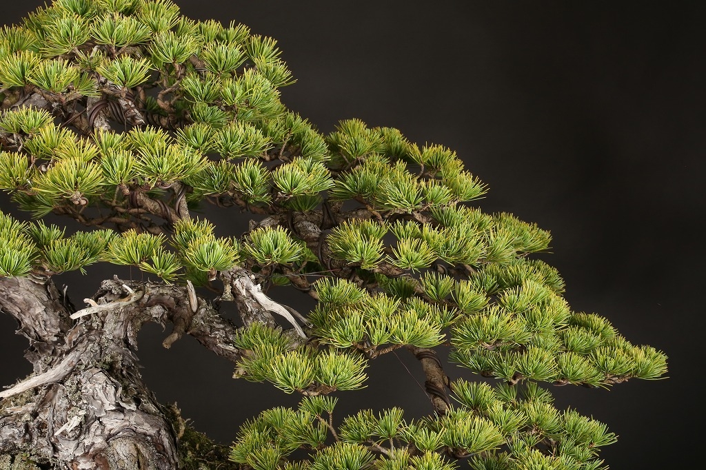 那須五葉松の葉性良い数少ない樹相を持つ山採り古盆です。天然の樹相が描き出す双龍と言える流れを持つ姿は、中型作品でありながら、大型盆栽に比肩する雅格を示しています。
